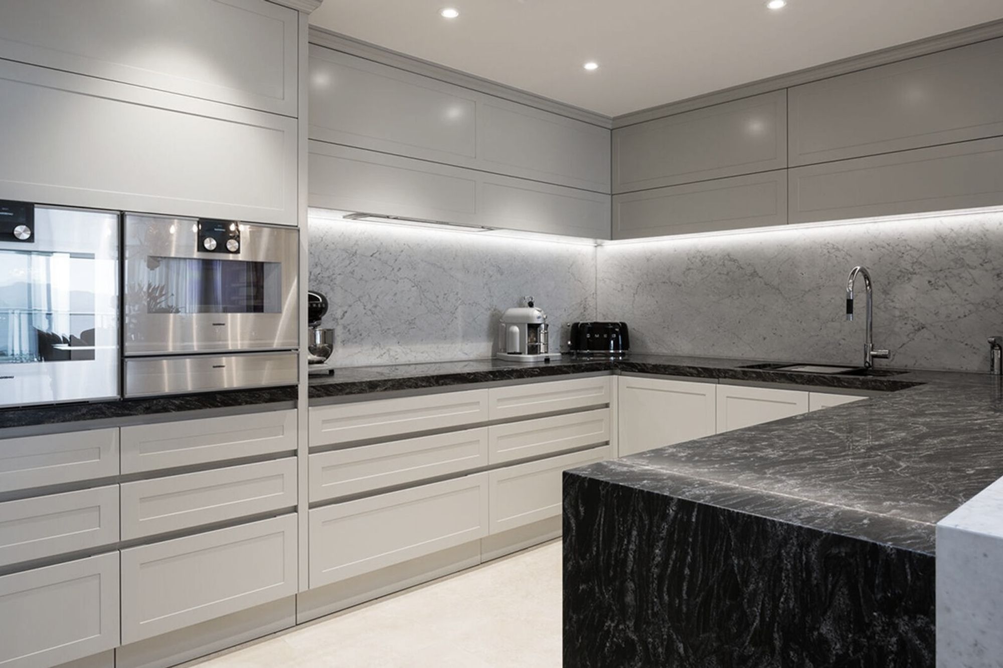ArchiPro Project Summary - Luxurious penthouse featuring panoramic views of Rangitoto Island and Takapuna Beach, designed for entertaining with a sophisticated kitchen and custom cabinetry, complemented by elegant marble finishes and American Oak details.