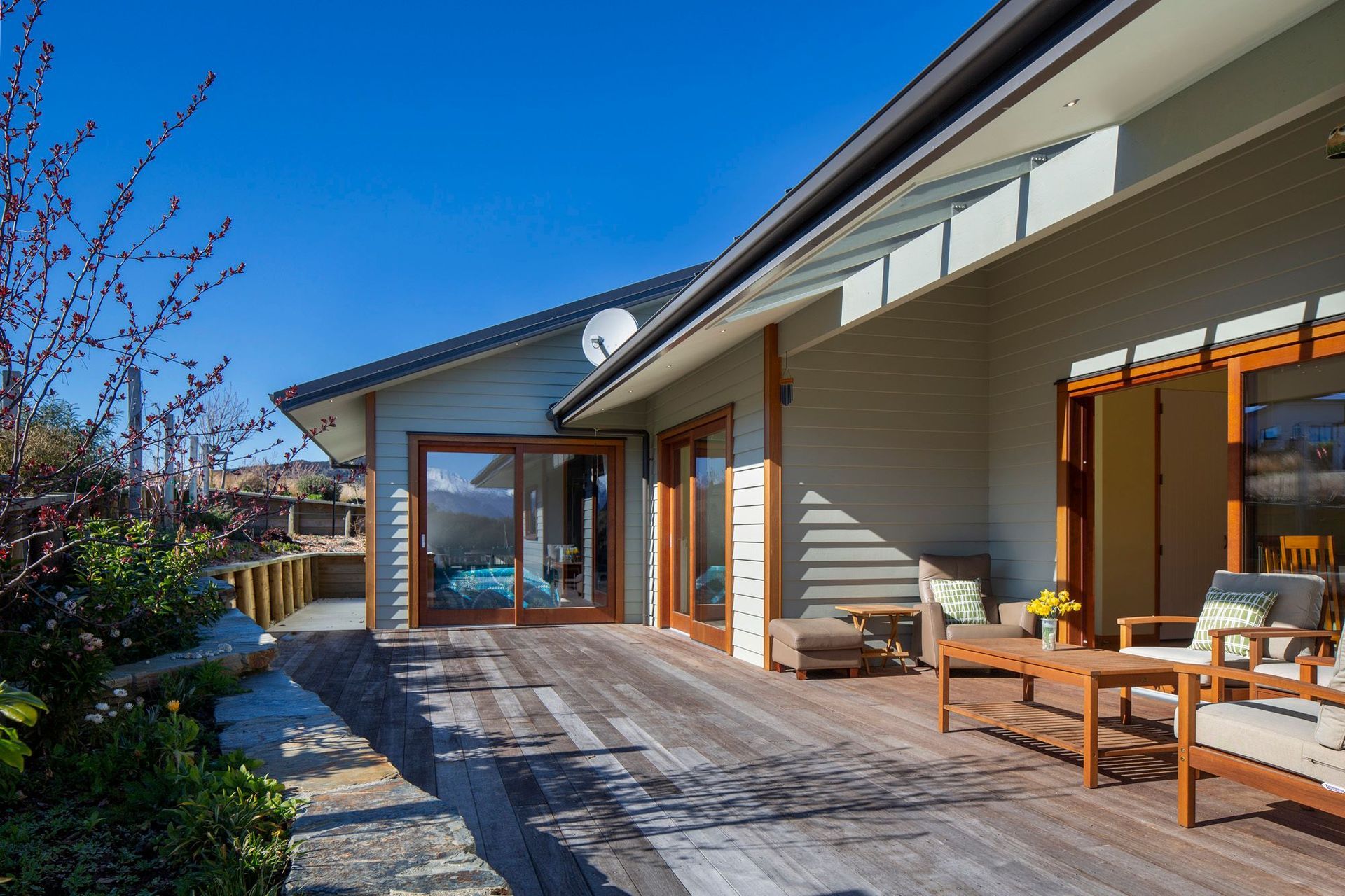 ArchiPro Project Summary - A high-performance home featuring a MAXRaft insulated slab, SIP panel walls, and sustainable materials, complemented by elegant landscaping including schist retaining walls and kwila decking.