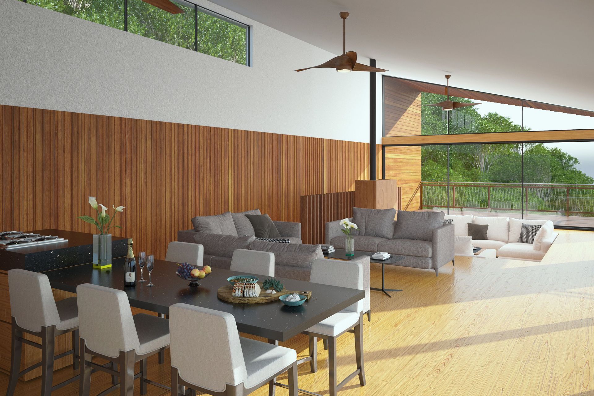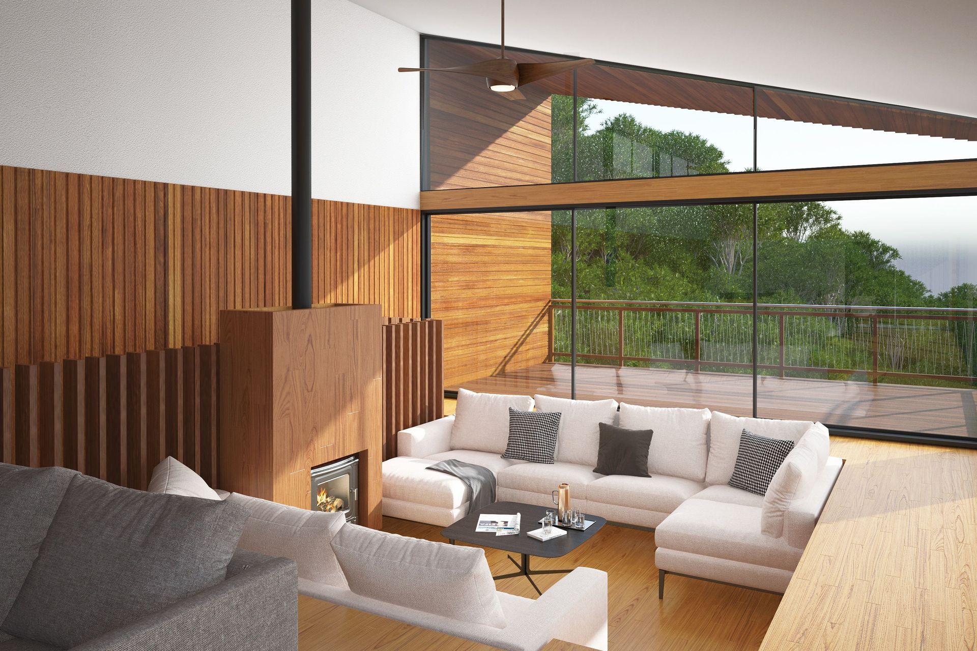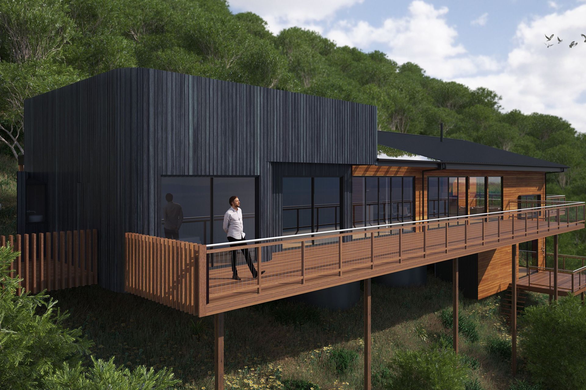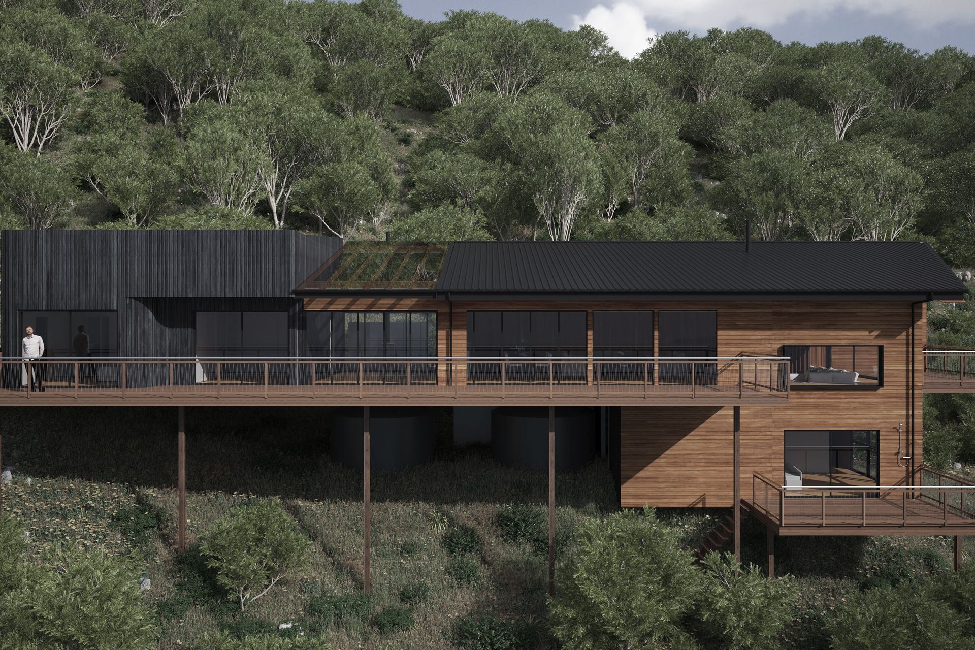 ArchiPro Project Summary - A collection of 3D renders for a residential building nestled on a hillside in Piha, Auckland, surrounded by lush tea trees.