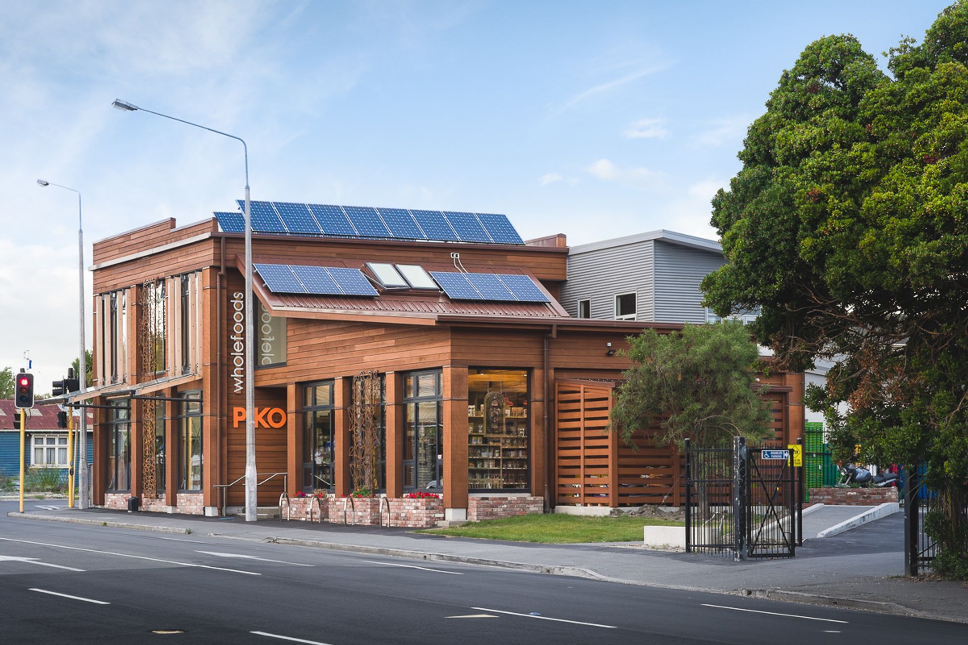 ArchiPro Project Summary - PIKO Wholefoods: A Passive Solar Commercial project enhanced by a 5kW solar PV array, supplying approximately one-third of the building's energy requirements.