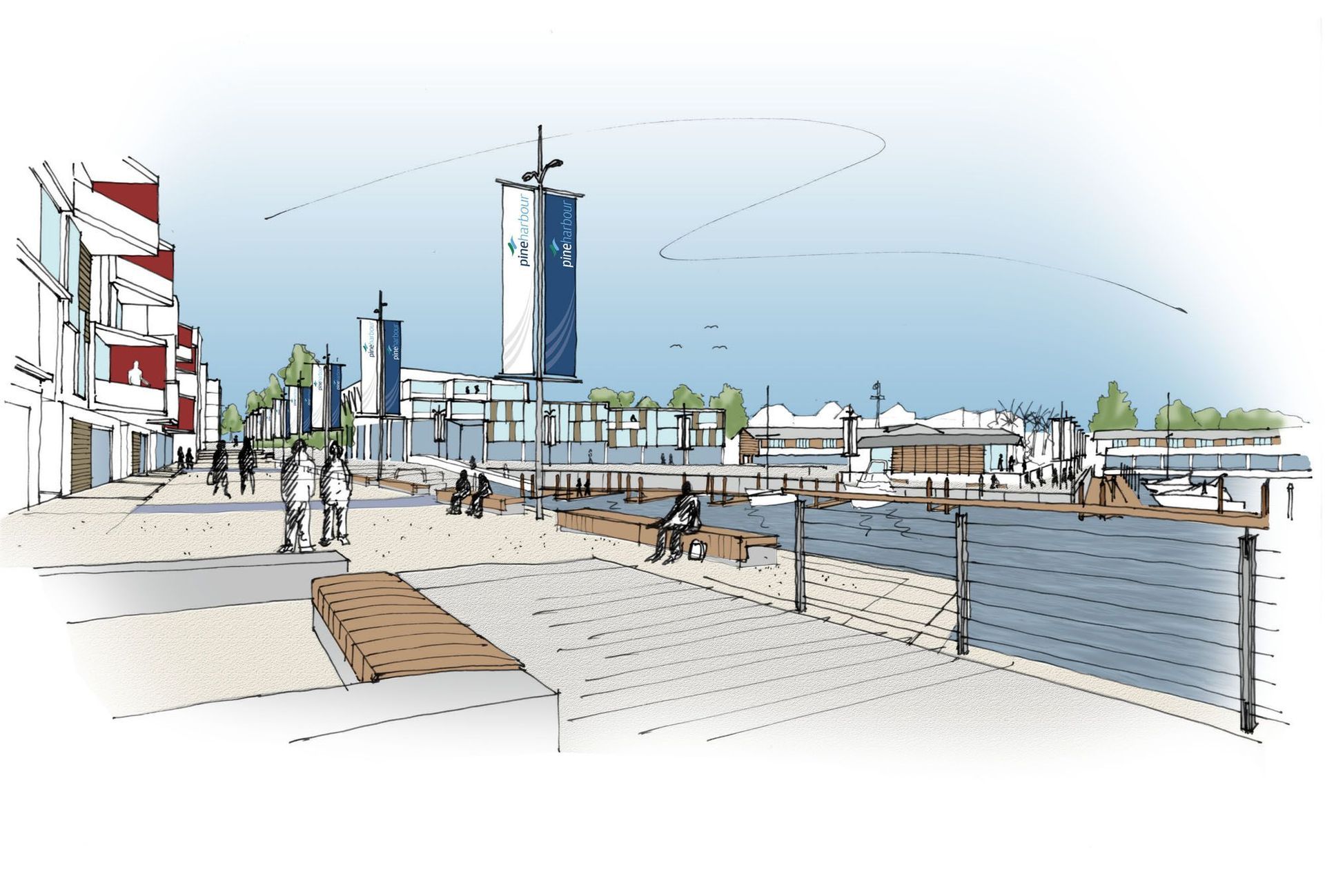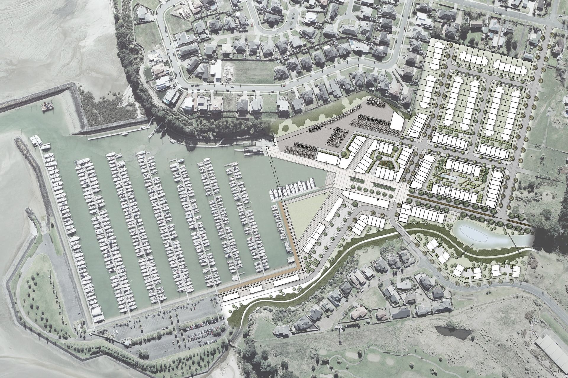 ArchiPro Project Summary - Comprehensive transit-oriented development at Pine Harbour, featuring a 600-berth marina, mixed-use commercial and residential spaces, and waterfront access, designed to enhance connectivity with Auckland city.