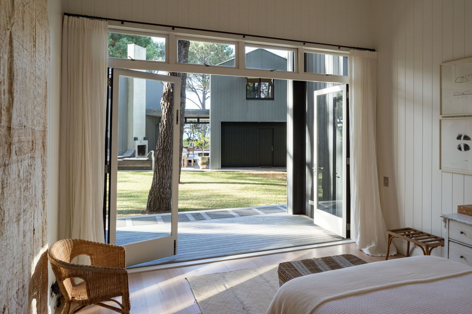 ArchiPro Project Summary - A harmonious blend of zinc-clad structures nestled among pine trees, featuring a main living space, sleep-out, and guest cottage, all designed to capture stunning views of Matarangi’s surf beach and surrounding nature.