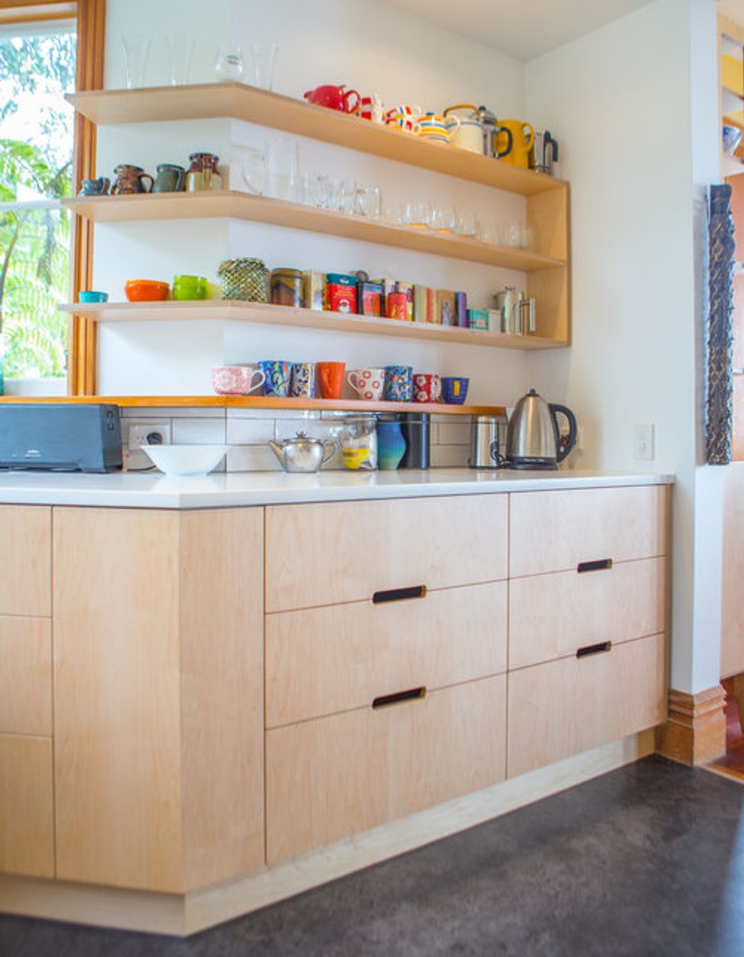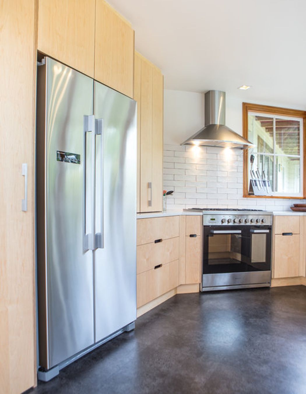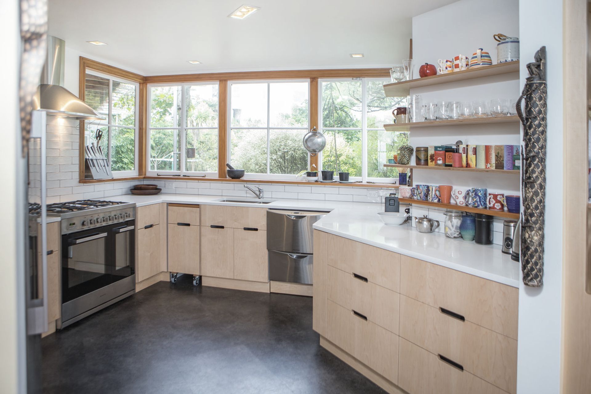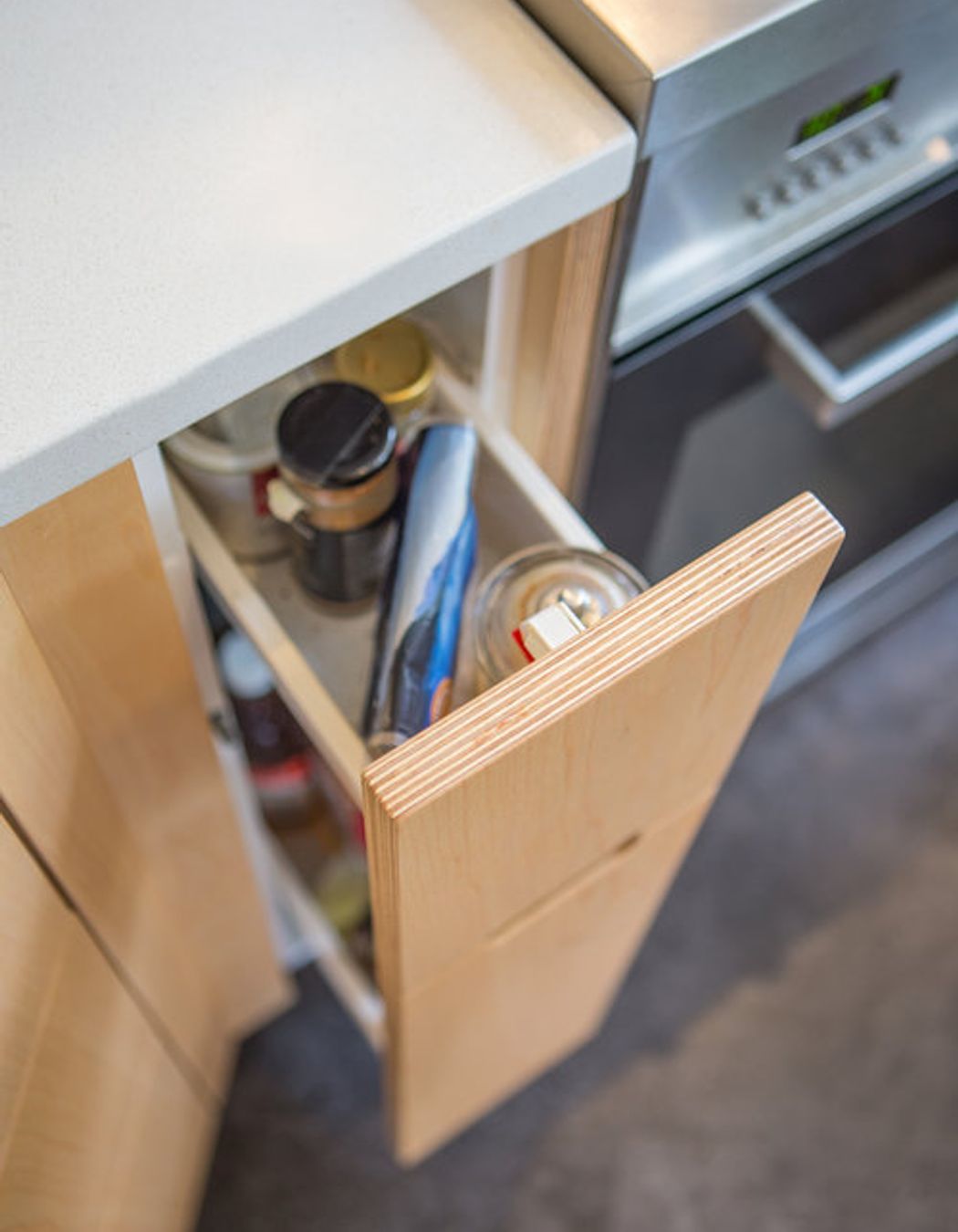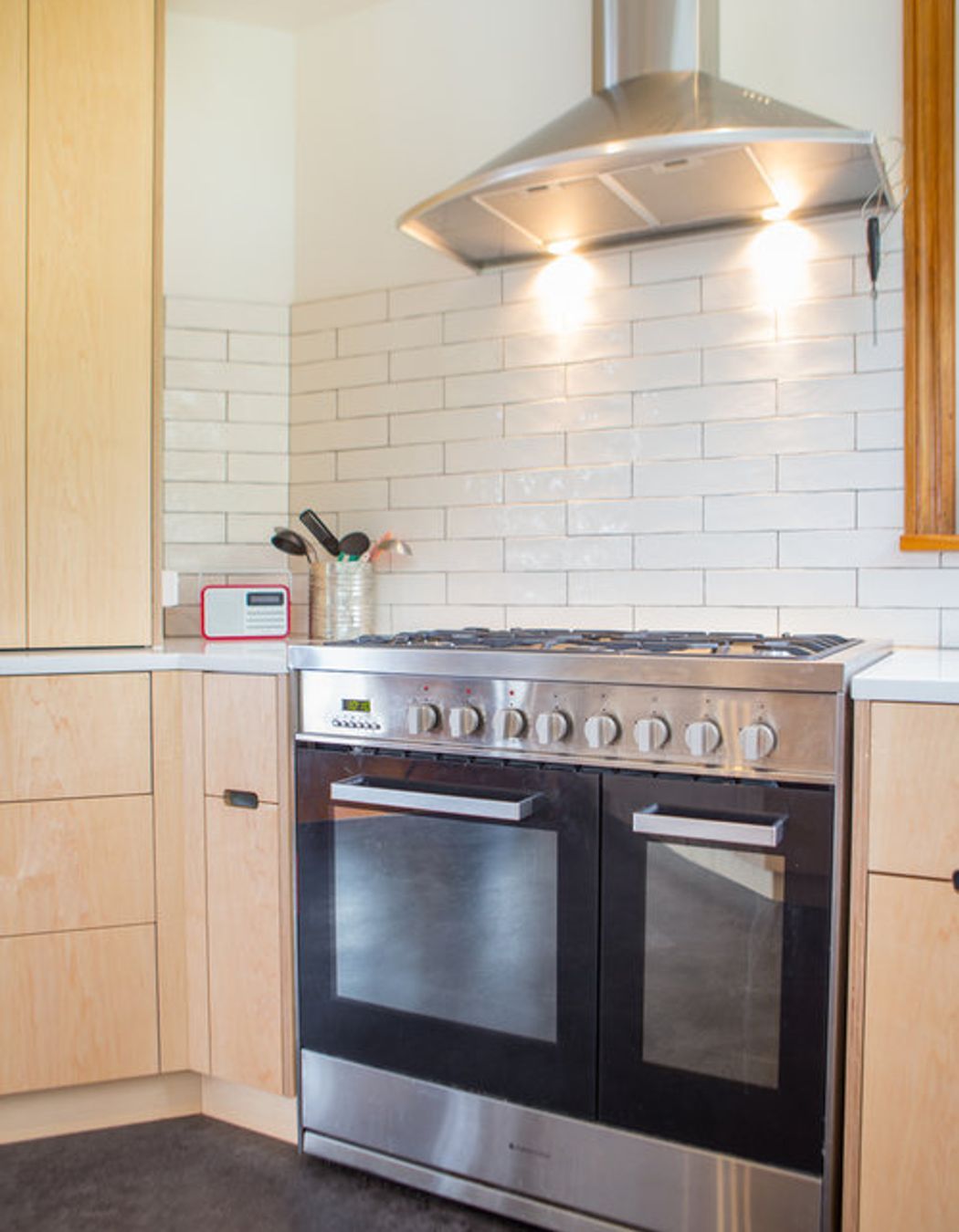 ArchiPro Project Summary - A kitchen renovation featuring warm Maple Veneer on Birch Ply, enhancing storage solutions with drawers and maximizing space beneath the bench, complemented by the addition of a large freestanding oven.
