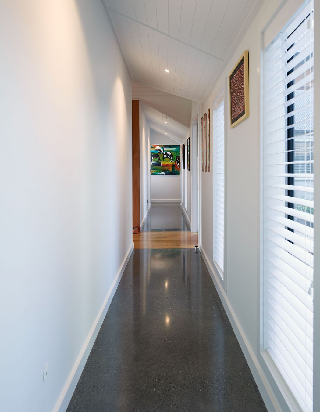 ArchiPro Project Summary - A harmonious blend of texture and design, featuring a central breezeway, art-lined gallery, and distinct living and private spaces for family comfort.