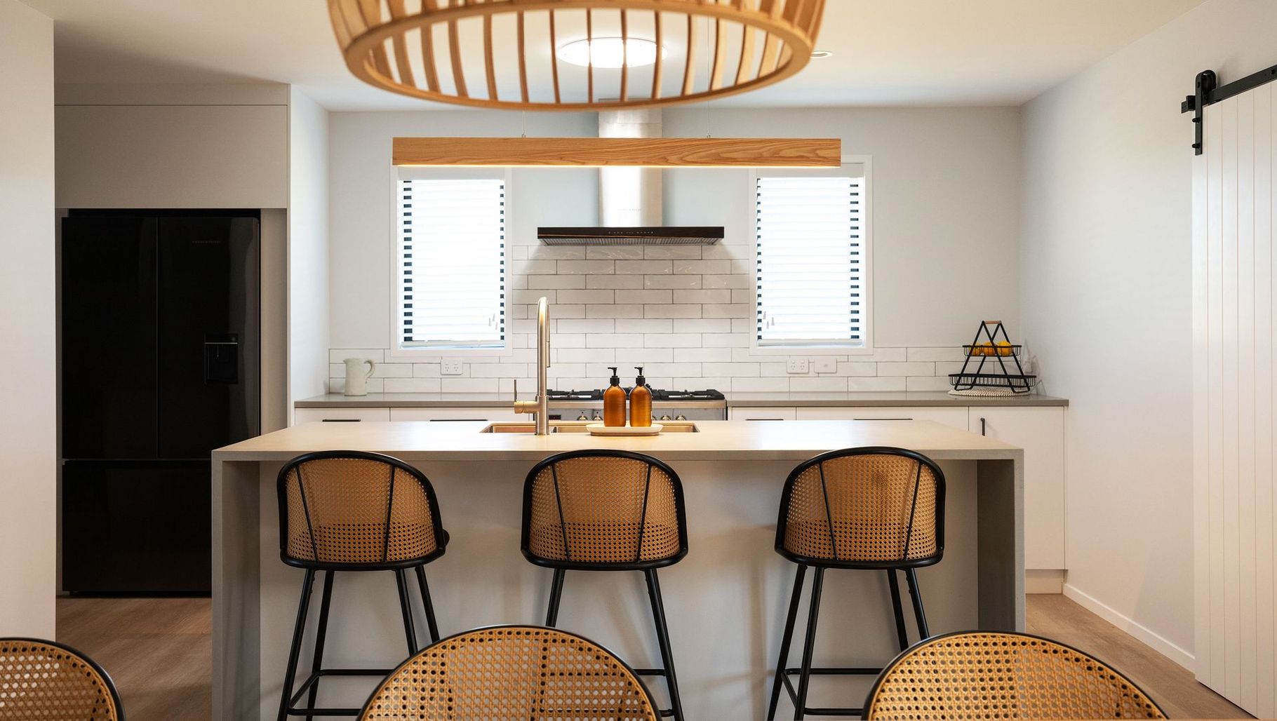 ArchiPro Project Summary - A modern kitchen featuring stunning waterfall-end bench tops and a spacious scullery, designed for both beauty and functionality, completed in 2024 by Natural Edge.