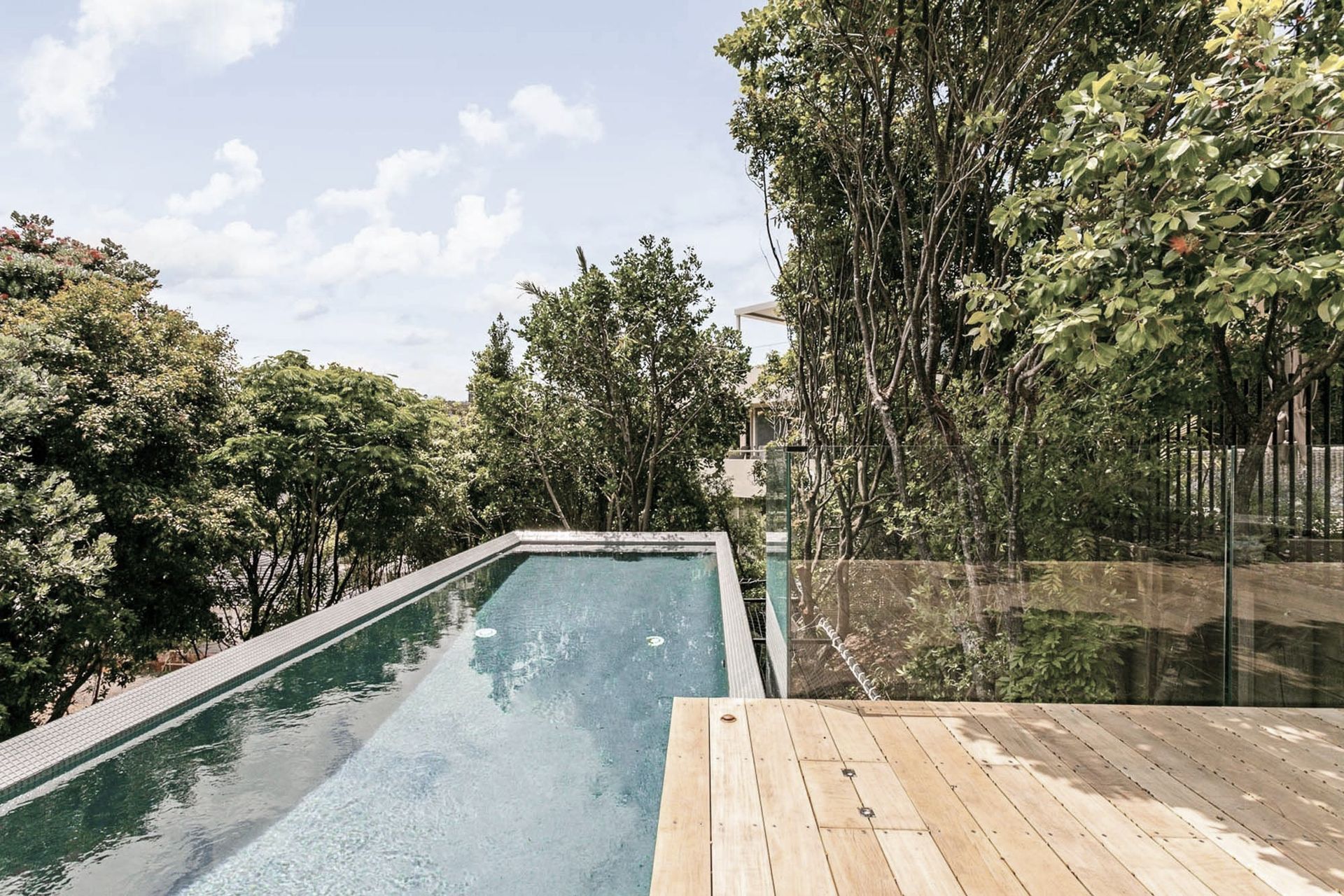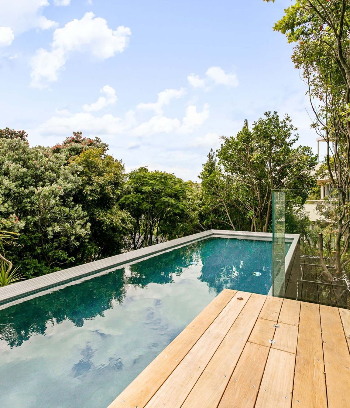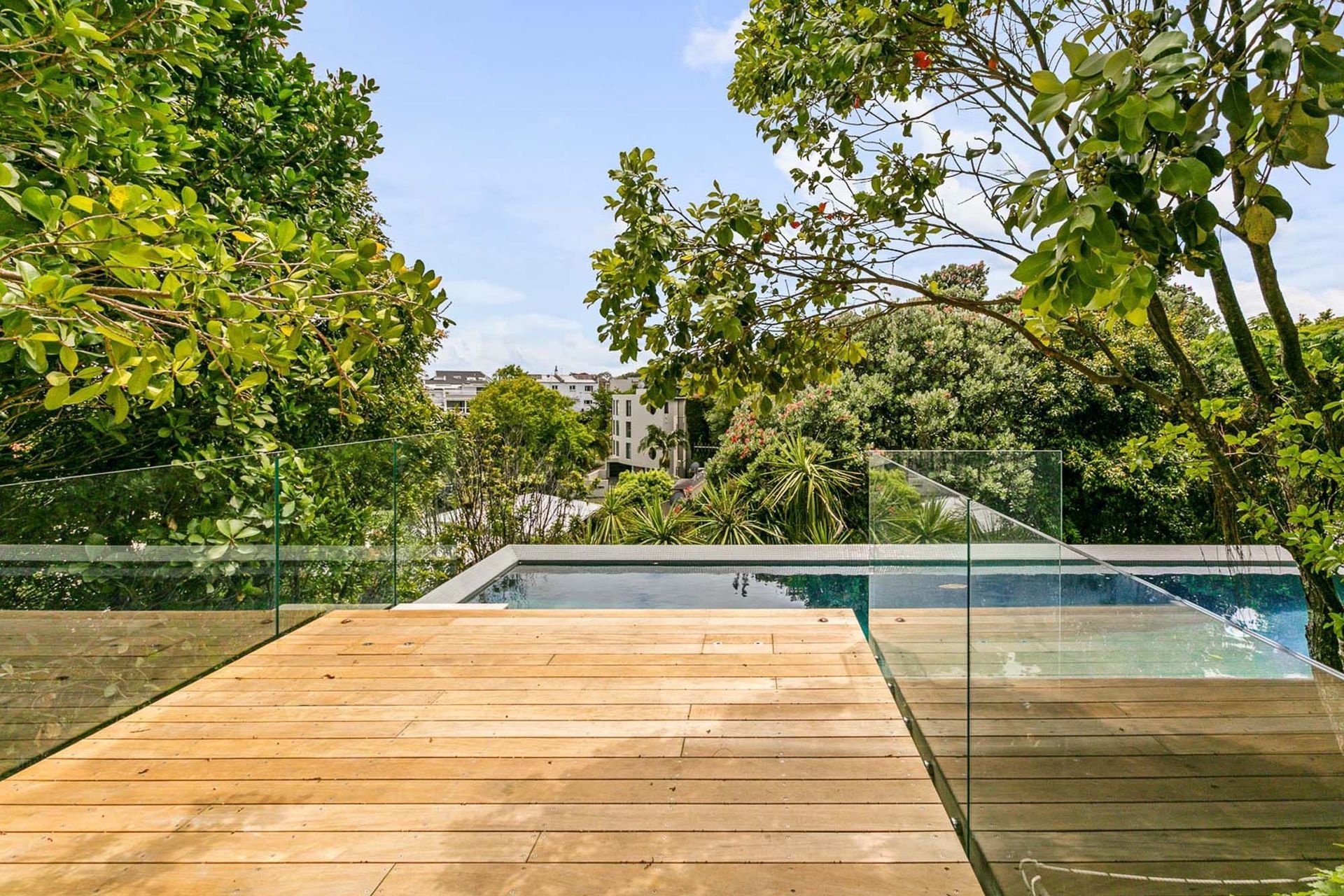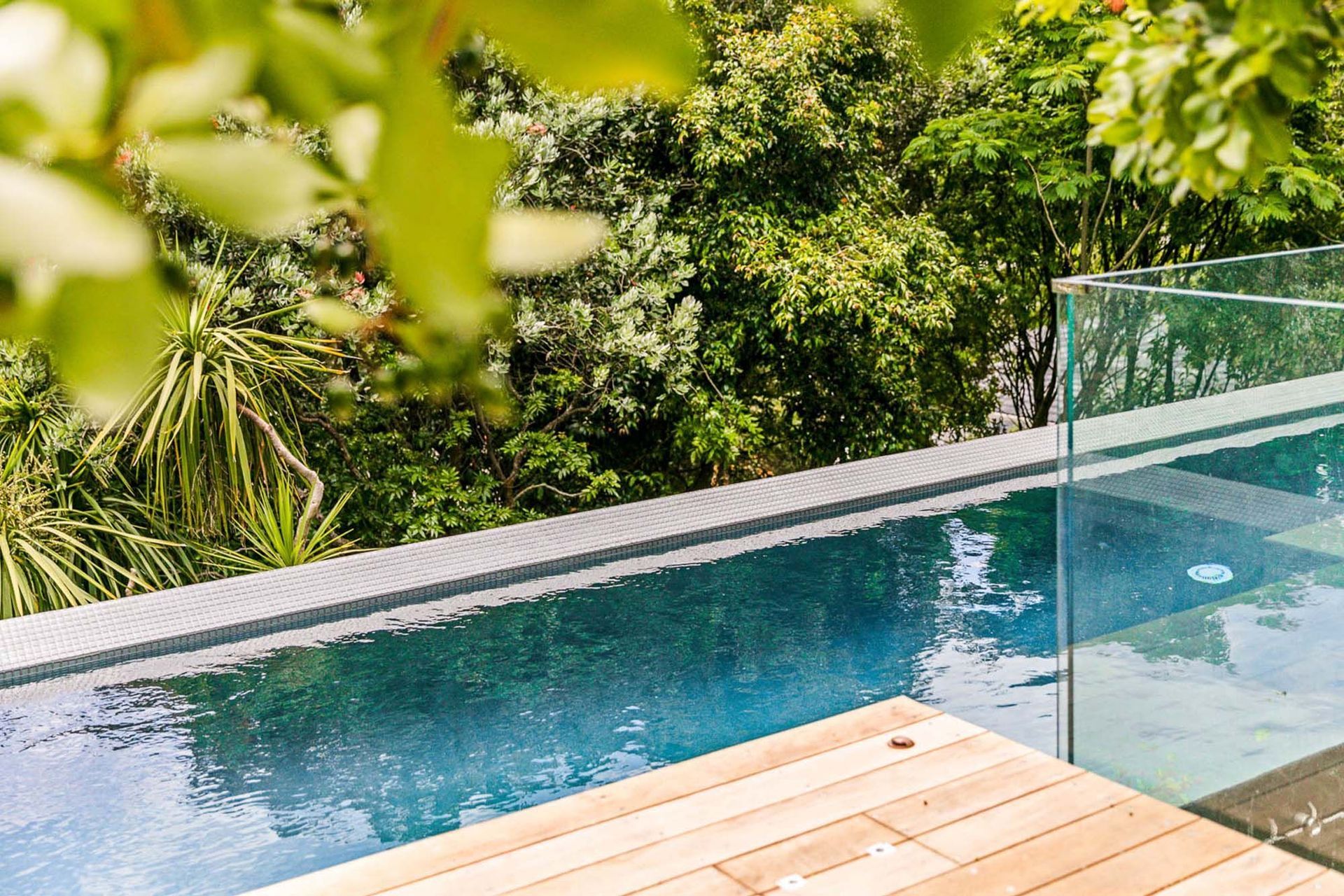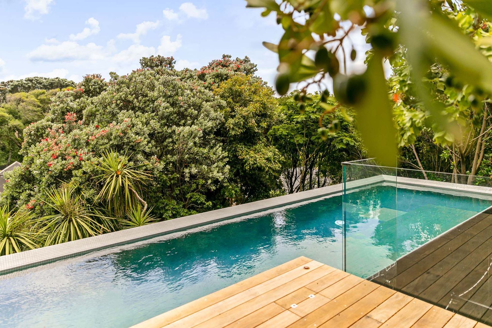 ArchiPro Project Summary - Innovative lap pool construction on a challenging slope, featuring hardwood decking and stunning Auckland harbour views, designed with careful planning and engineering to ensure safety and aesthetic appeal.