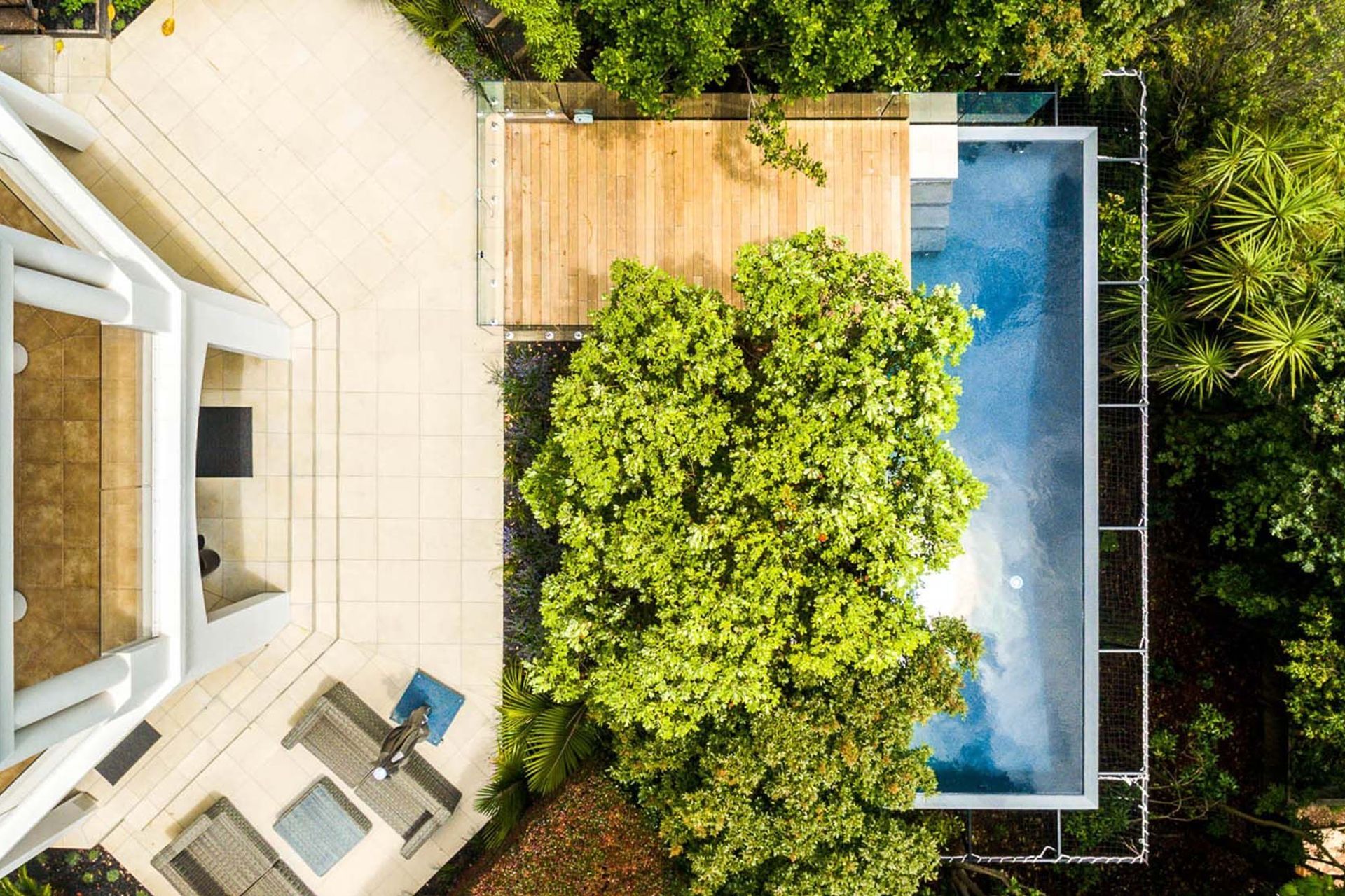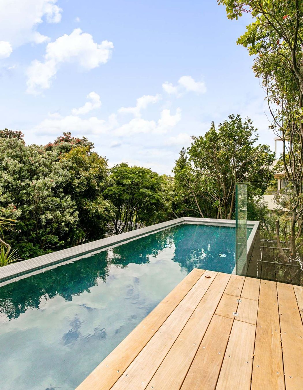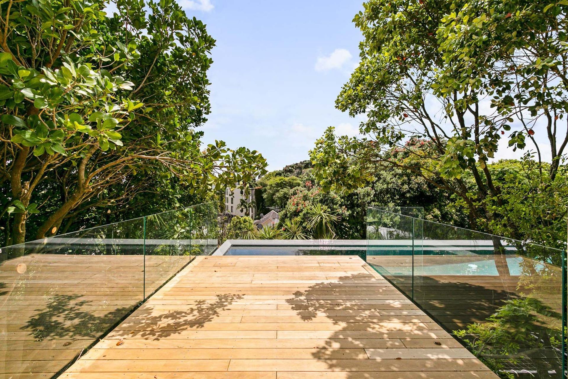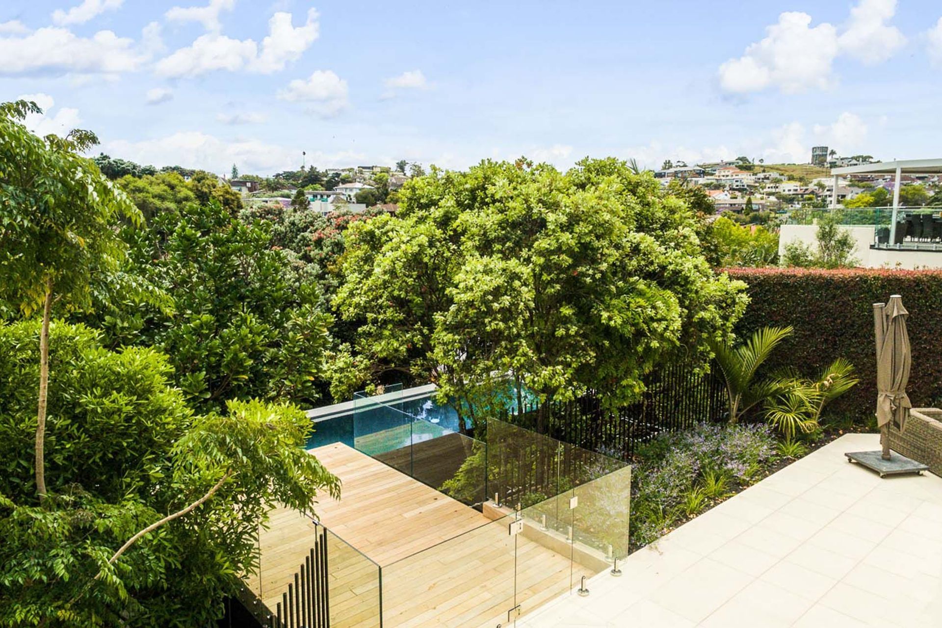 ArchiPro Project Summary - Innovative lap pool construction on a challenging slope, featuring hardwood decking and stunning Auckland harbour views, designed with careful planning and engineering to ensure safety and aesthetic appeal.