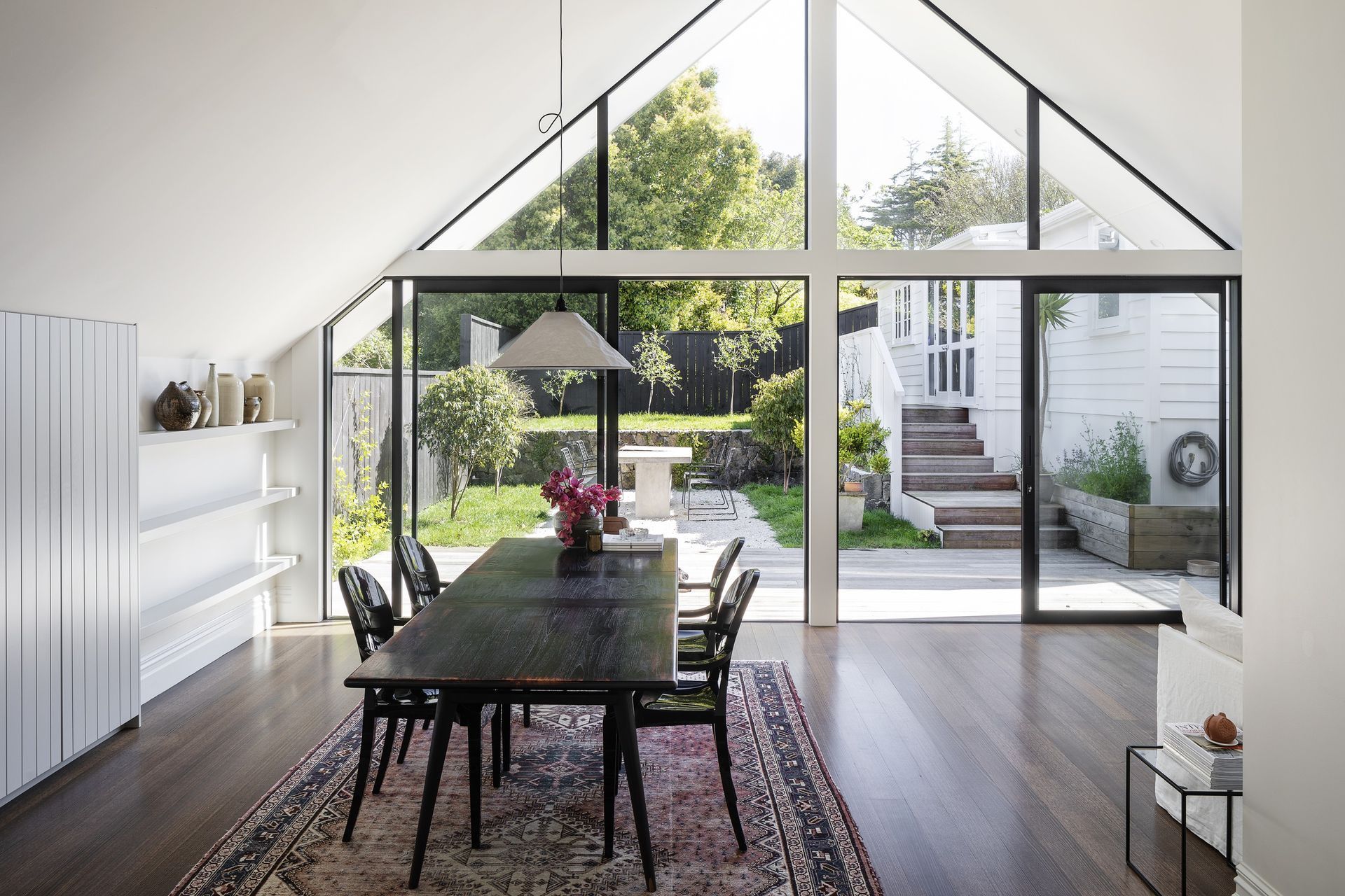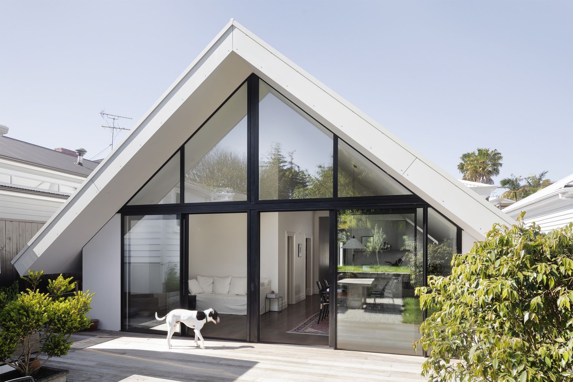 ArchiPro Project Summary - A striking gabled roof supported by a steel post enhances the existing home, creating a series of airy spaces that open up to a sunlit courtyard.