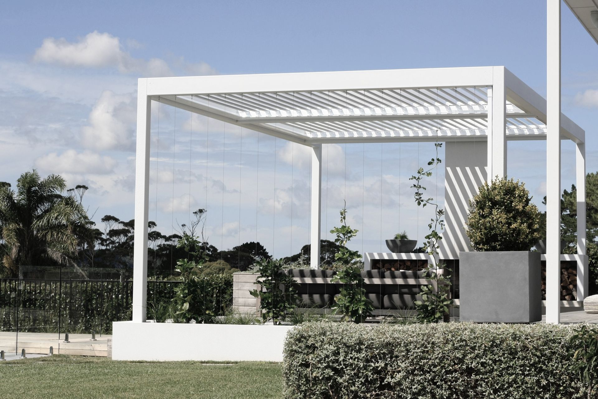 ArchiPro Project Summary - A minimalist pool and pavilion design that enhances outdoor living, featuring a standalone structure that provides shade for a BBQ area while seamlessly integrating with the existing landscape.