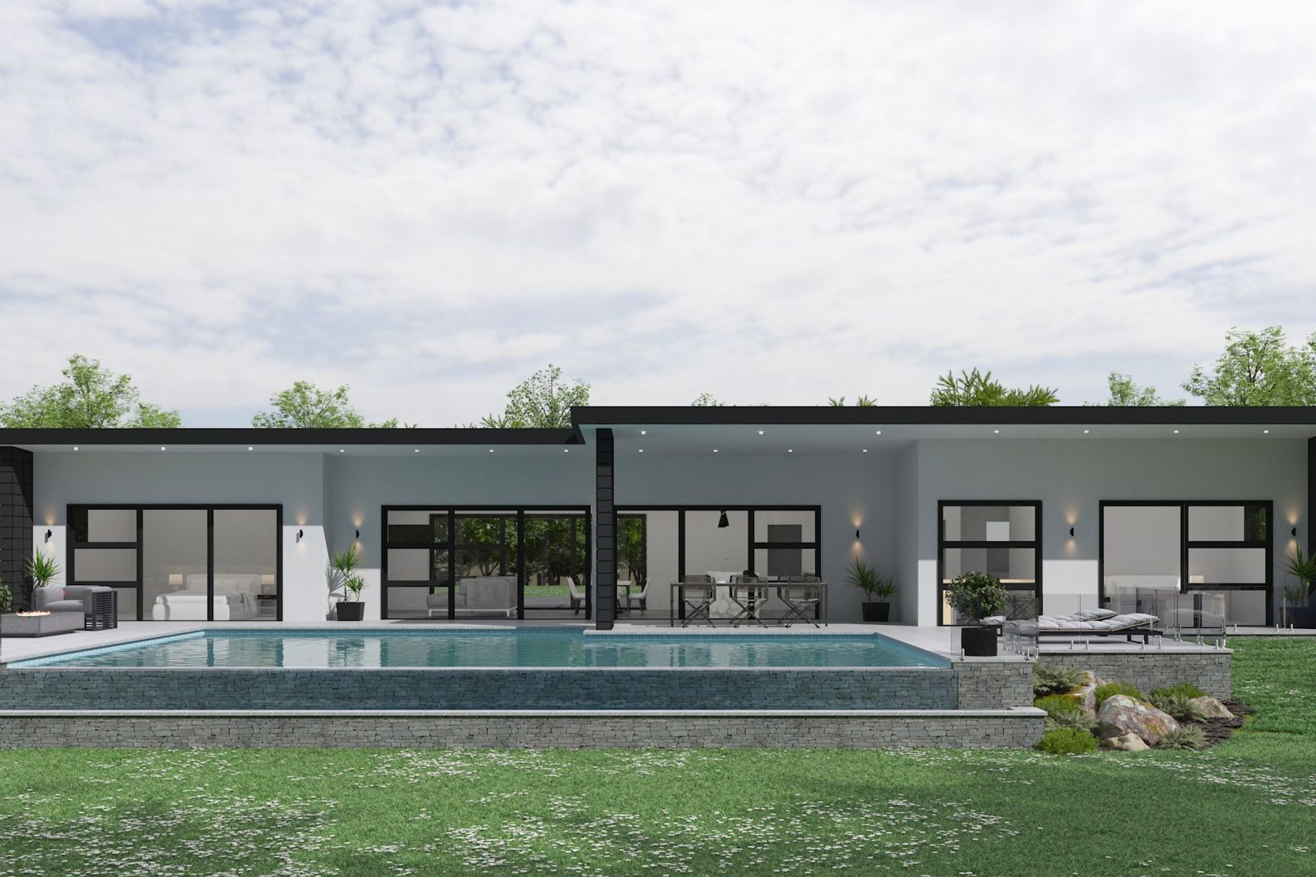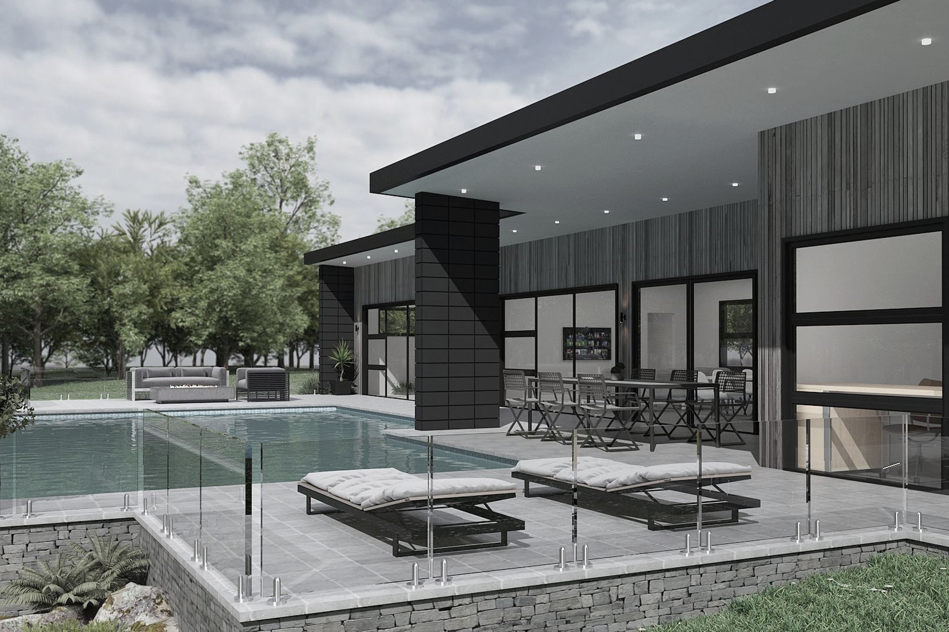 ArchiPro Project Summary - Elegant Pool House featuring diverse cladding styles and a stunning infinity swimming pool, complemented by spacious outdoor entertainment areas.