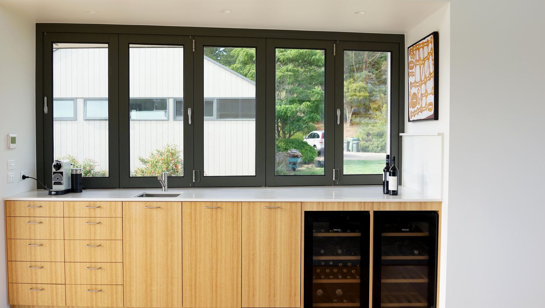 ArchiPro Project Summary - Bespoke cabinetry enhances the functionality and aesthetic appeal of a newly built pool house in Flinders, featuring a stylish kitchenette, integrated storage bench seat, and sophisticated vanity, all meticulously crafted for elegance and practicality.