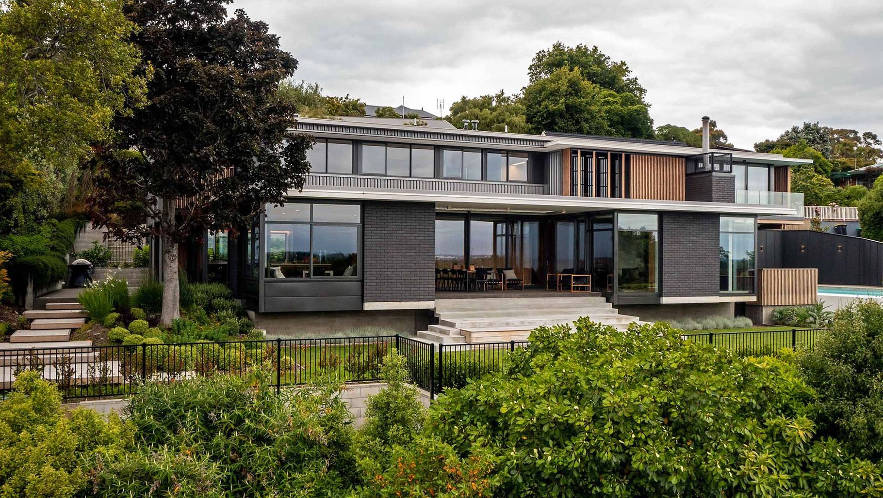 ArchiPro Project Summary - A contemporary four-bedroom family home in Christchurch's Port Hills, inspired by its 1960s predecessor, featuring a dark brick base, metal-clad upper floor, and warm interior elements crafted from recycled materials.