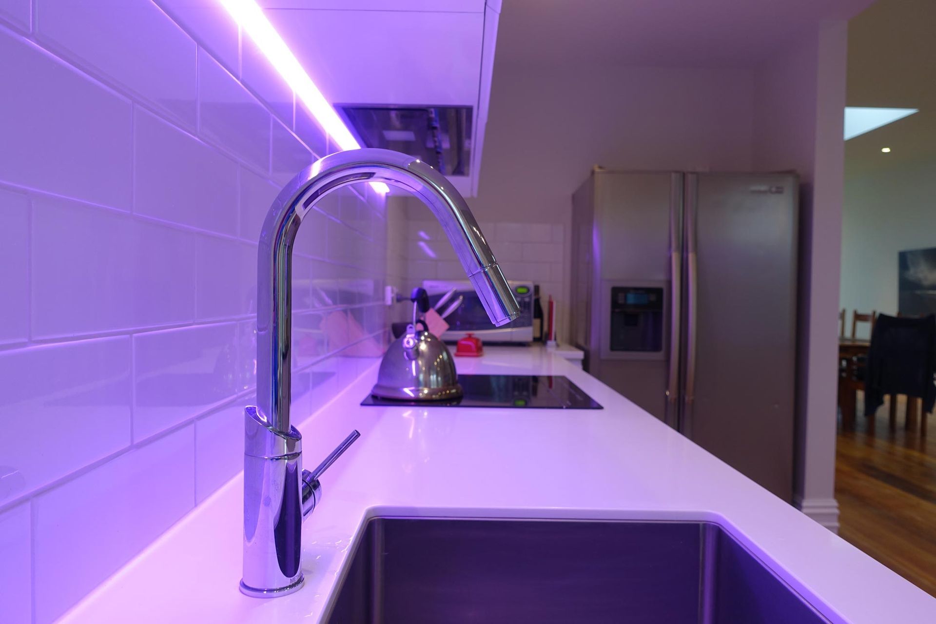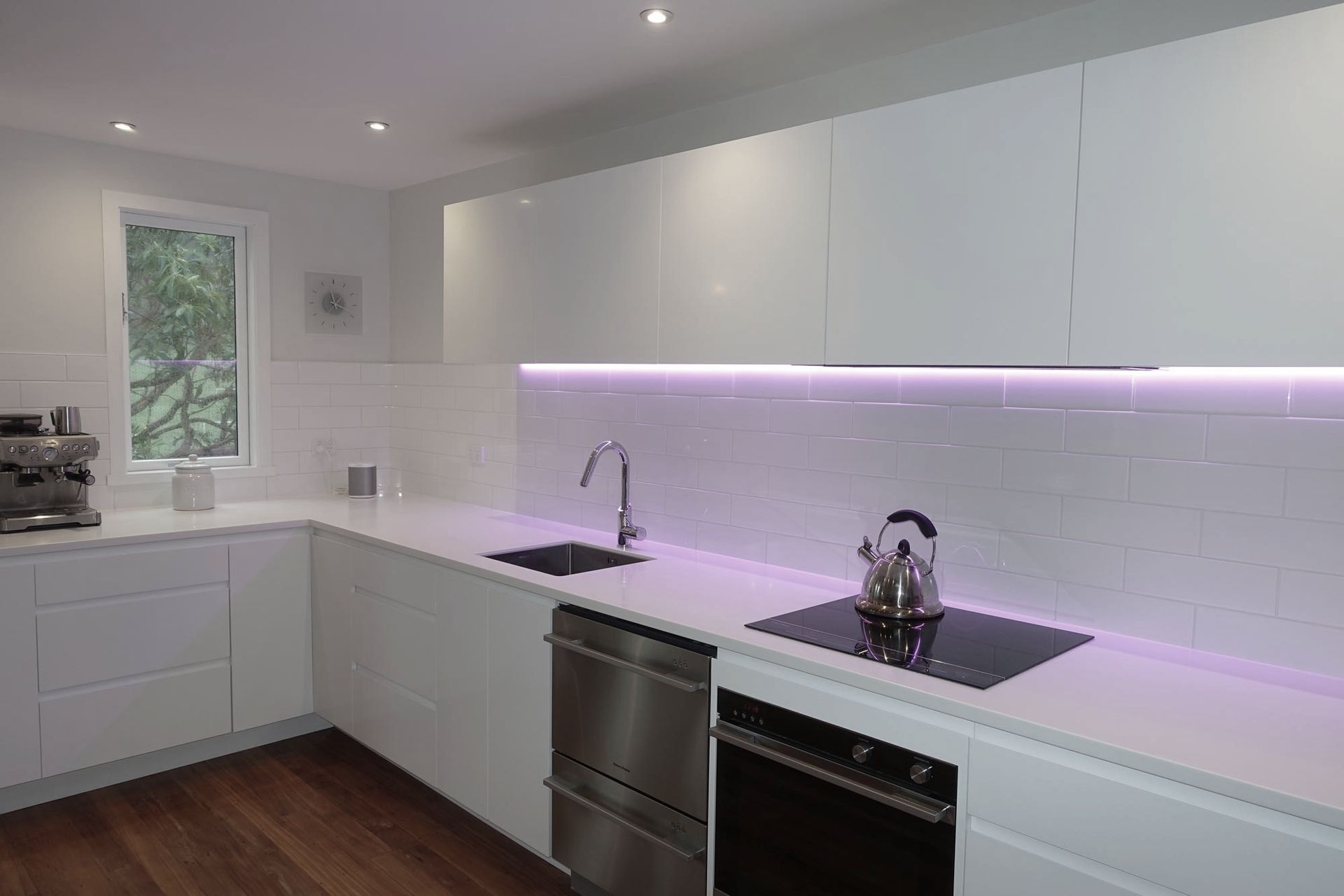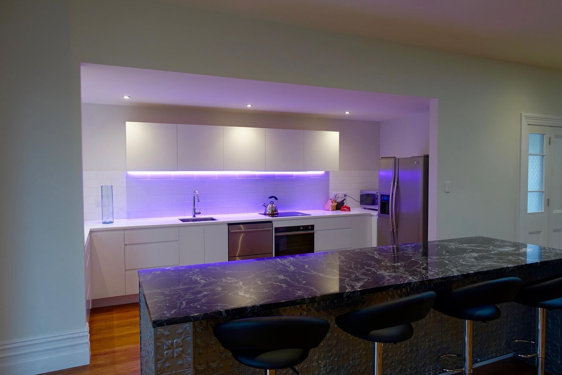 ArchiPro Project Summary - Elegant kitchen featuring TriStone and granite bench tops, complemented by painted joinery and innovative colour-changing over-bench lighting.