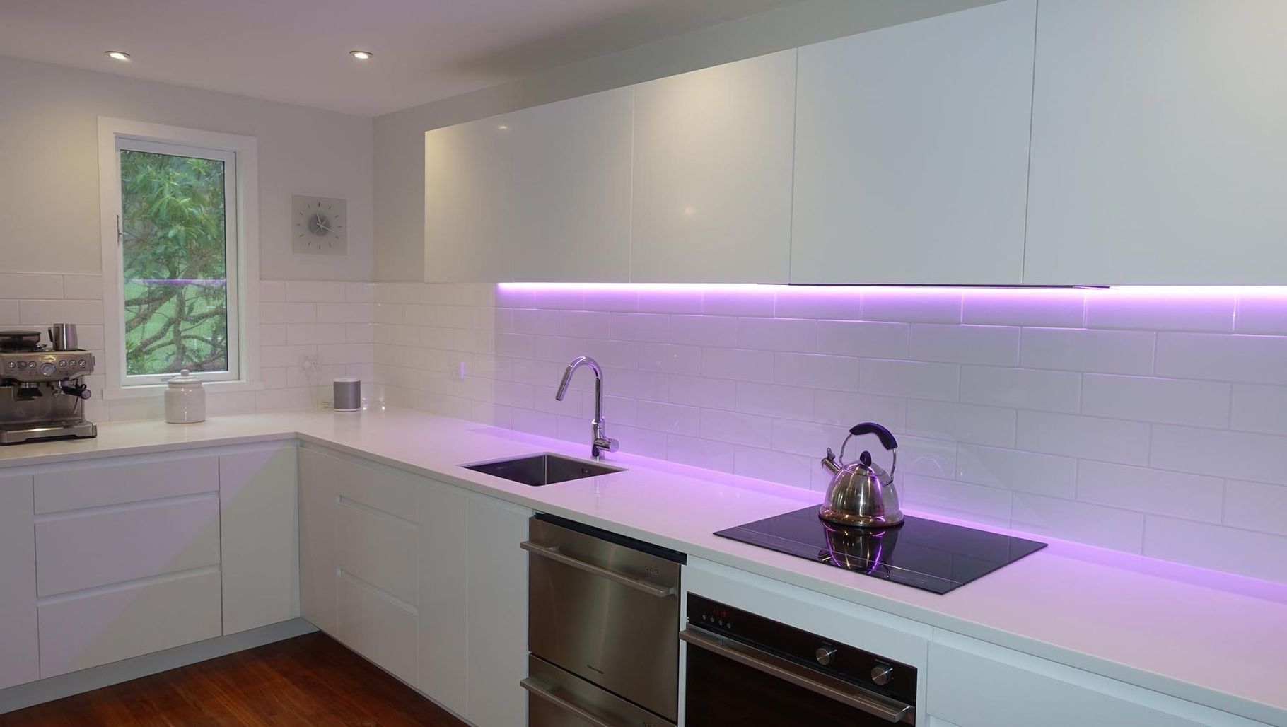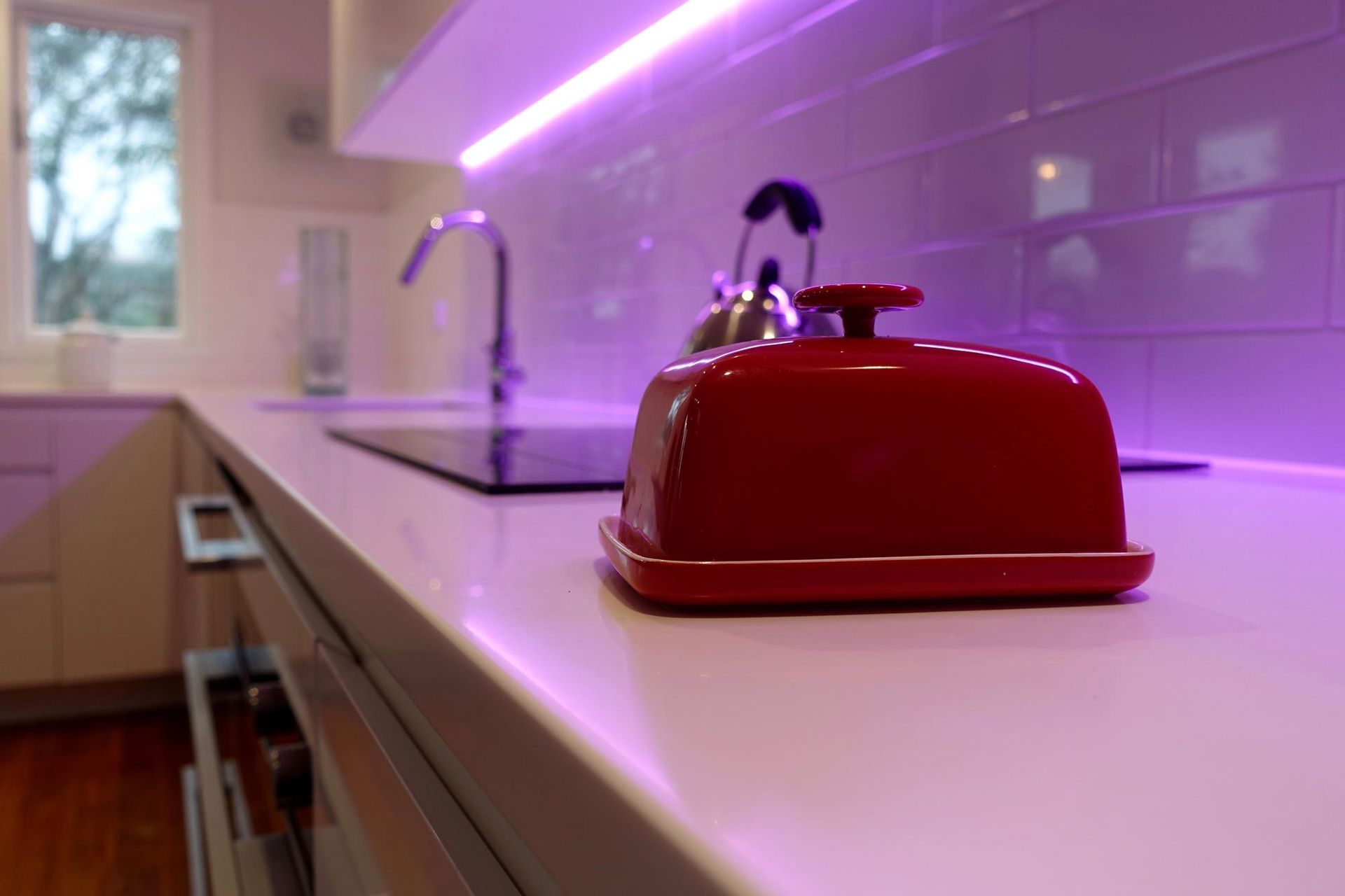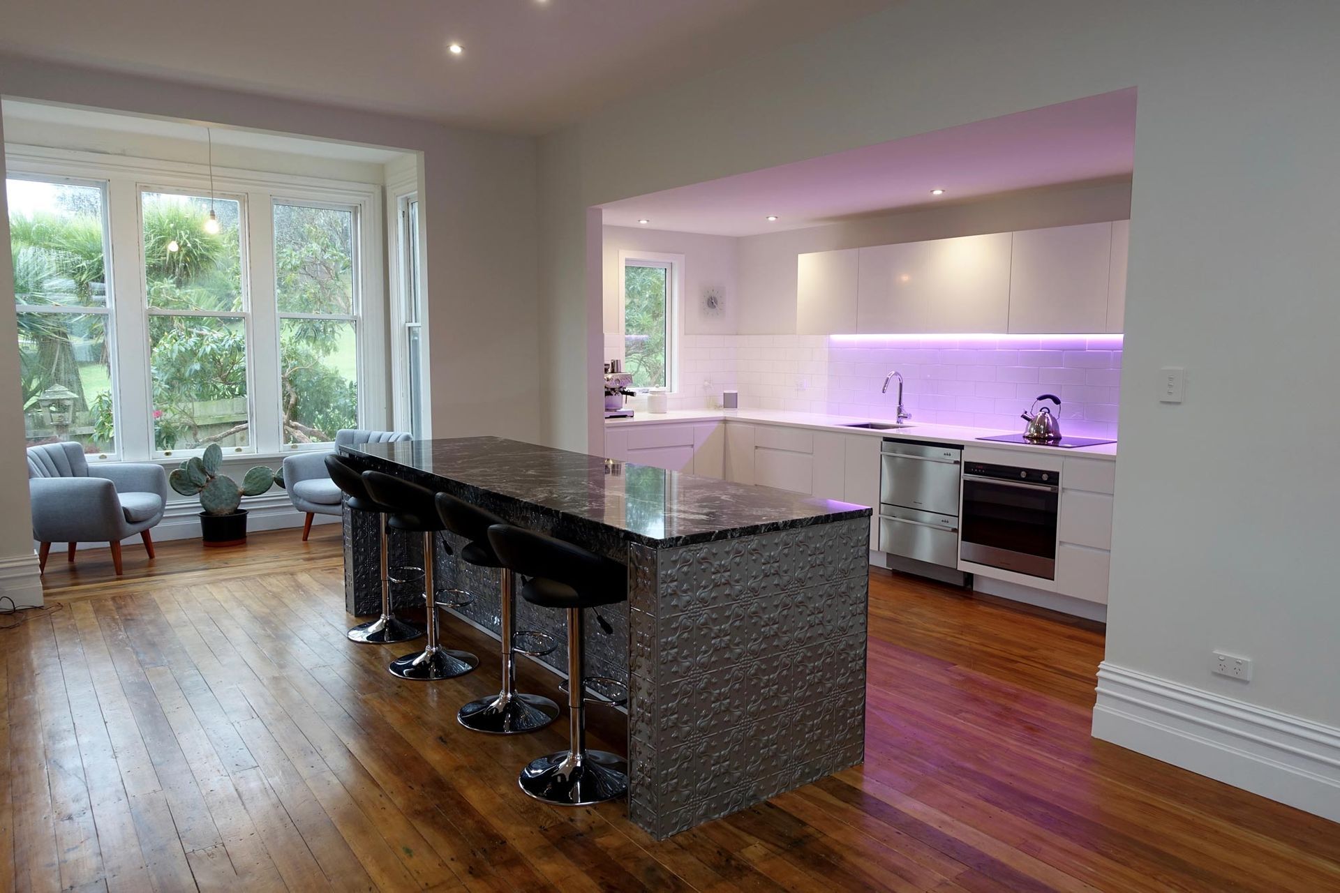 ArchiPro Project Summary - Elegant kitchen featuring TriStone and granite bench tops, complemented by painted joinery and innovative colour-changing over-bench lighting.