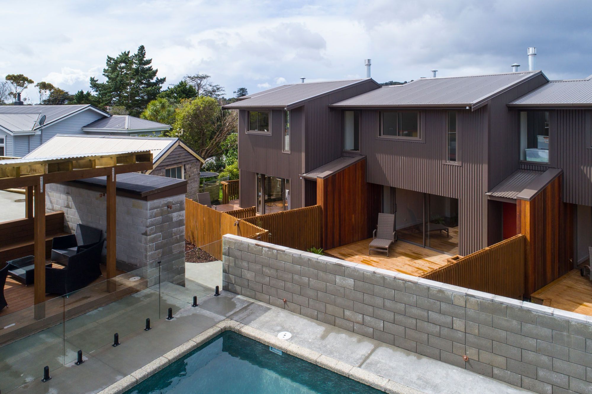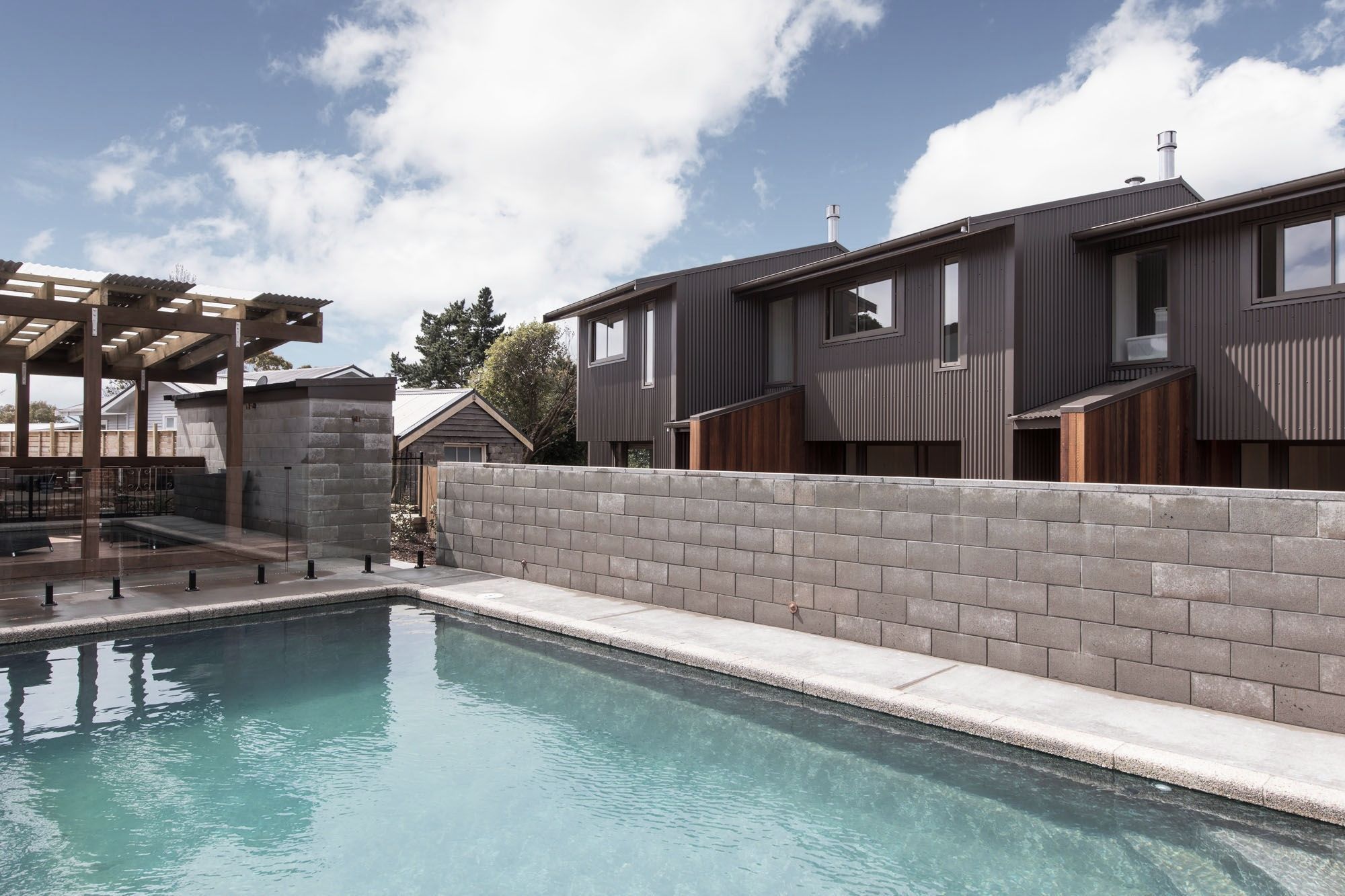 ArchiPro Project Summary - Powell Terrace Townhouses showcase modern design with composite materials, featuring a swimming pool and water feature in a vibrant residential area.