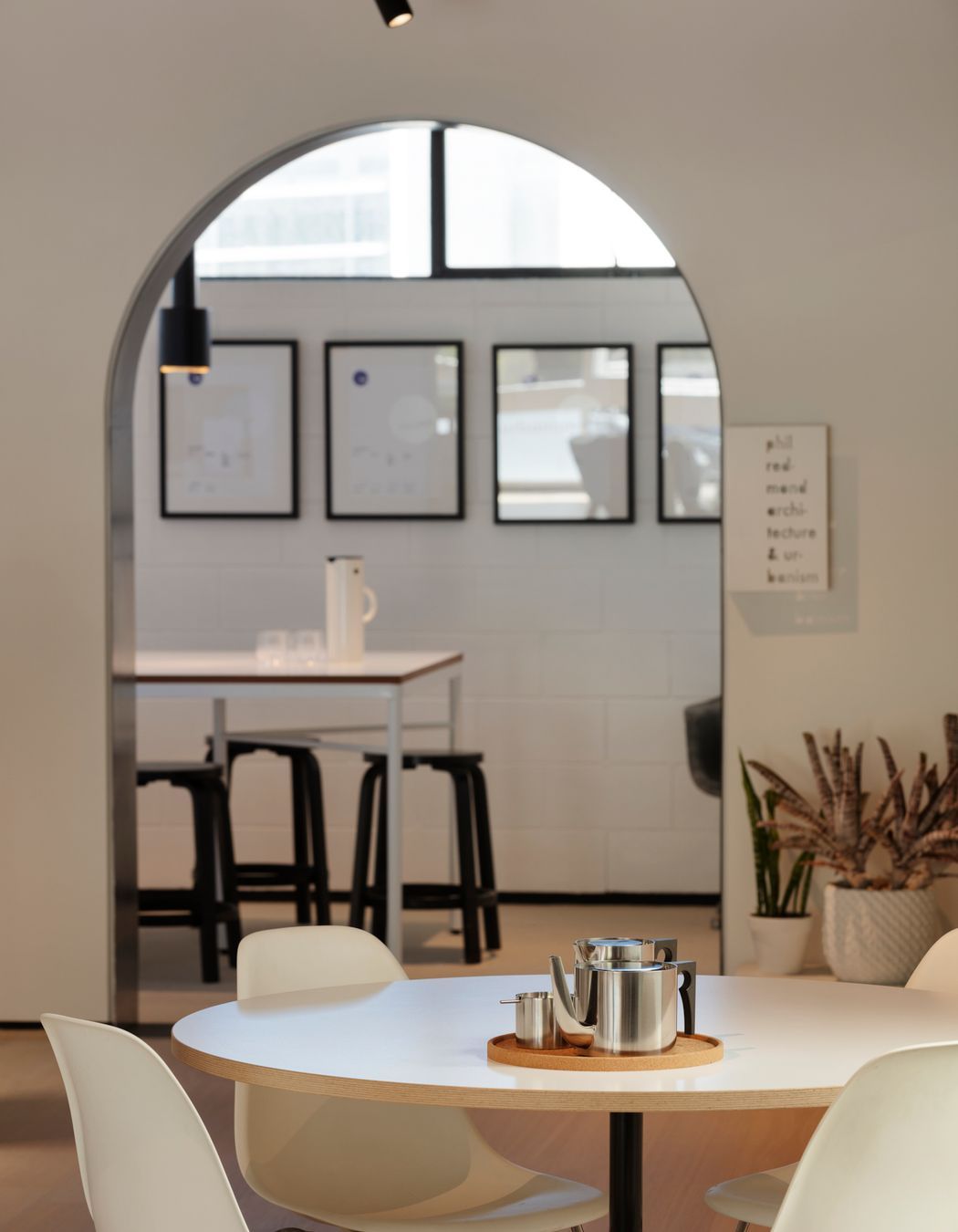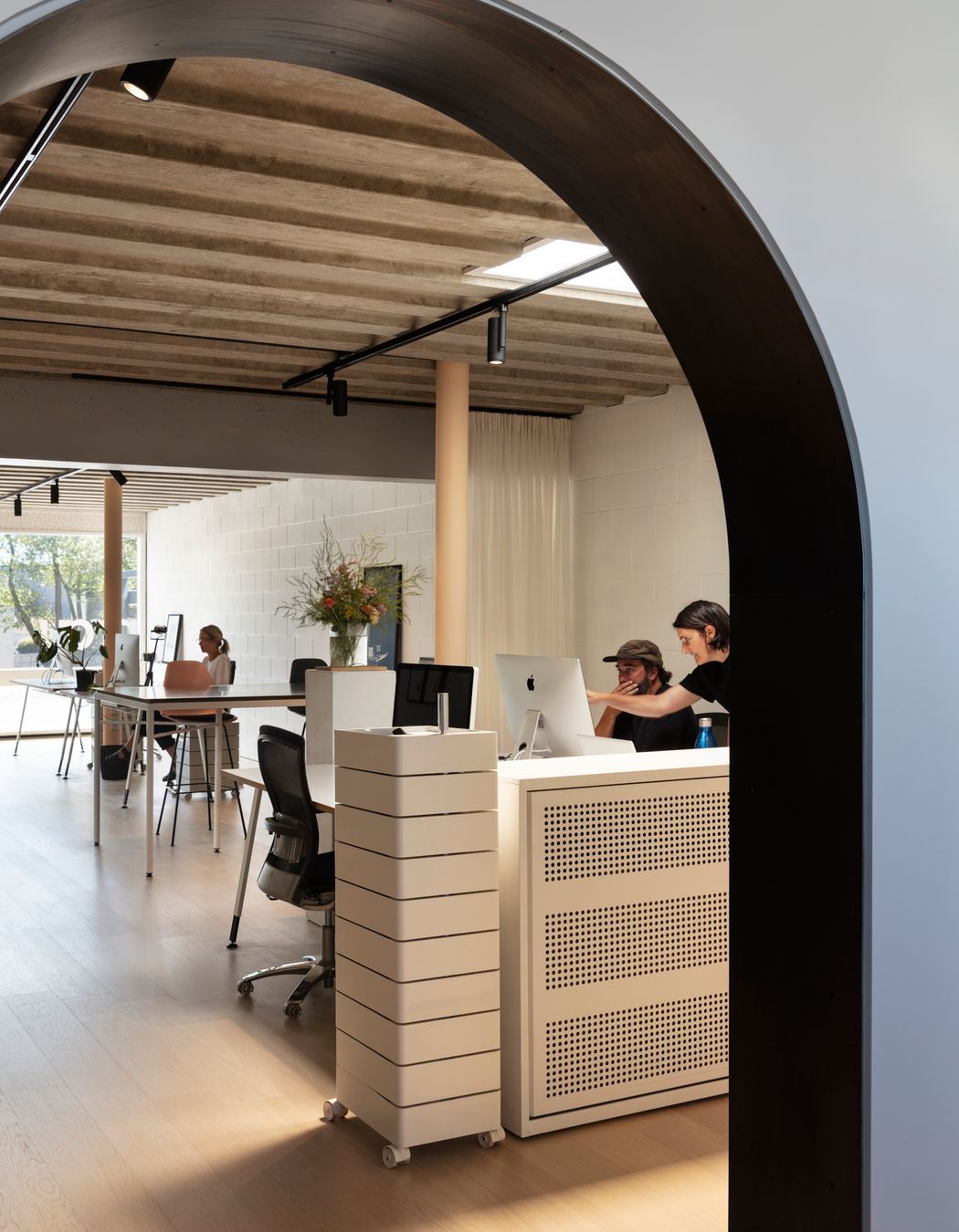 ArchiPro Project Summary - PRAU studio at Poynton House, Christchurch, revitalizes a 1970s structure by embracing its original concrete aesthetics, enhancing collaborative workspaces with modern design elements, and integrating vibrant accents inspired by the Memphis Group.