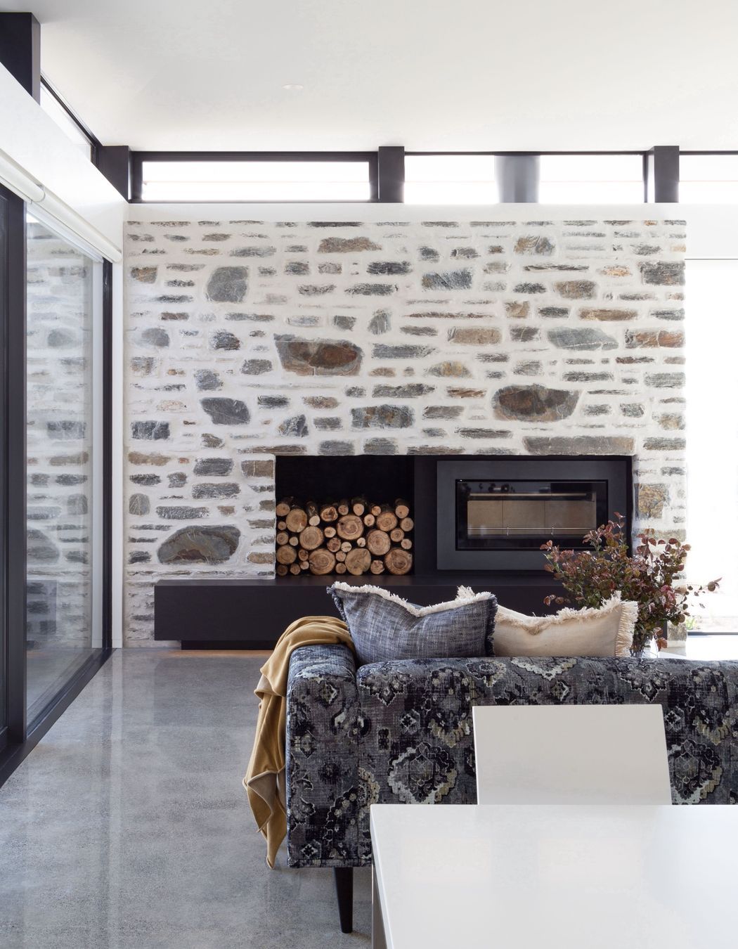 ArchiPro Project Summary - A sophisticated blend of natural materials, featuring oak, marble, and stone, with polished concrete floors and a serene master suite, complemented by unexpected Ikat fabric accents in the living room.