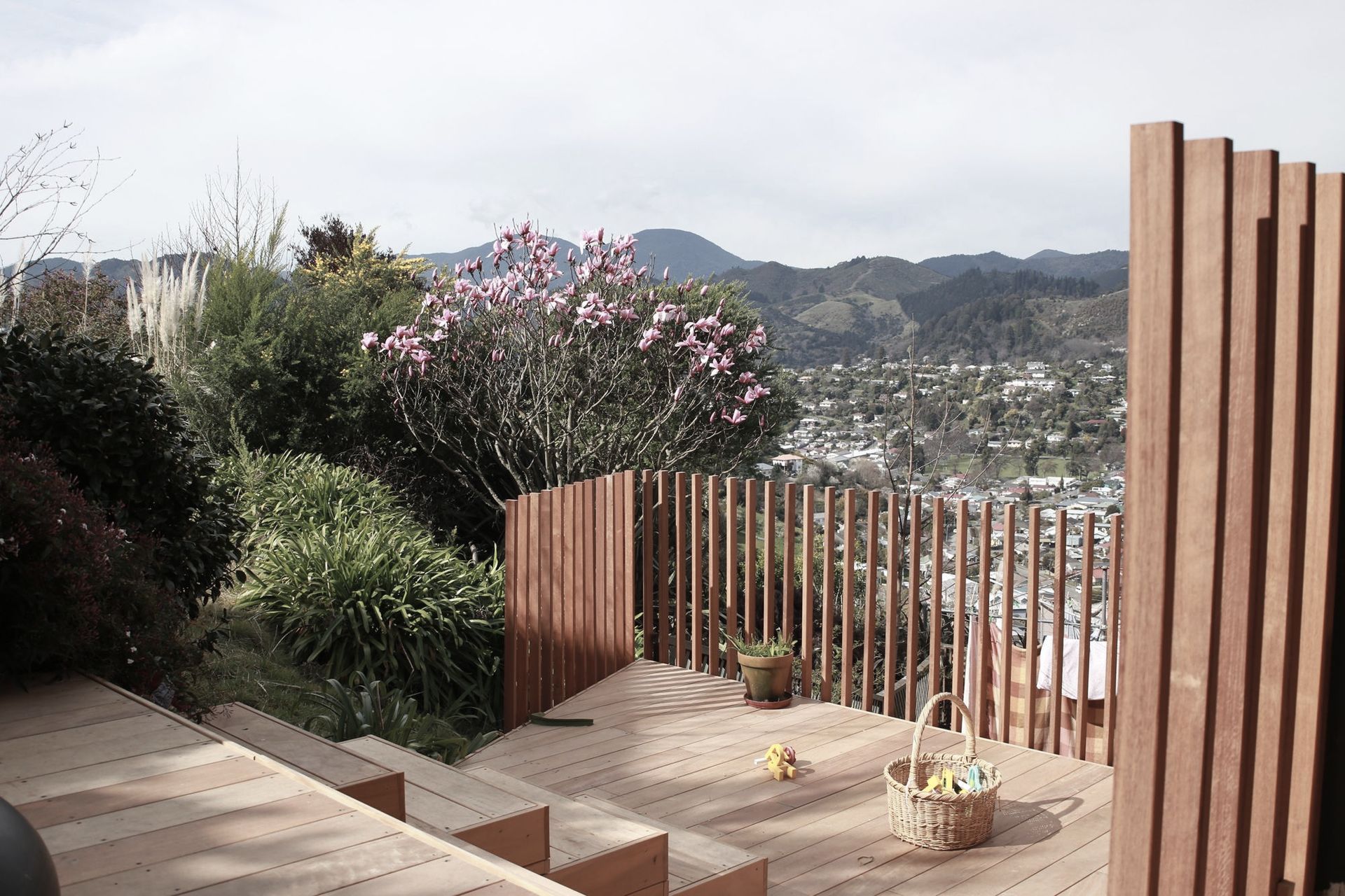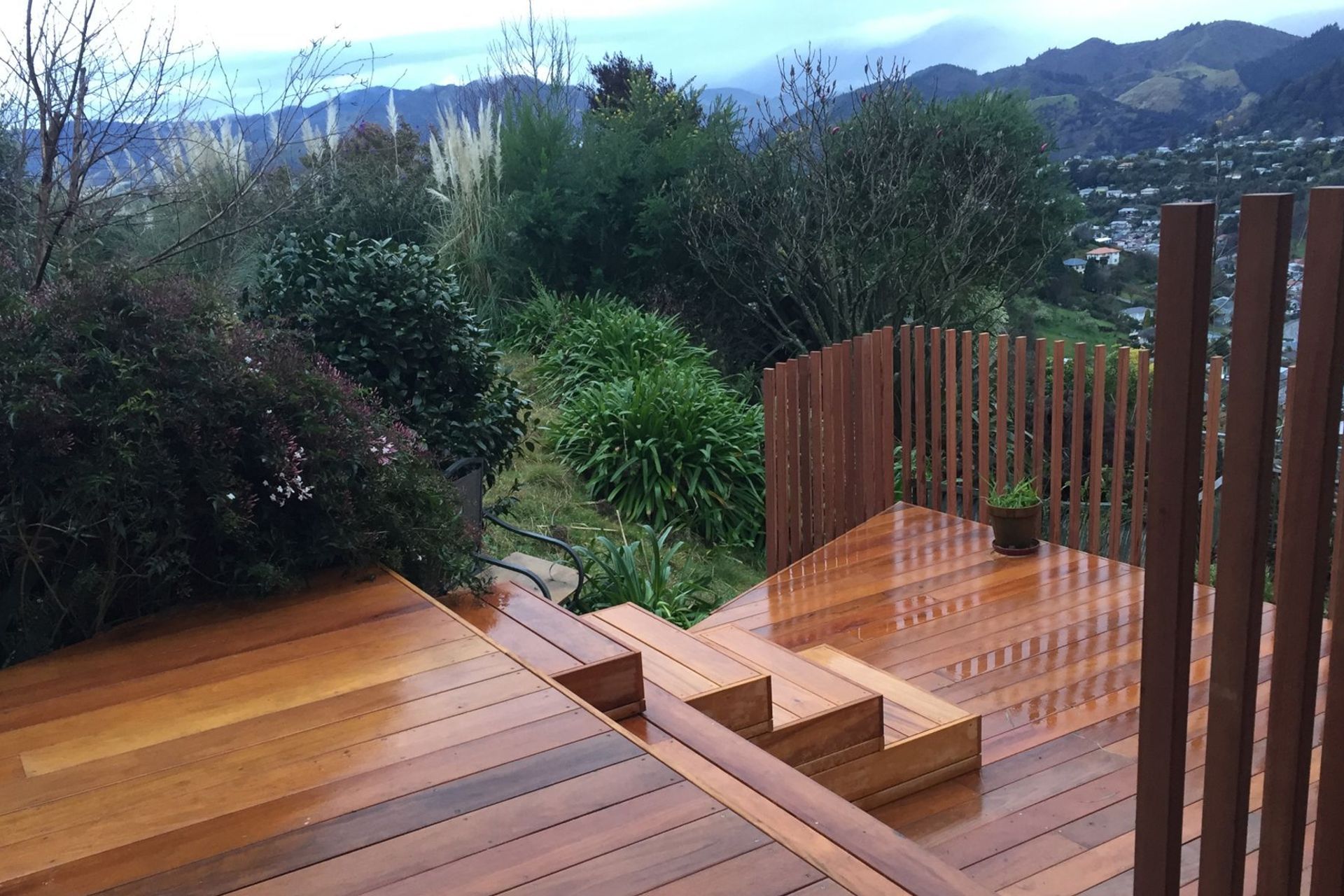 ArchiPro Project Summary - Revitalized hardwood deck enhancing indoor-outdoor flow and maximizing stunning views of Nelson city, featuring solid hardwood and Jarrah balustrades, while reusing existing framing to optimize costs.