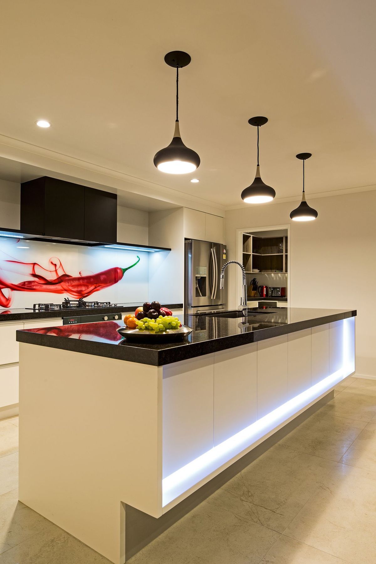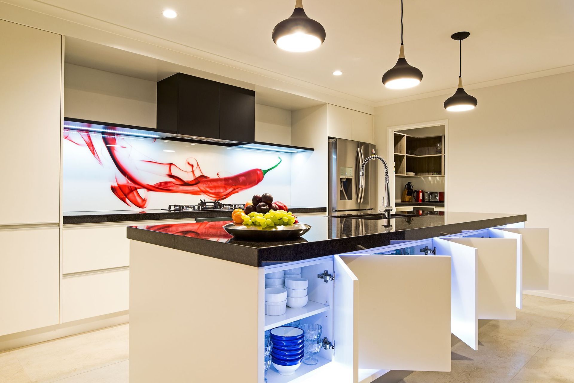 ArchiPro Project Summary - A striking modern kitchen featuring bold red accents against sleek black and white cabinetry, showcasing a custom splashback inspired by the client's passion for spicy cooking.