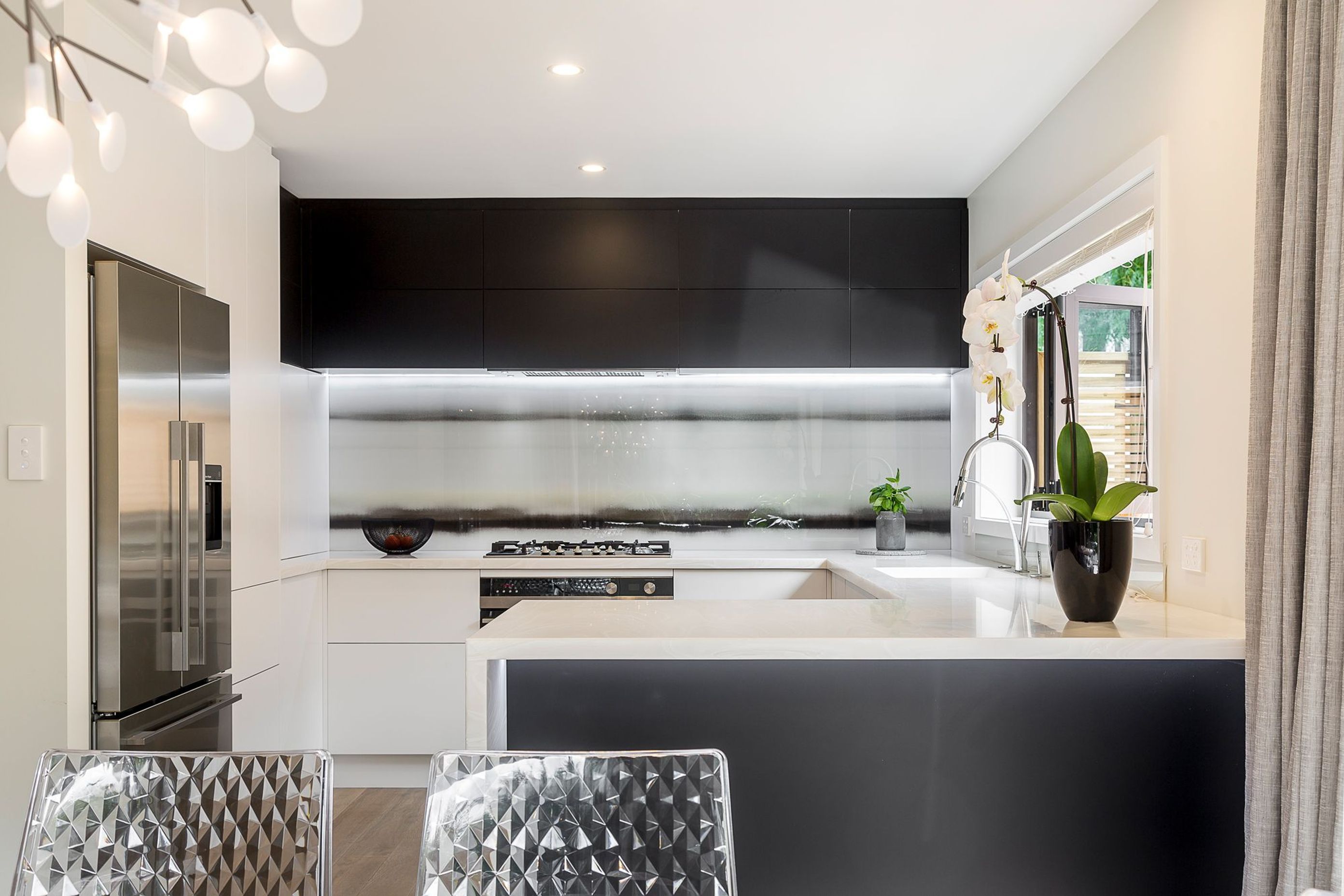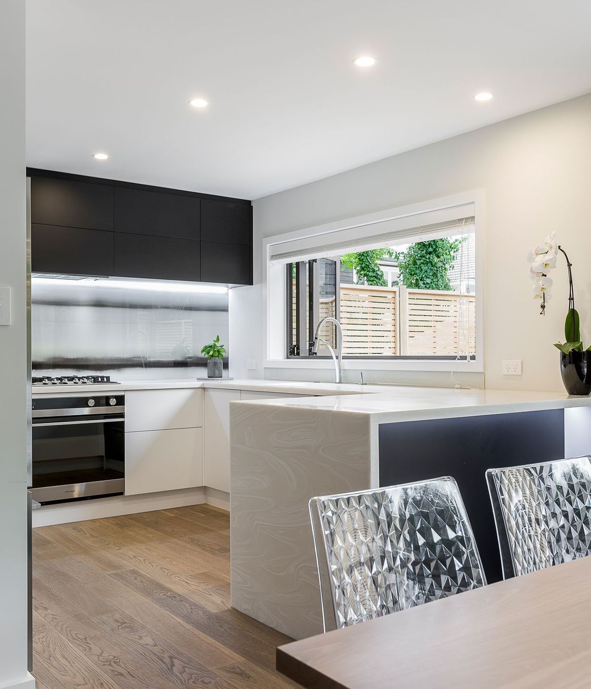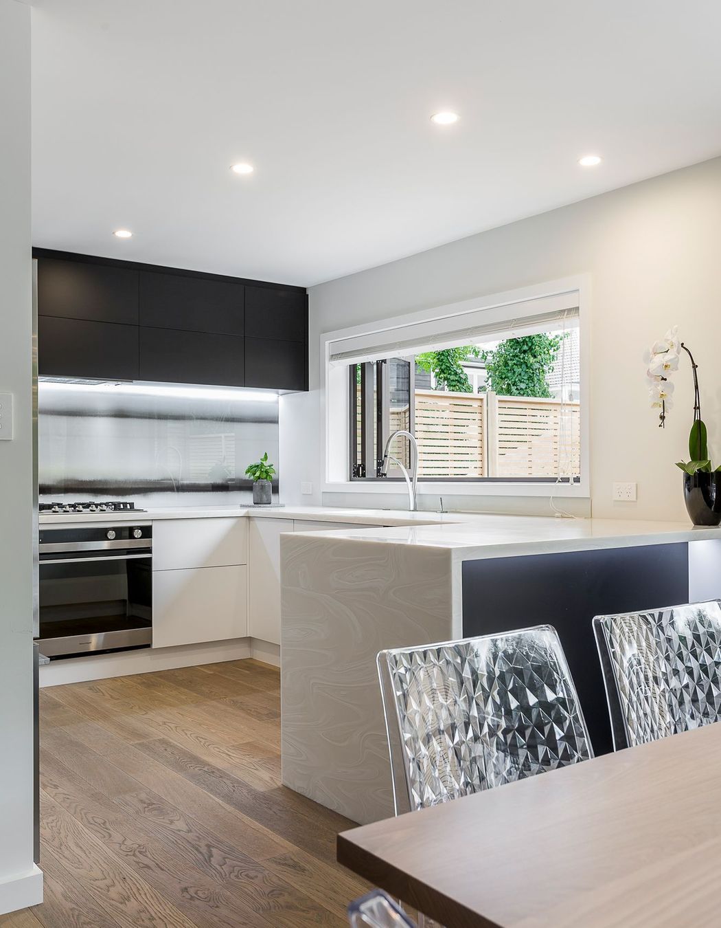 ArchiPro Project Summary - A harmonious blend of white and black cabinetry complemented by a natural timber floor, featuring a linear printed glass splashback that unifies the kitchen's design while adding an organic touch for timeless elegance.