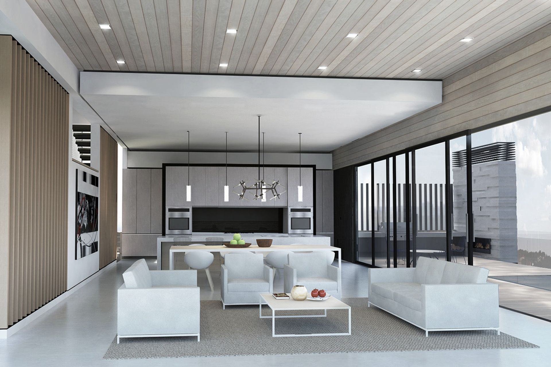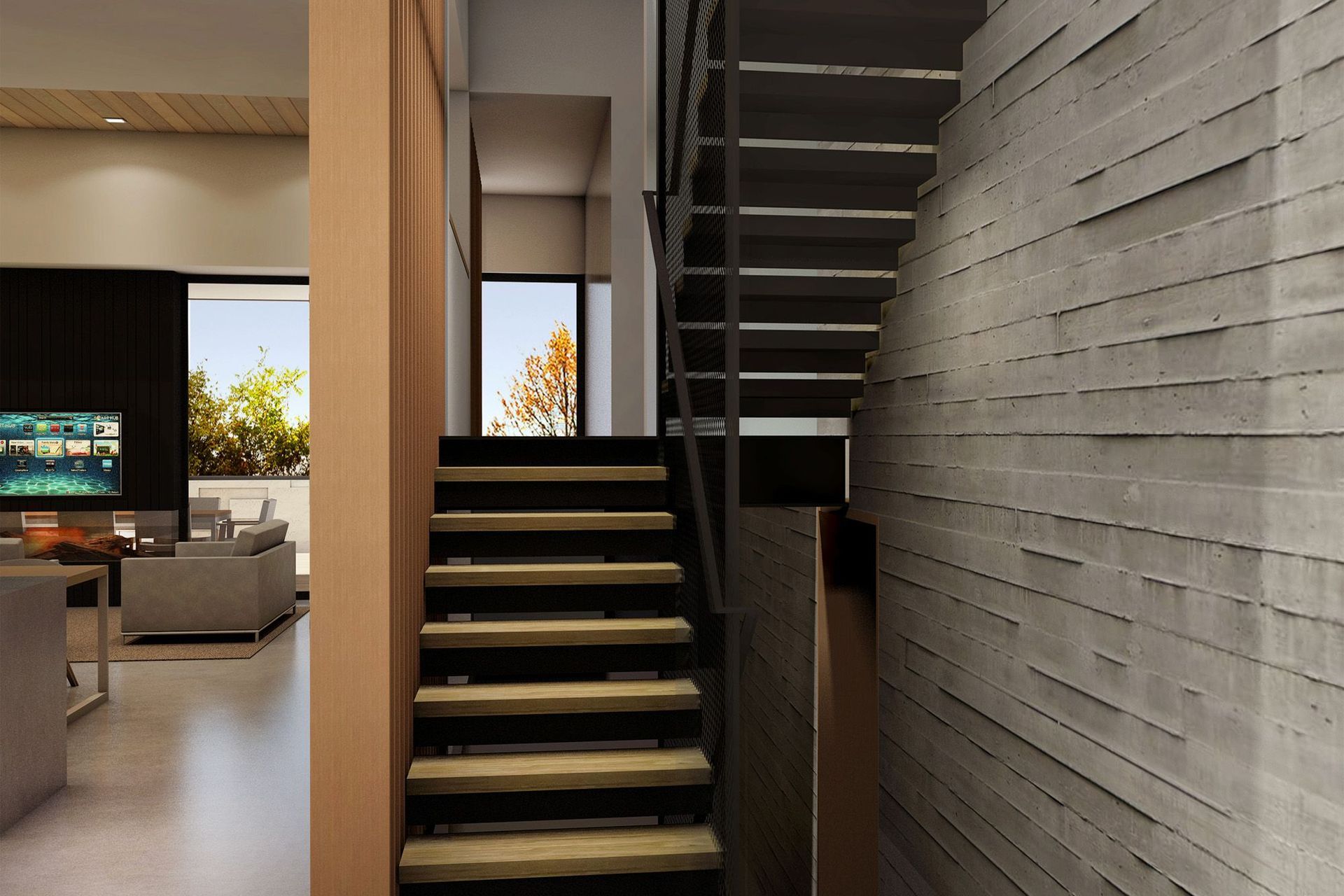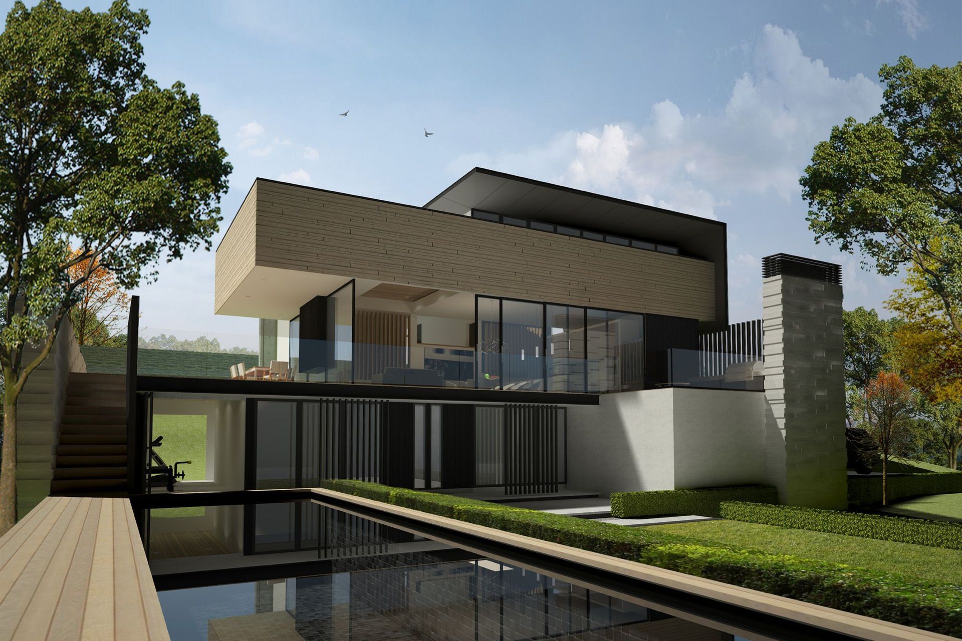 ArchiPro Project Summary - Concept design for a waterfront residence in Hamilton, featuring interconnecting volumes and voids across split levels, enhancing visual connections while maintaining privacy, with dramatic views of the Waikato River.