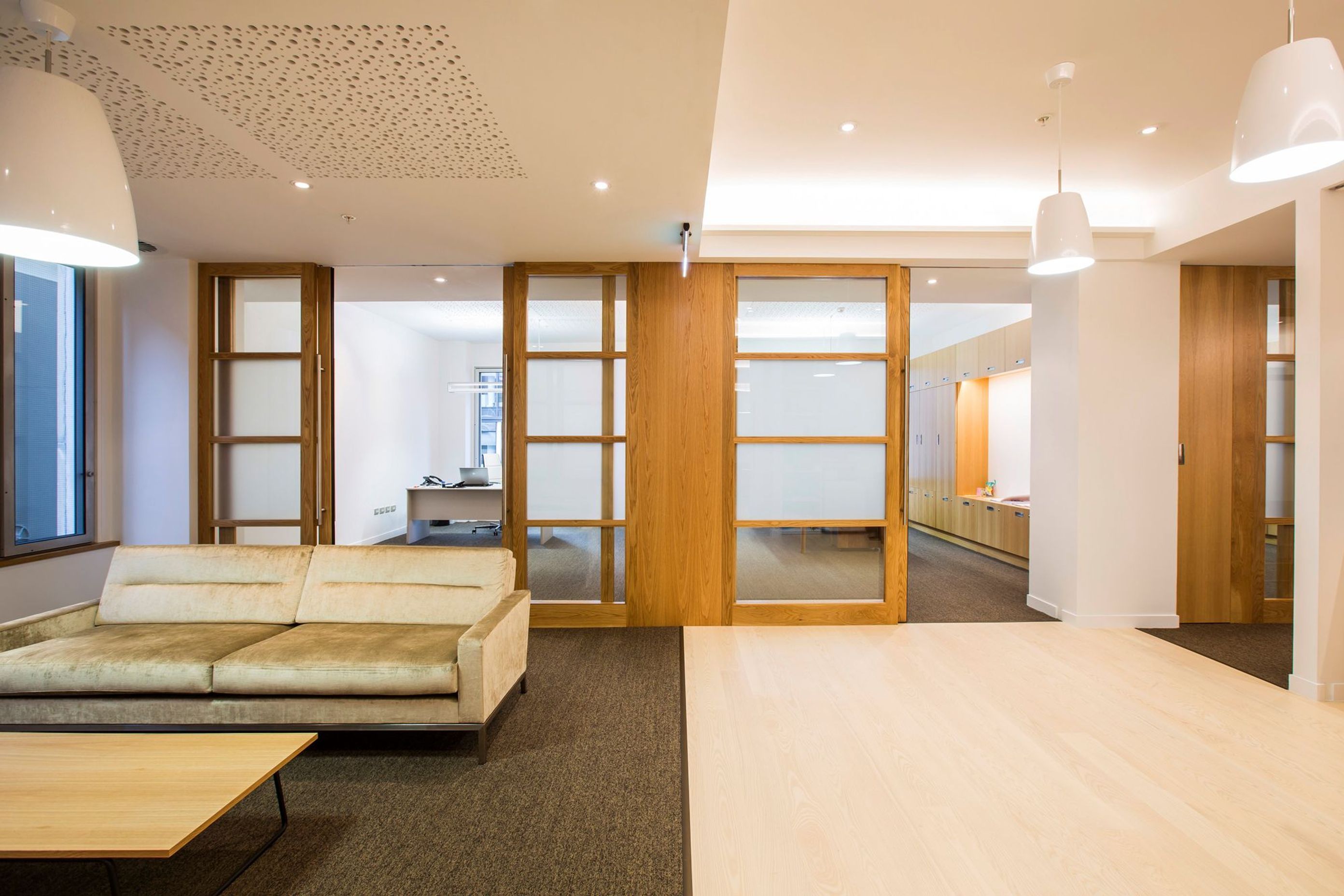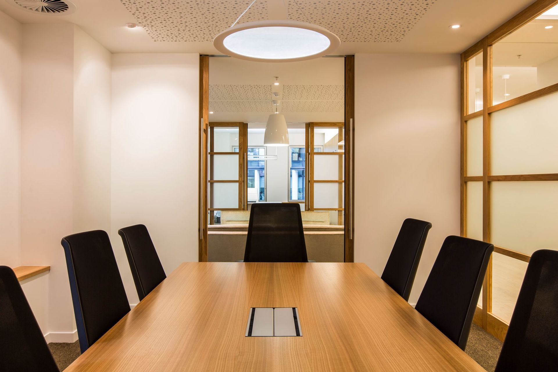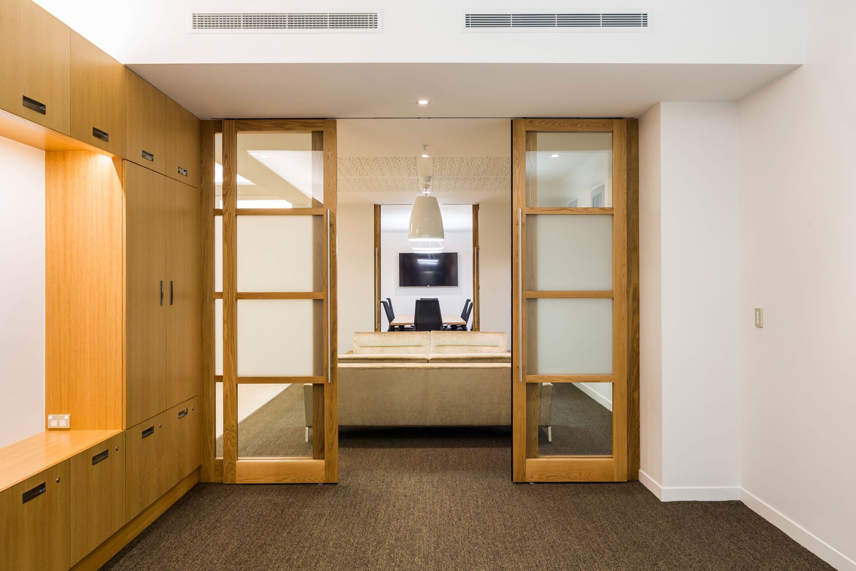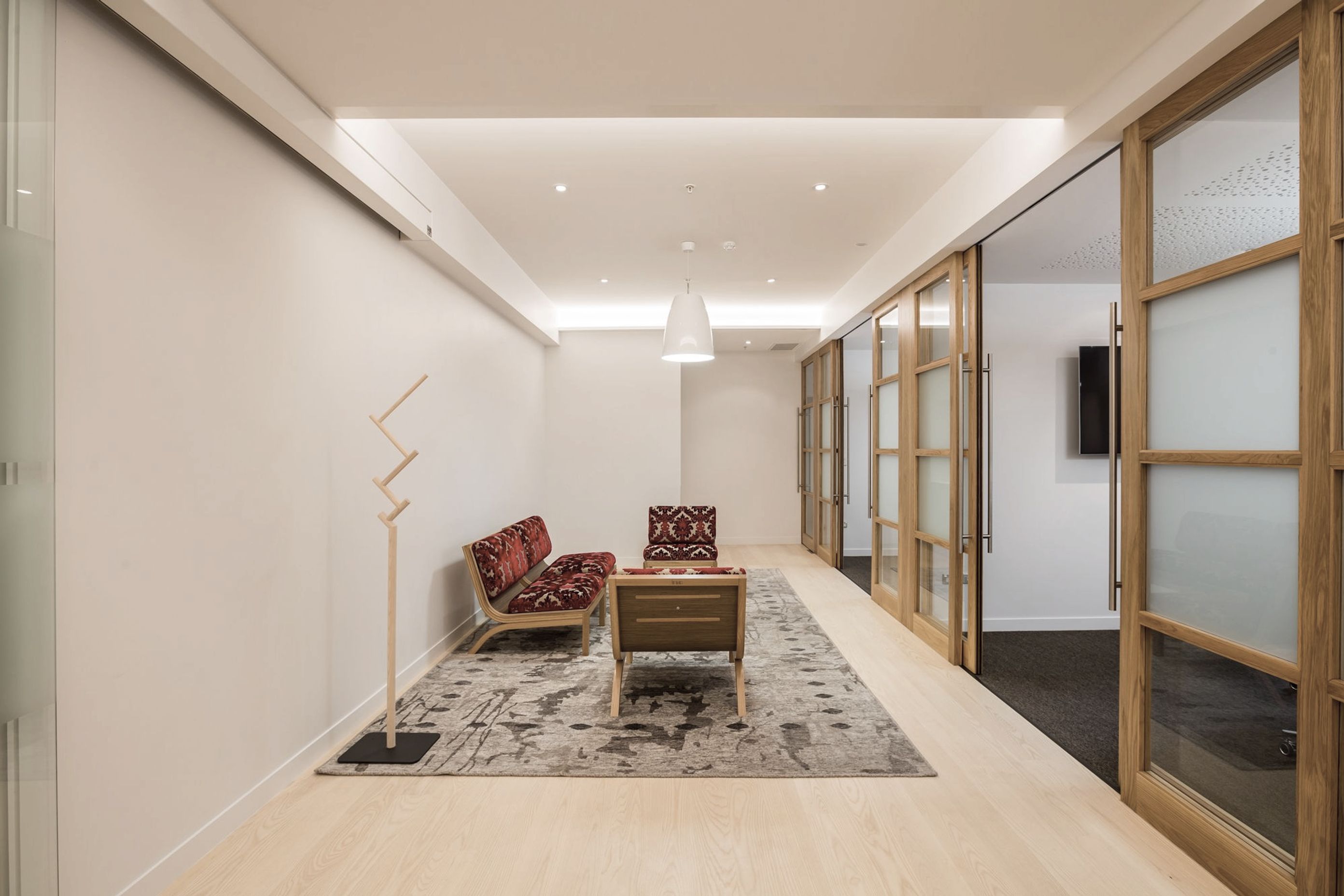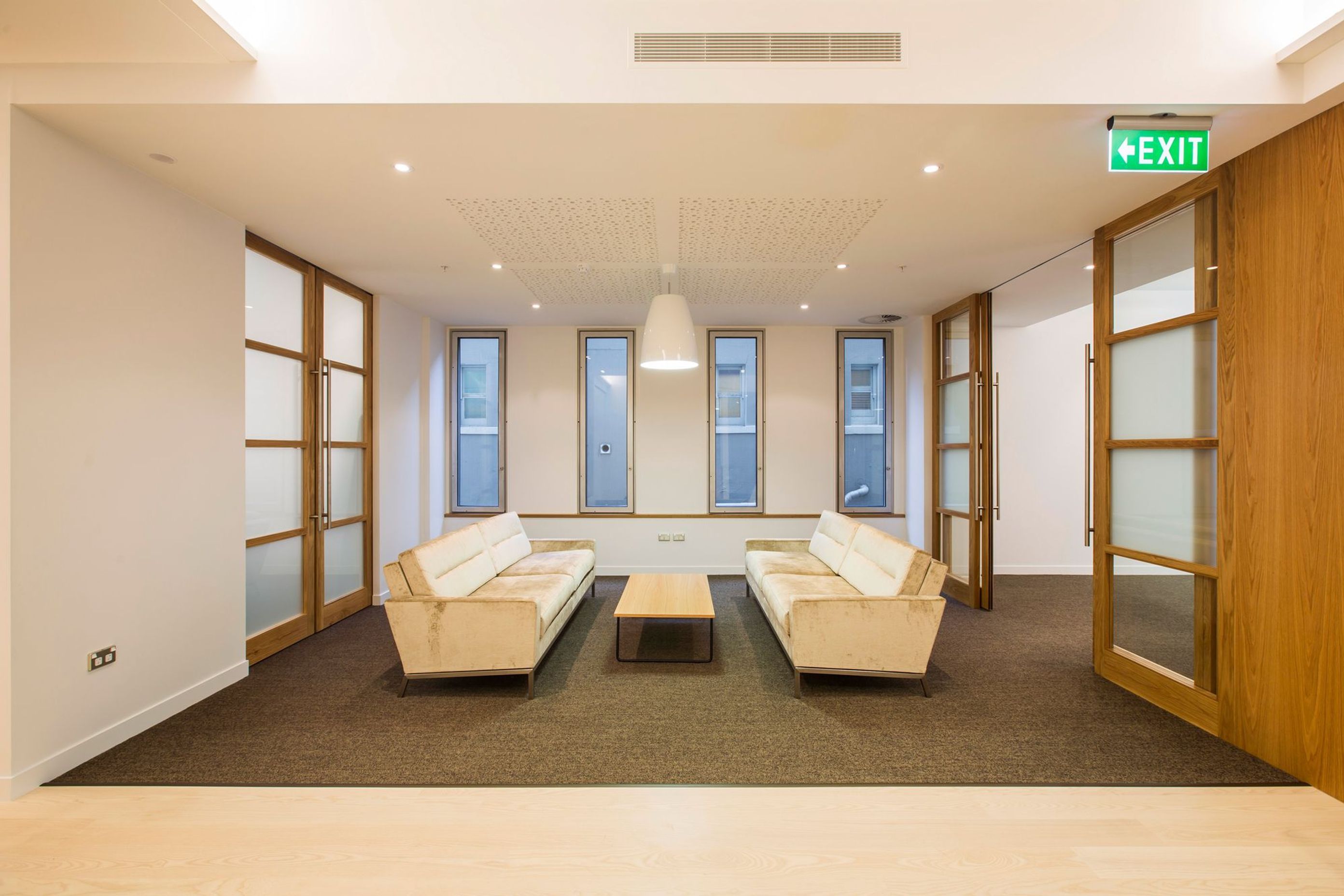 ArchiPro Project Summary - High-quality office fitout in the historic Old South British Building, featuring private offices, meeting rooms, and inviting breakout spaces, designed with a clean aesthetic of white walls, timber and carpet floors, and bespoke cabinetry.
