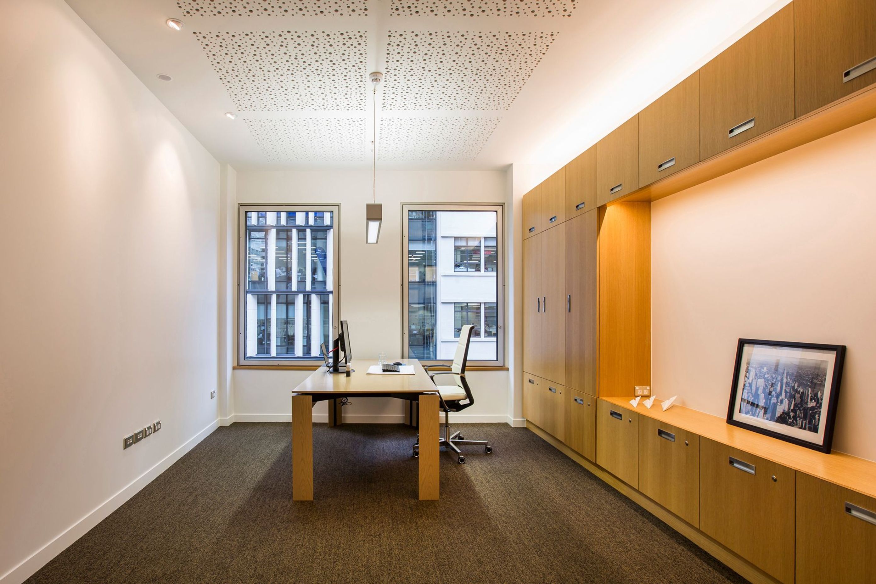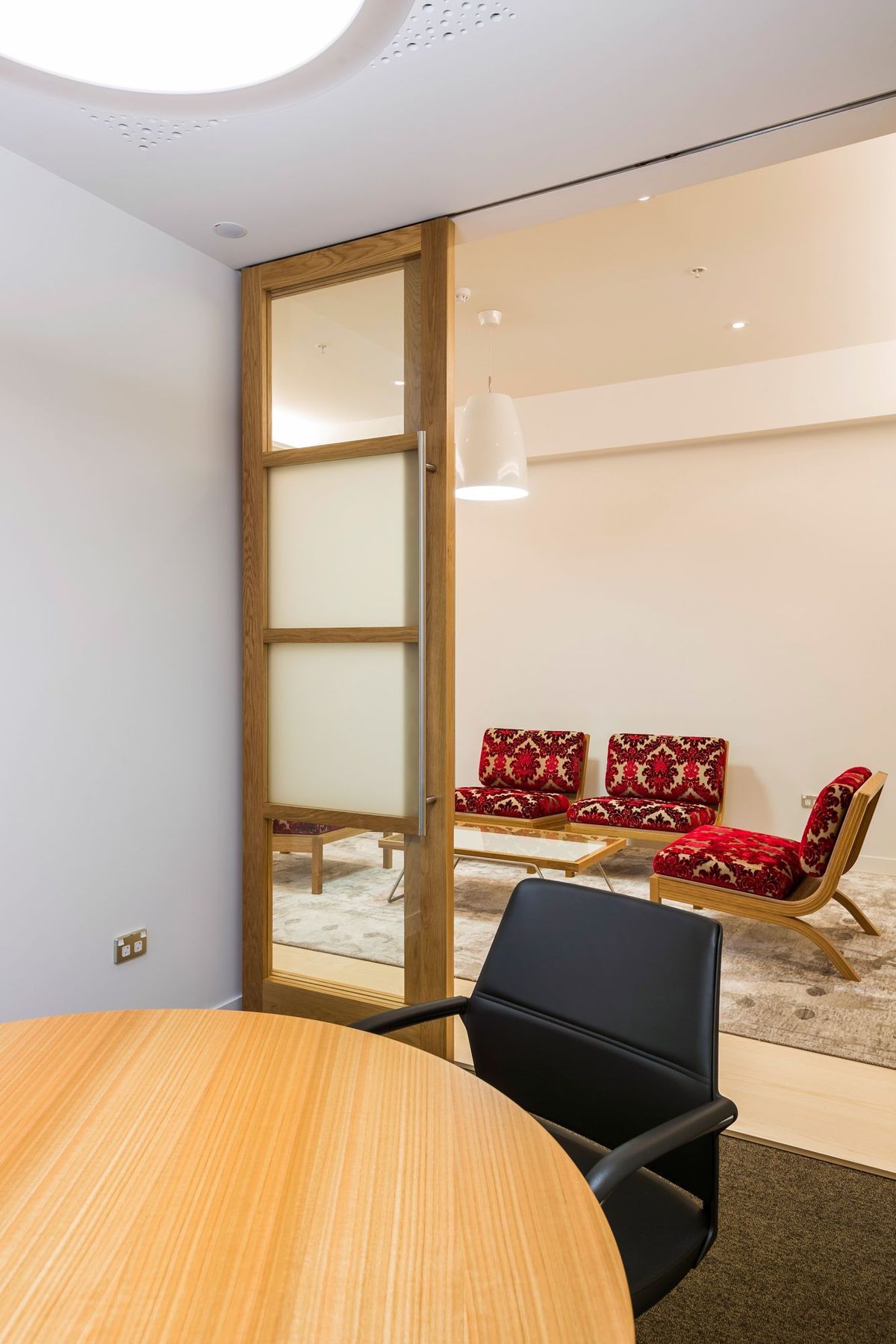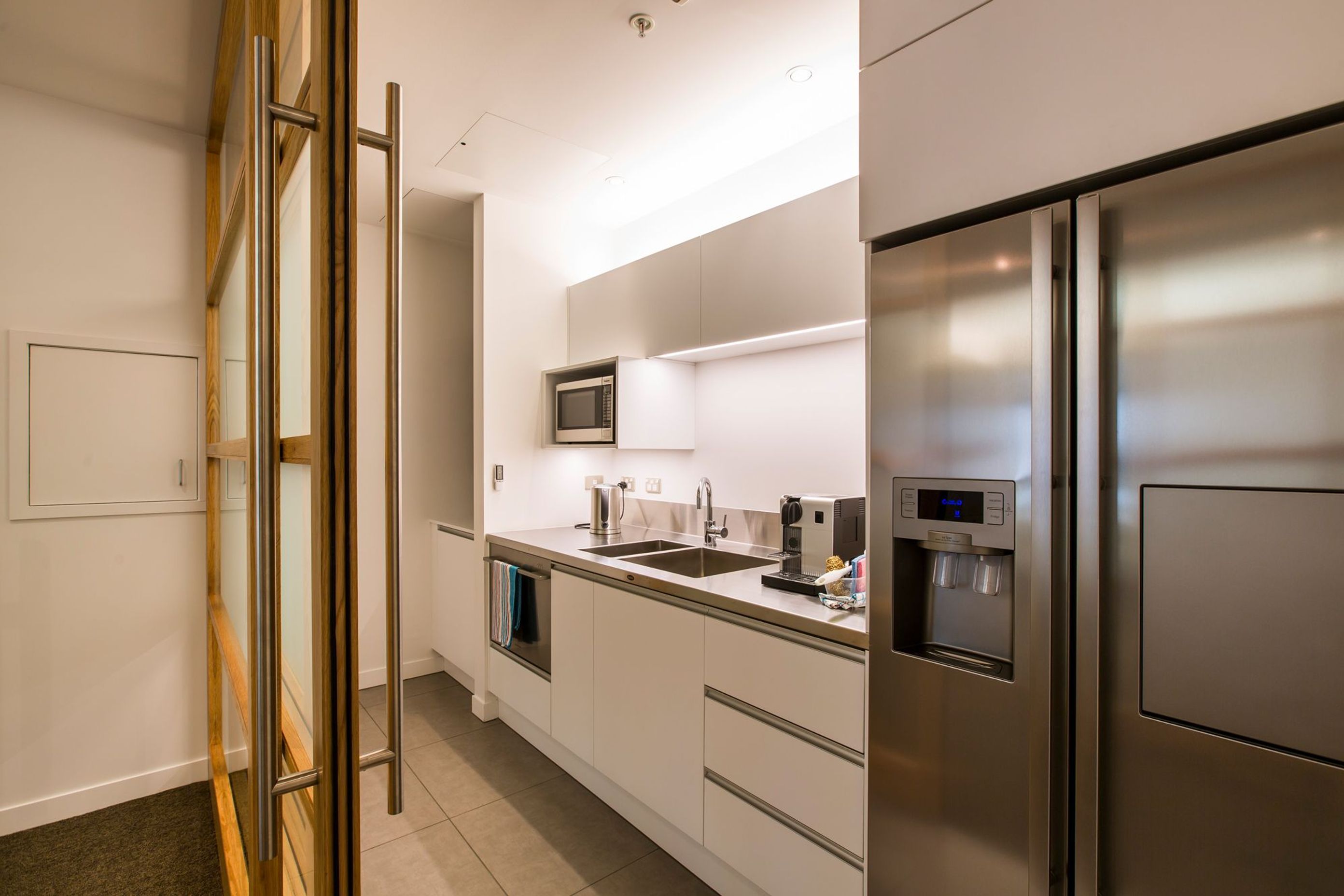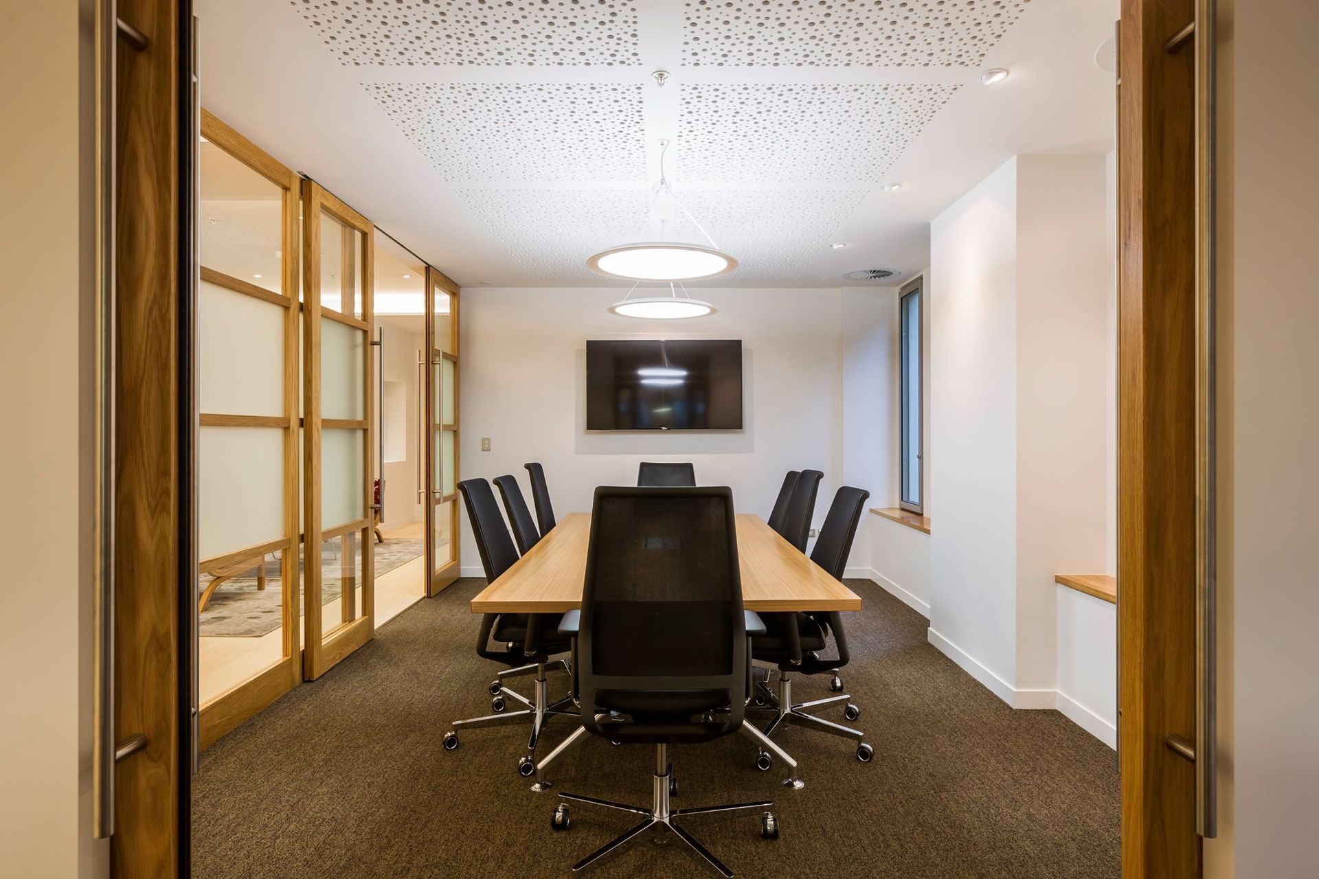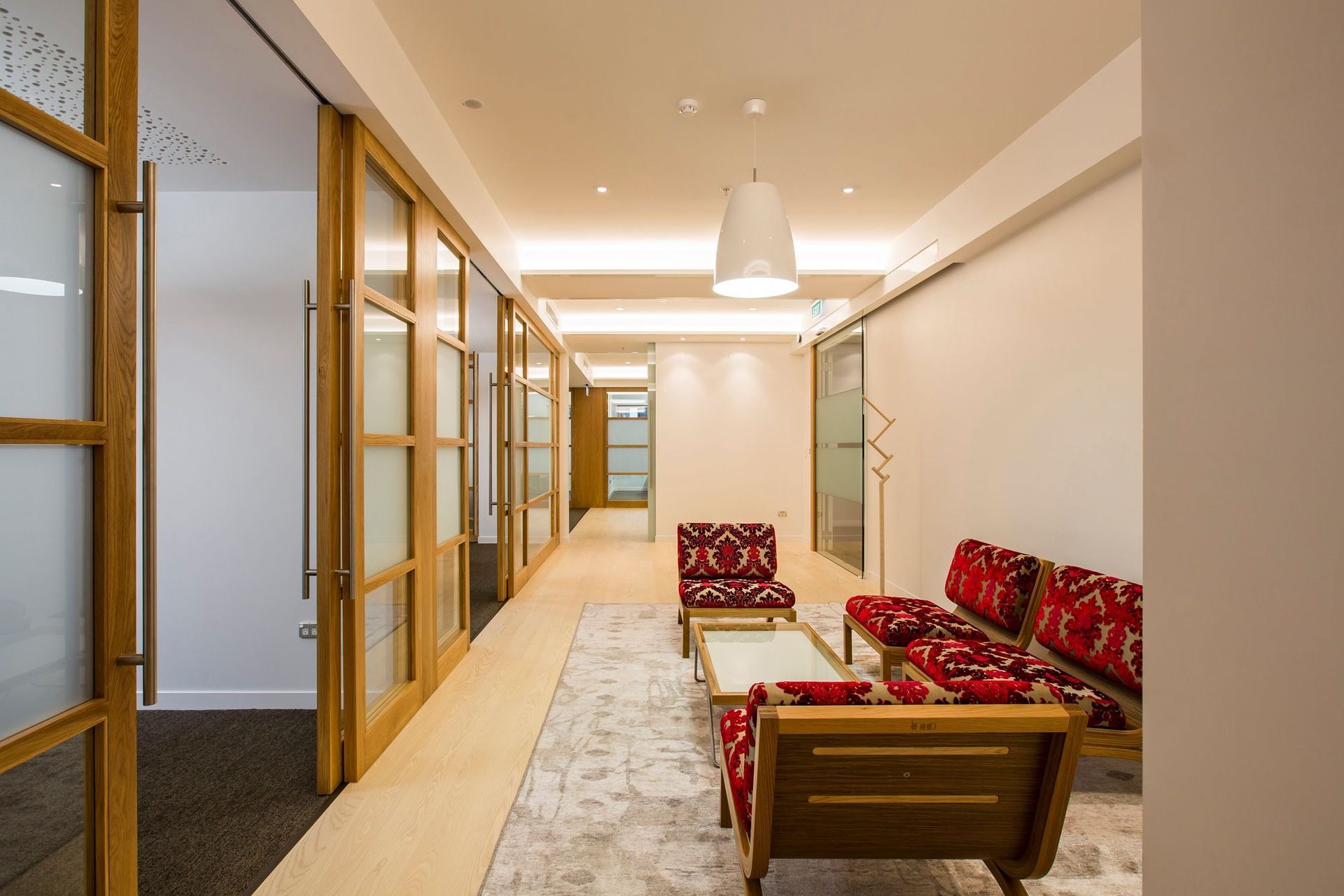 ArchiPro Project Summary - High-quality office fitout in the historic Old South British Building, featuring private offices, meeting rooms, and inviting breakout spaces, designed with a clean aesthetic of white walls, timber and carpet floors, and bespoke cabinetry.