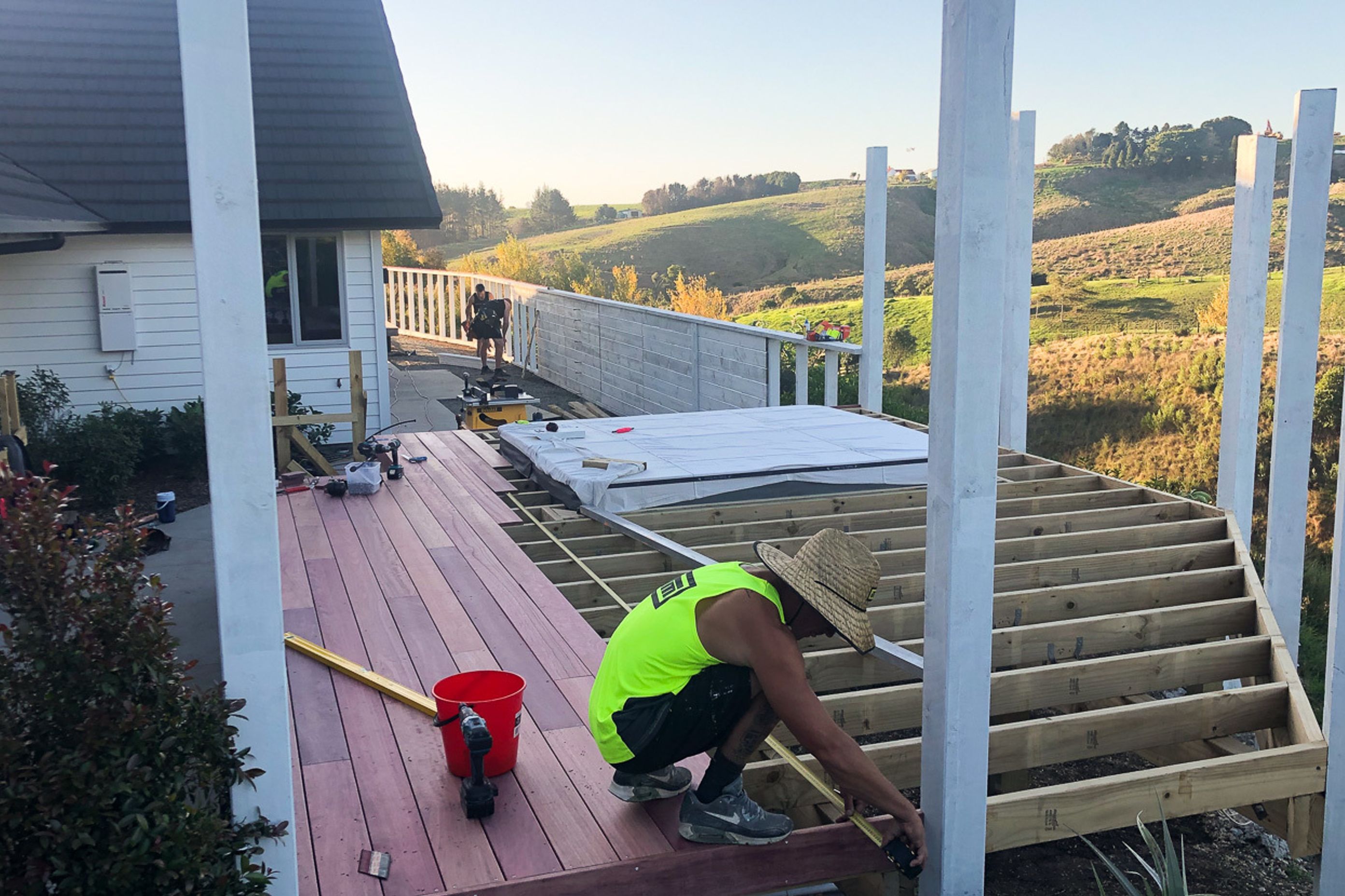 ArchiPro Project Summary - Private outdoor living space featuring a perimeter fence, spa pool deck with glass balustrade, and a golf putting green, designed for privacy and low maintenance, completed in 6 weeks for New Zealand sports star Joseph Parker.