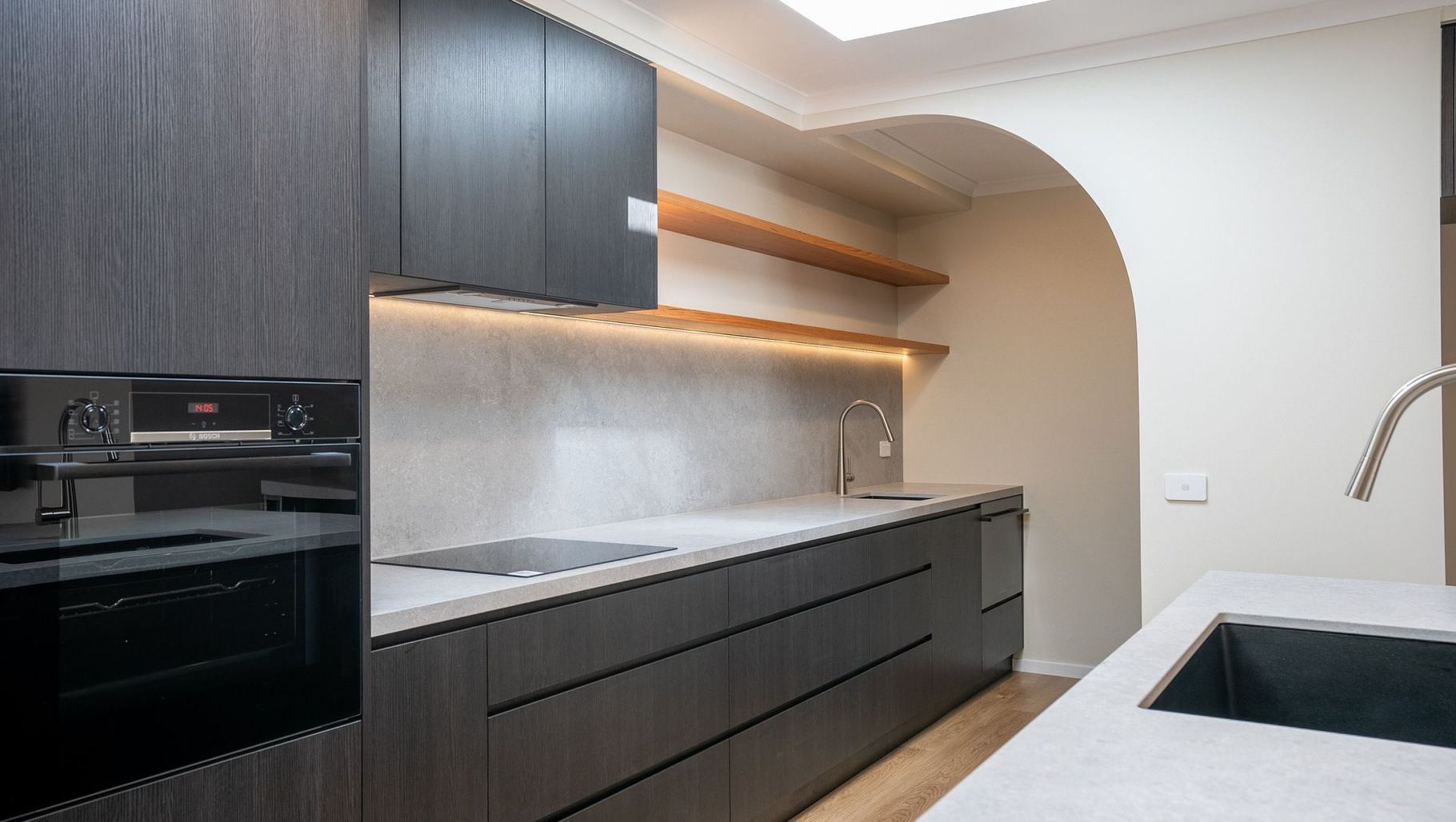 ArchiPro Project Summary - A stunning renovation of a kitchen and laundry space featuring a modern dark design, enhanced natural light, and seamless outdoor living with new decking, showcasing expert craftsmanship and a commitment to quality construction.