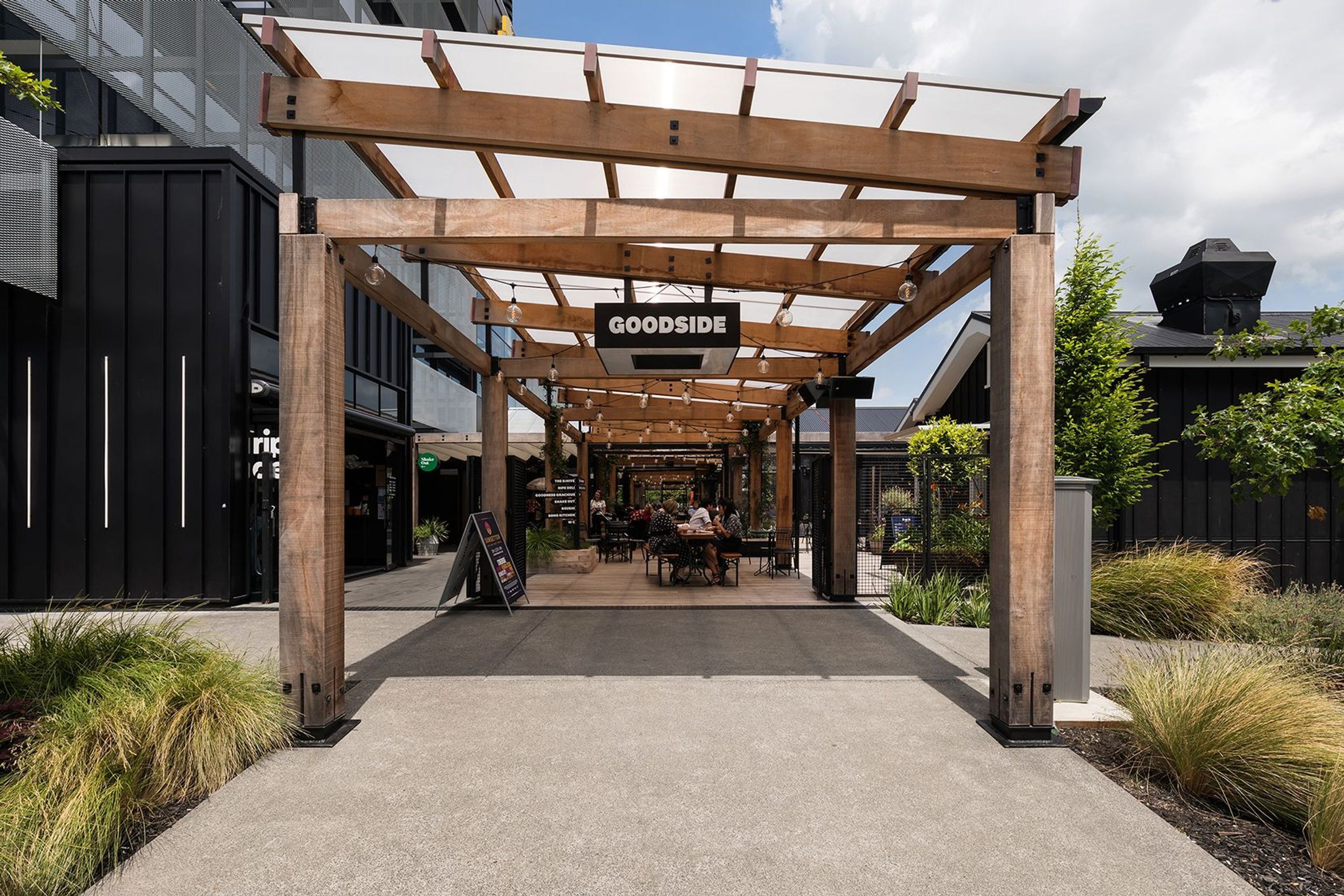 ArchiPro Project Summary - A collaboration between JSC Timber, Rucon Construction, and Izzard Design, Project Timber features sustainable materials like FSC® certified Cumaru and Vitex decking, enhancing the vibrant community spaces of Goodside and The Grange at Smales Farm, completed in 2020.