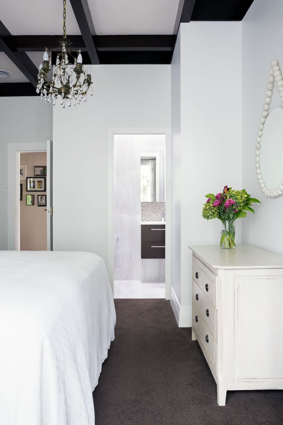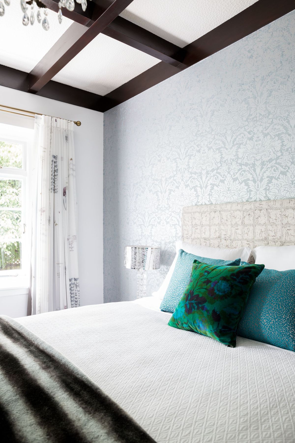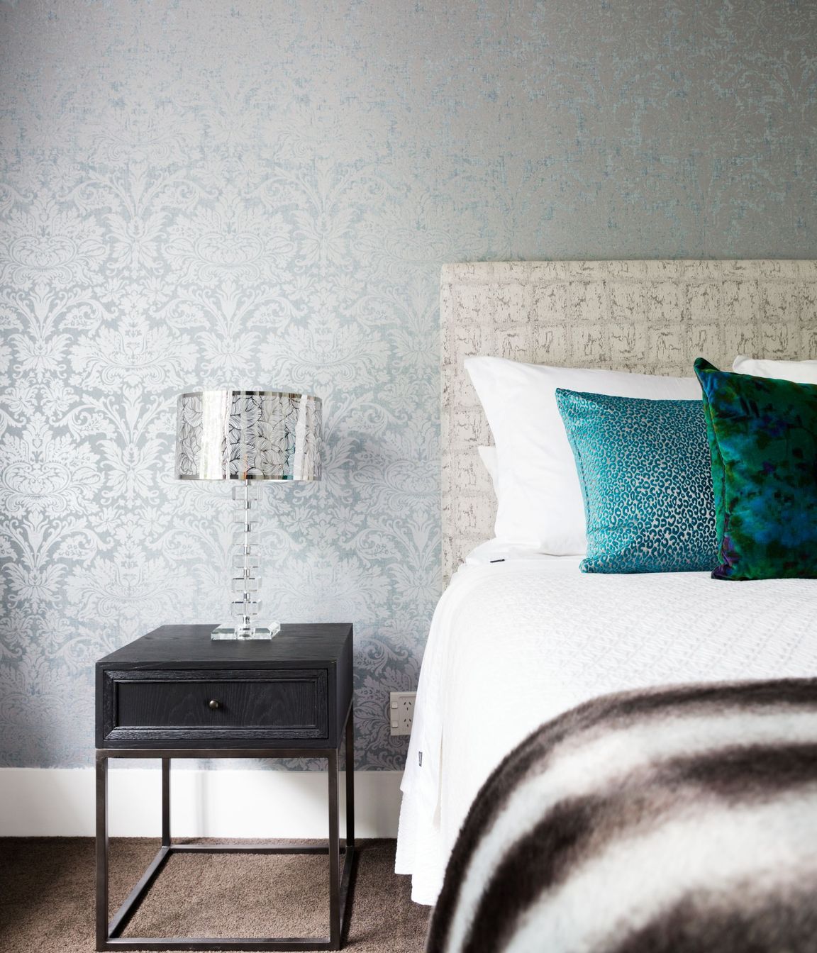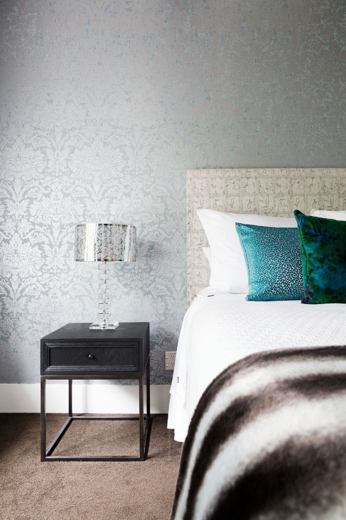 ArchiPro Project Summary - A serene bedroom design featuring a soft colour palette, silvery grey wallpaper, and custom furnishings, complemented by an en suite with elegant wall tiles and mosaic accents.