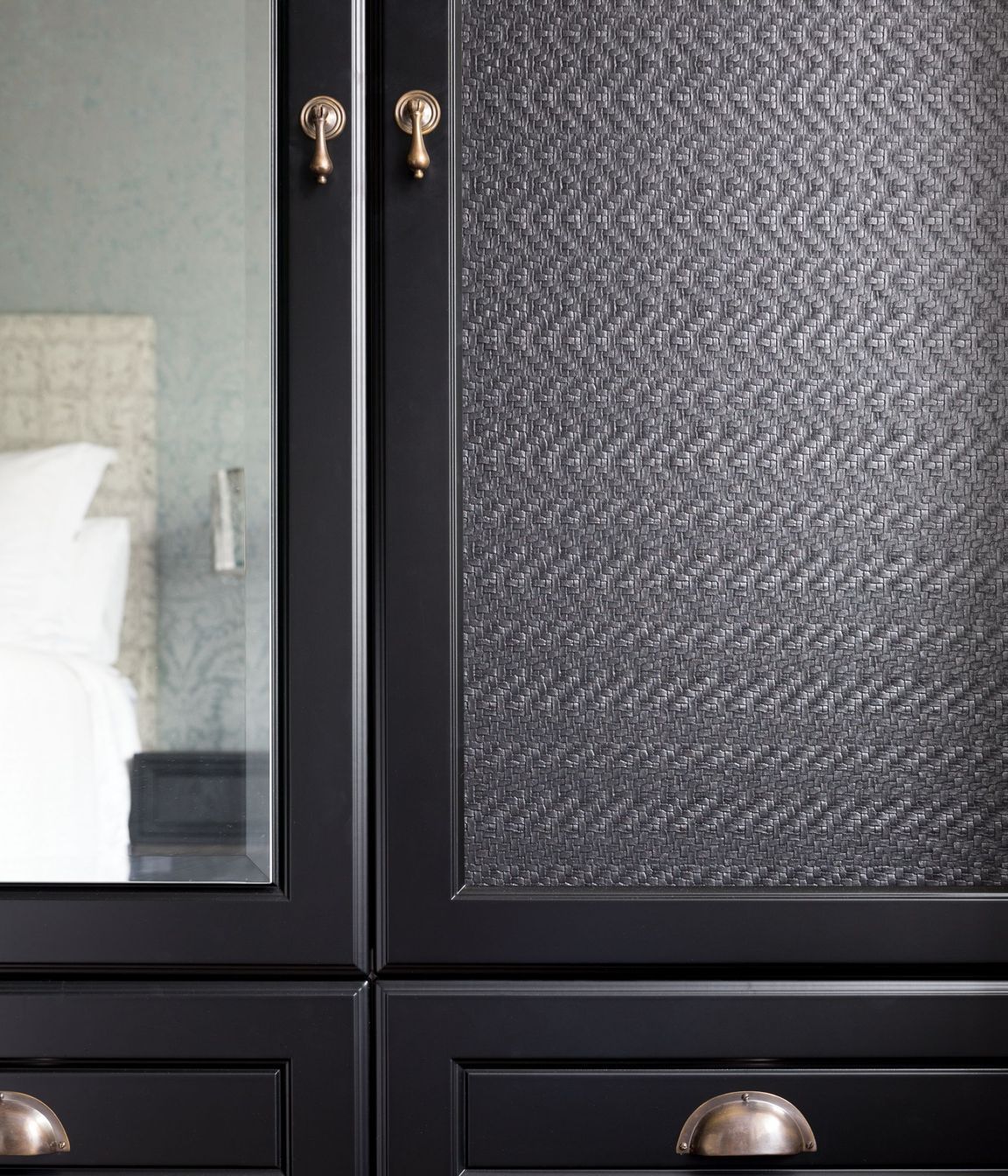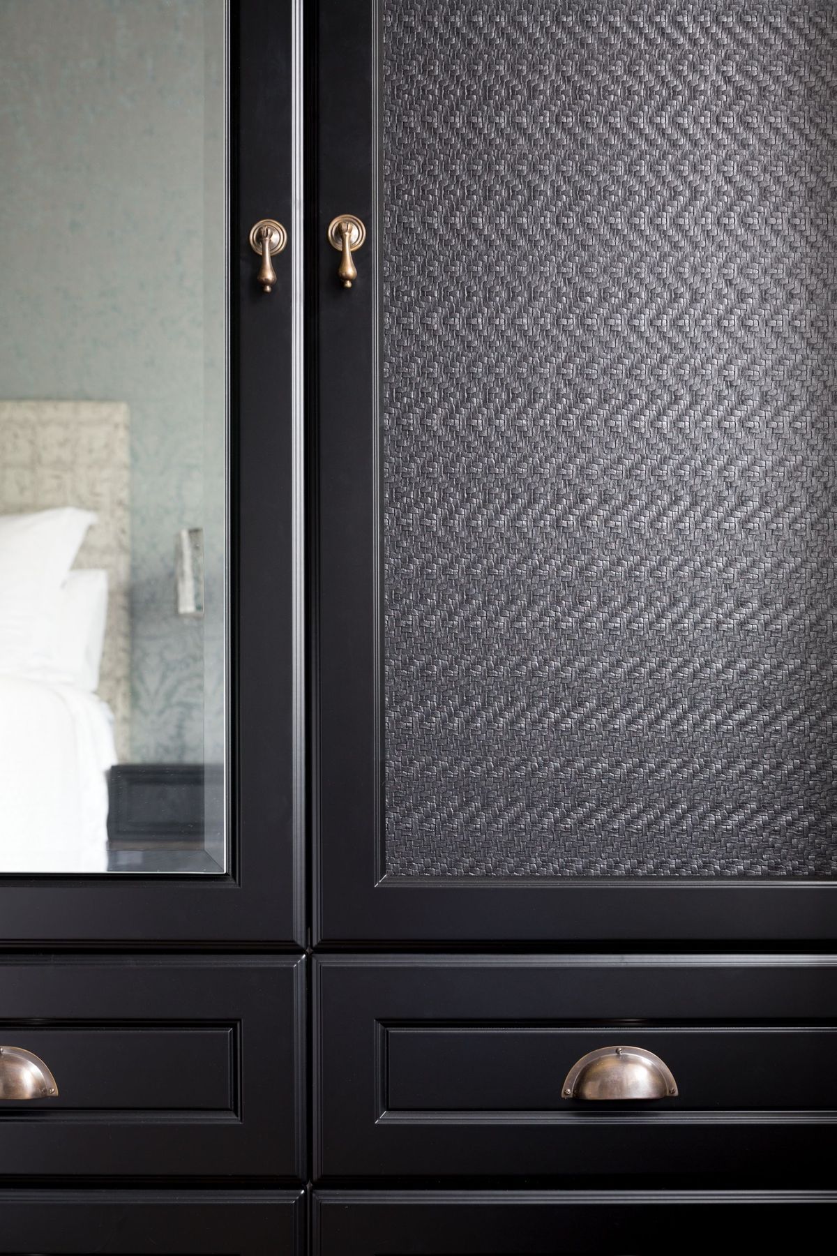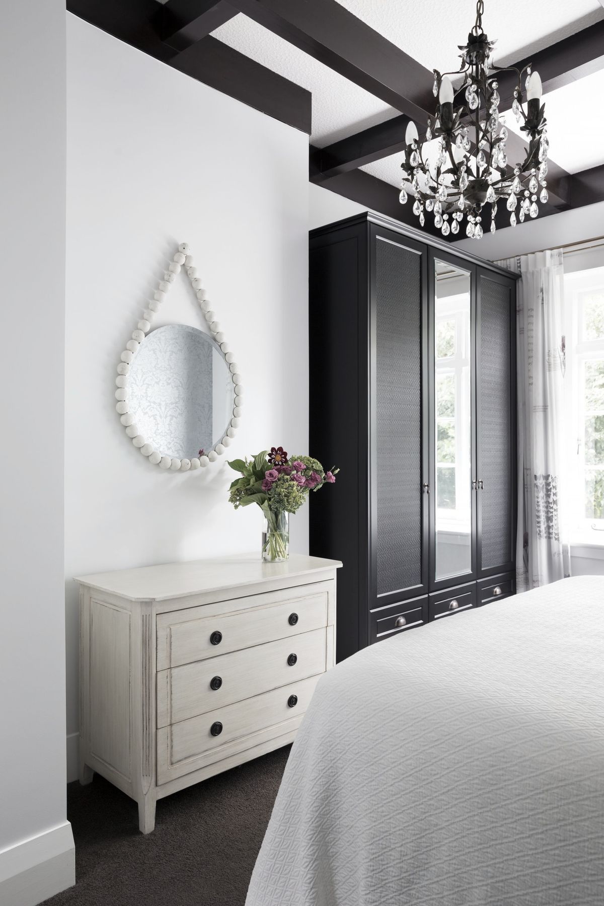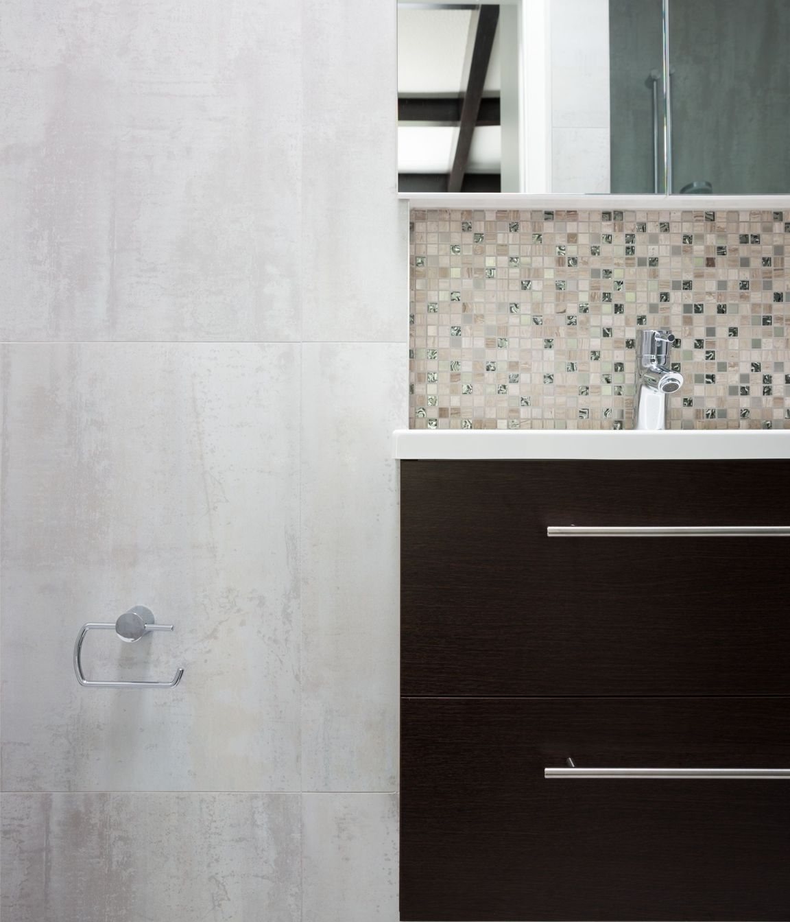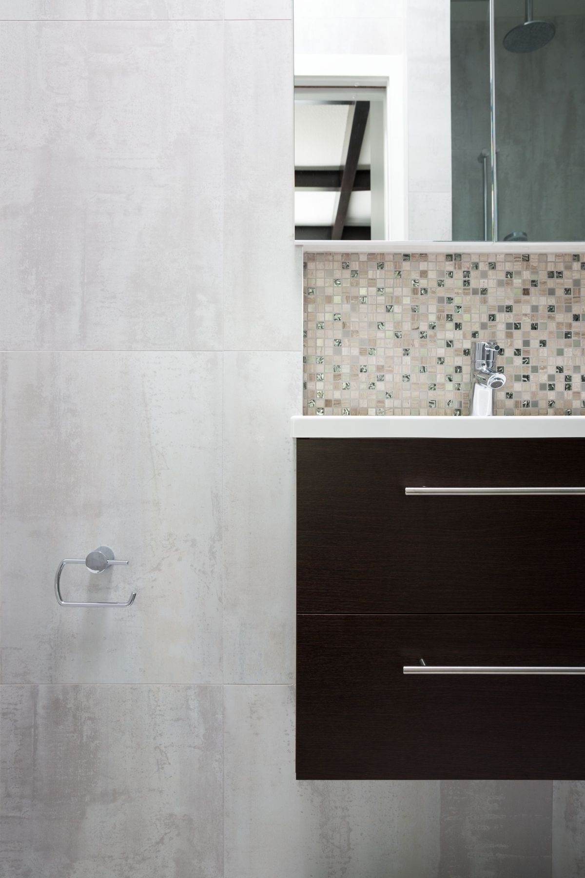 ArchiPro Project Summary - A serene bedroom design featuring a soft colour palette, silvery grey wallpaper, and custom furnishings, complemented by an en suite with elegant wall tiles and mosaic accents.