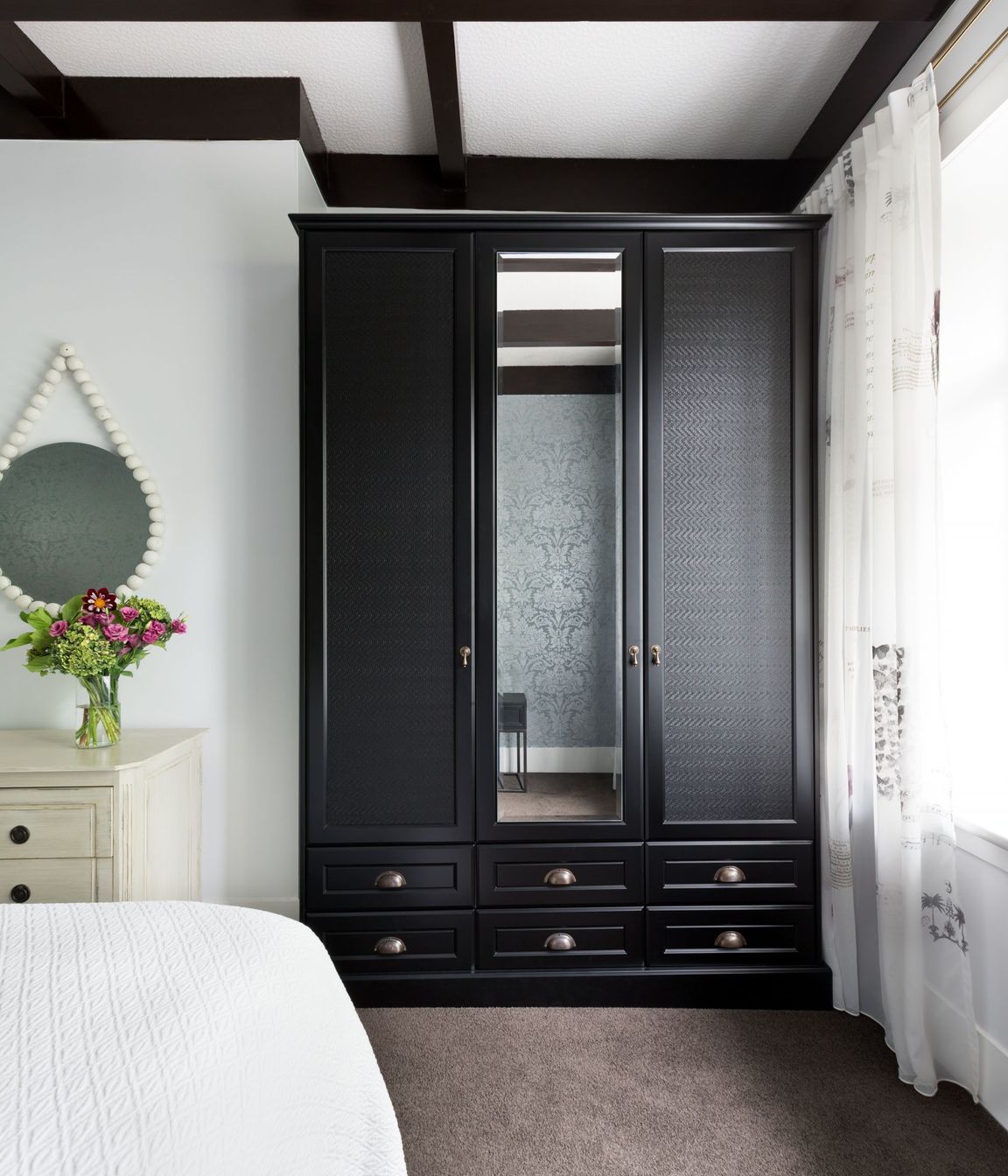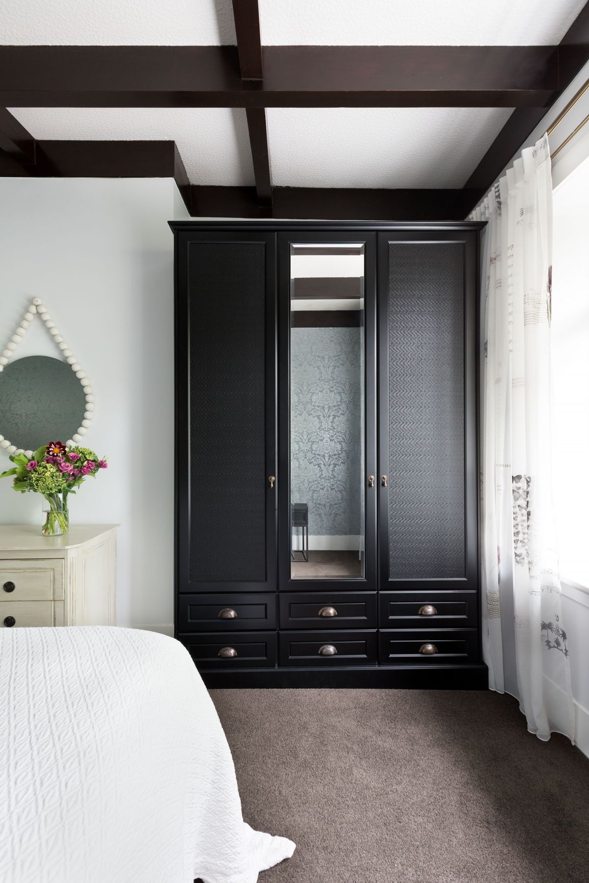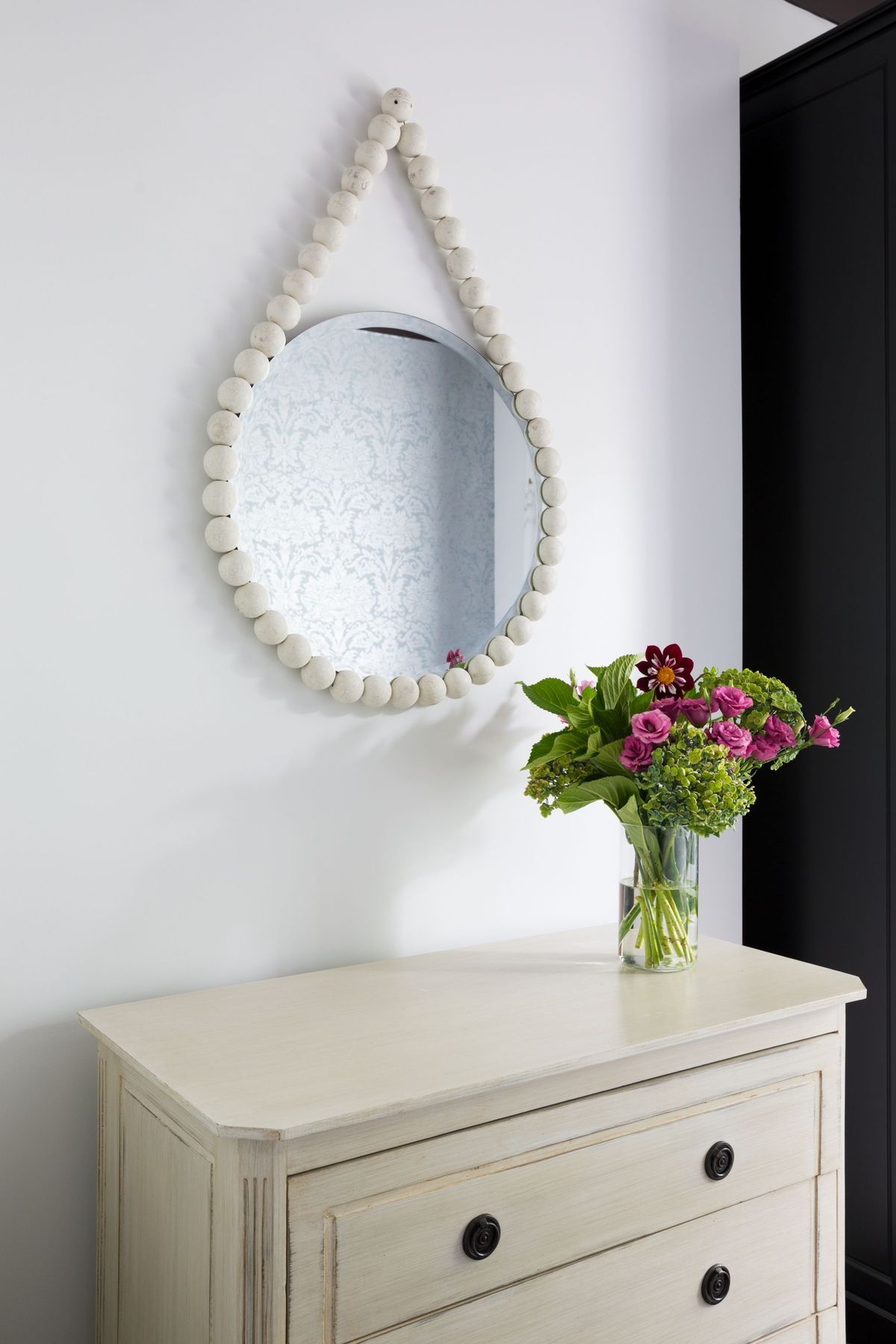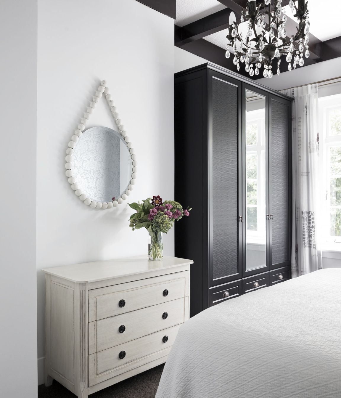ArchiPro Project Summary - A serene bedroom design featuring a soft colour palette, silvery grey wallpaper, and custom furnishings, complemented by an en suite with elegant wall tiles and mosaic accents.