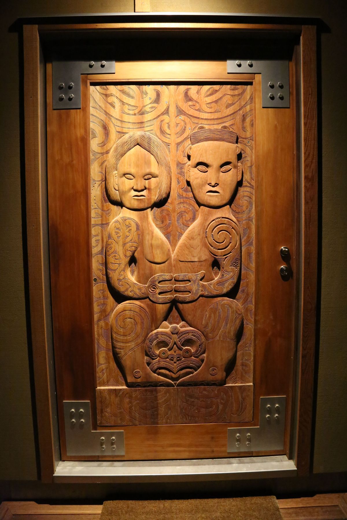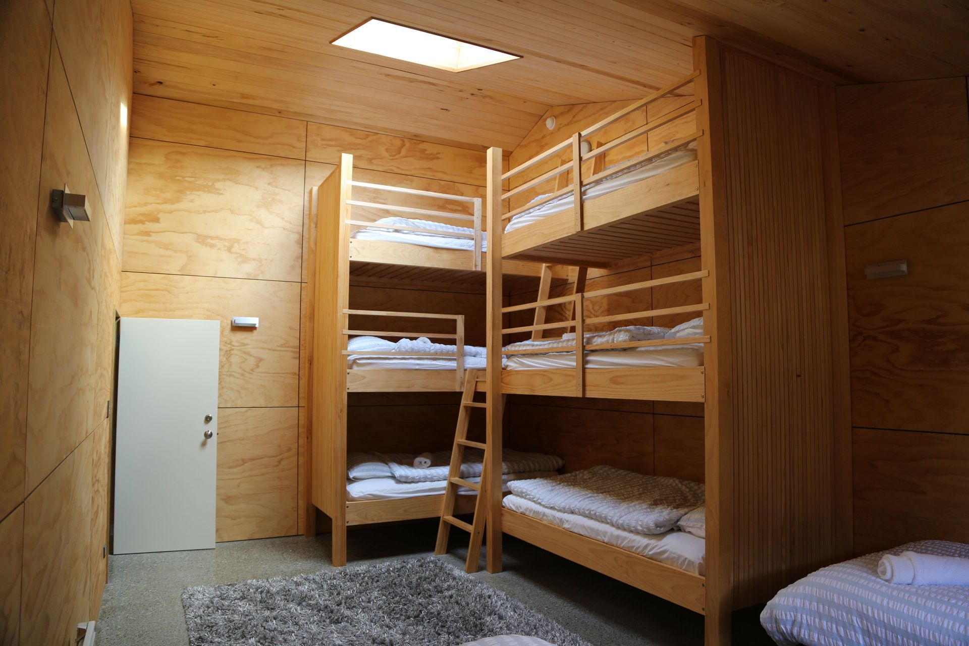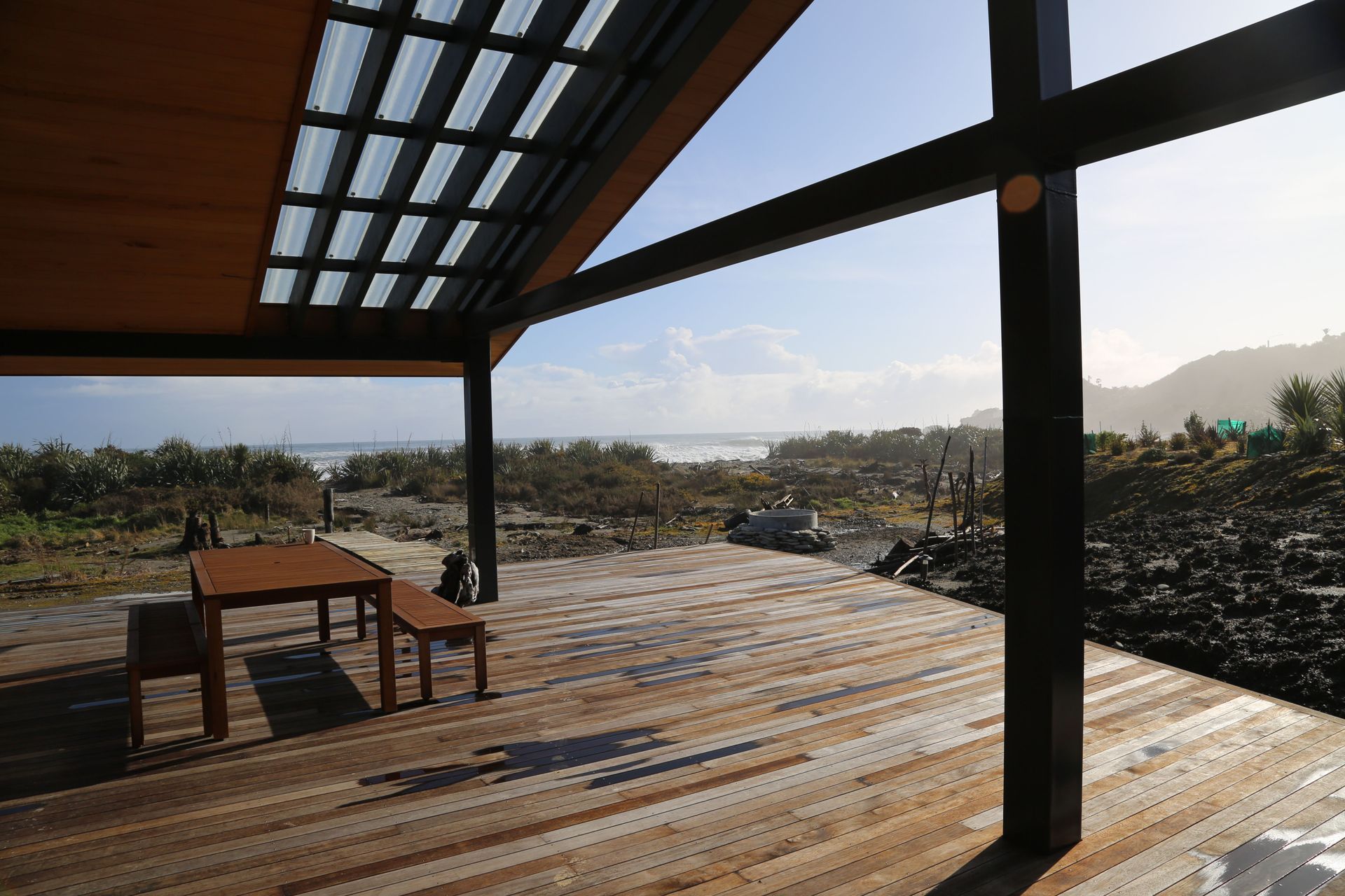 ArchiPro Project Summary - Unique trampers hut on the rugged West Coast, designed to harmonize with its dramatic surroundings and withstand natural elements, featuring a riverstone wall, hand-crafted door, and kahikatea T&G ceiling lining within a sturdy steel frame.