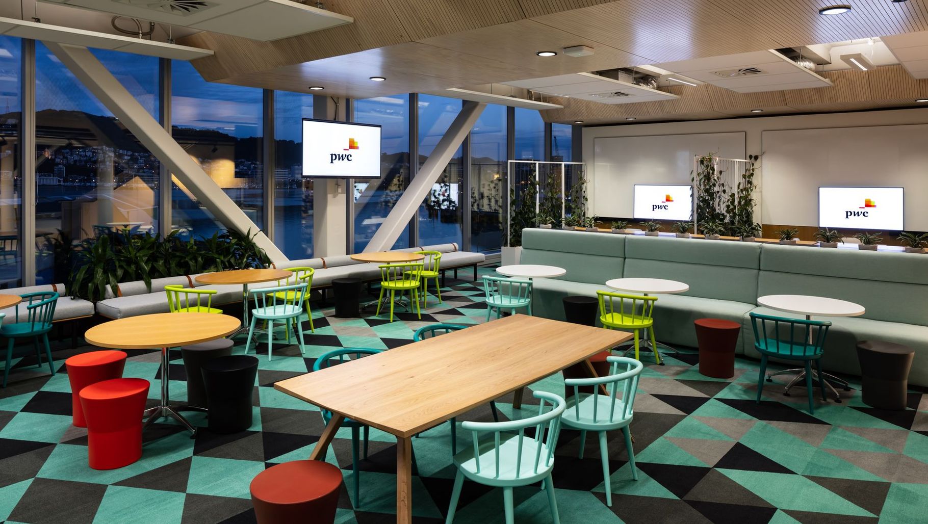 ArchiPro Project Summary - The PwC Wellington project features modern architecture, open workspaces, and sustainable practices, creating a collaborative environment for the financial services industry.