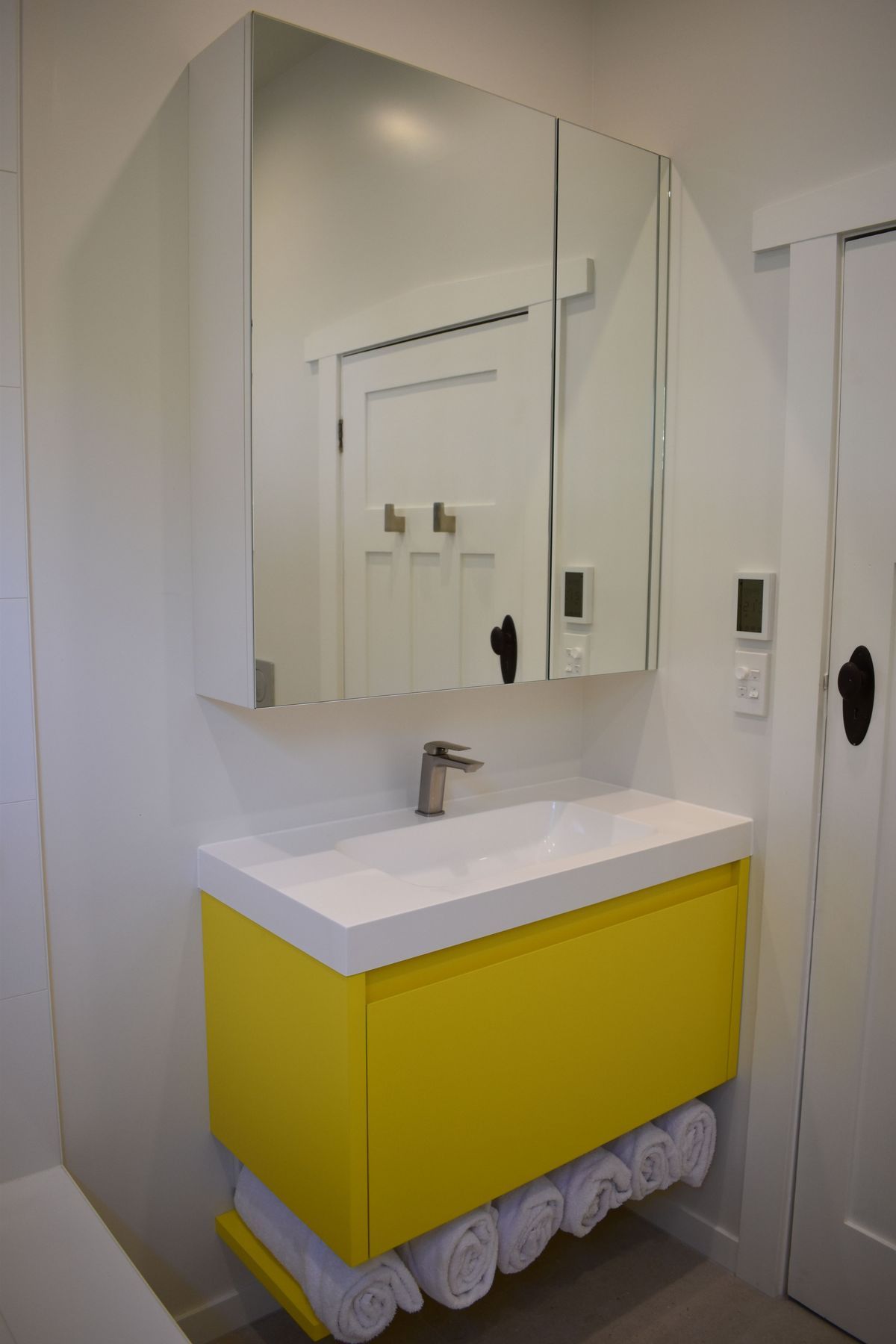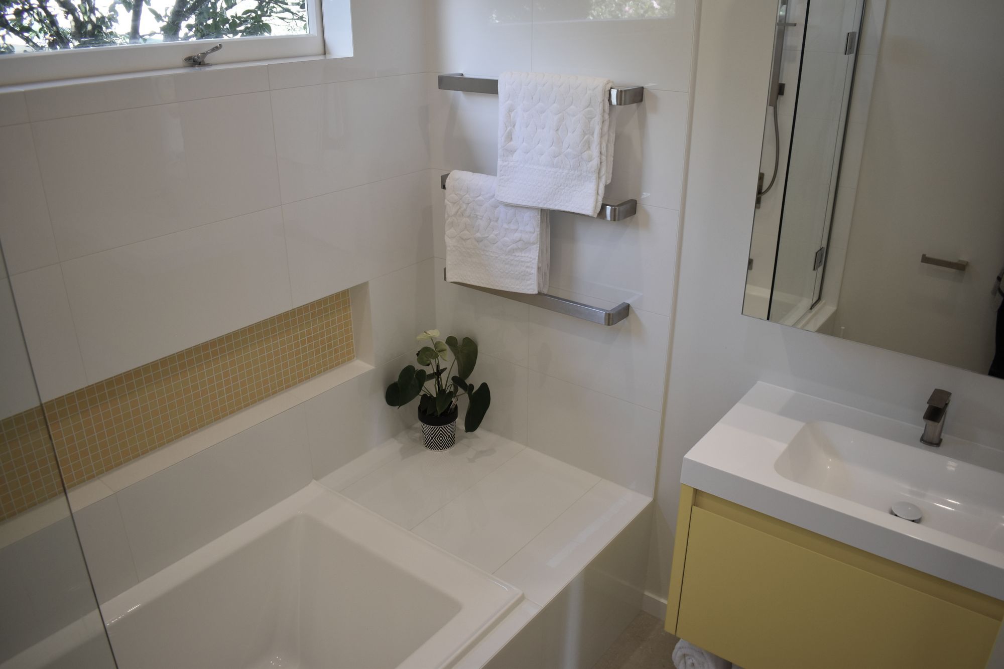 ArchiPro Project Summary - A vibrant and functional family bathroom in Northcote, featuring custom storage solutions, a stunning yellow mosaic, and a spacious layout that maximizes light and warmth for a family of three.