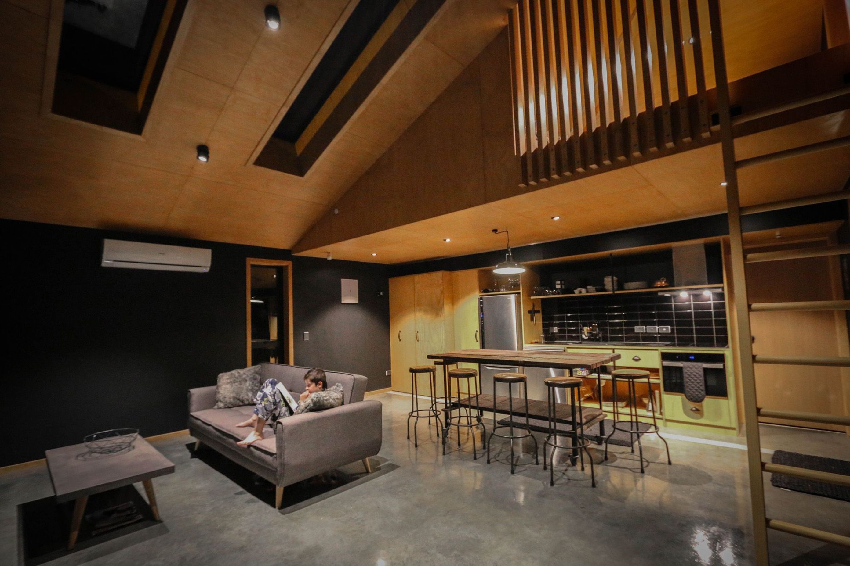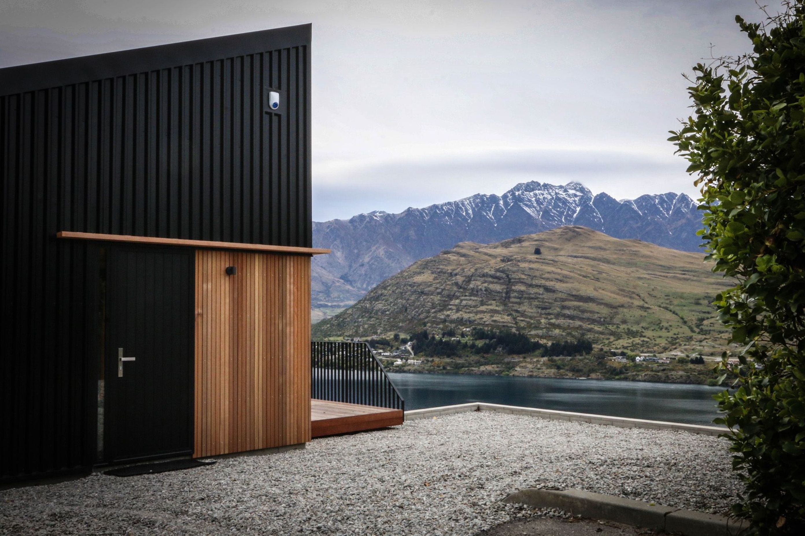 ArchiPro Project Summary - Larchwood Heights: A compact 80sqm holiday retreat featuring a striking black steel and cedar-clad exterior, designed for future conversion to a double car garage, with low-maintenance interiors and breathtaking views of the Remarkables and Frankton Arm.