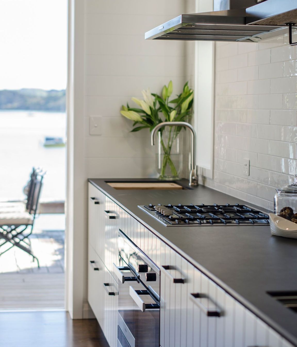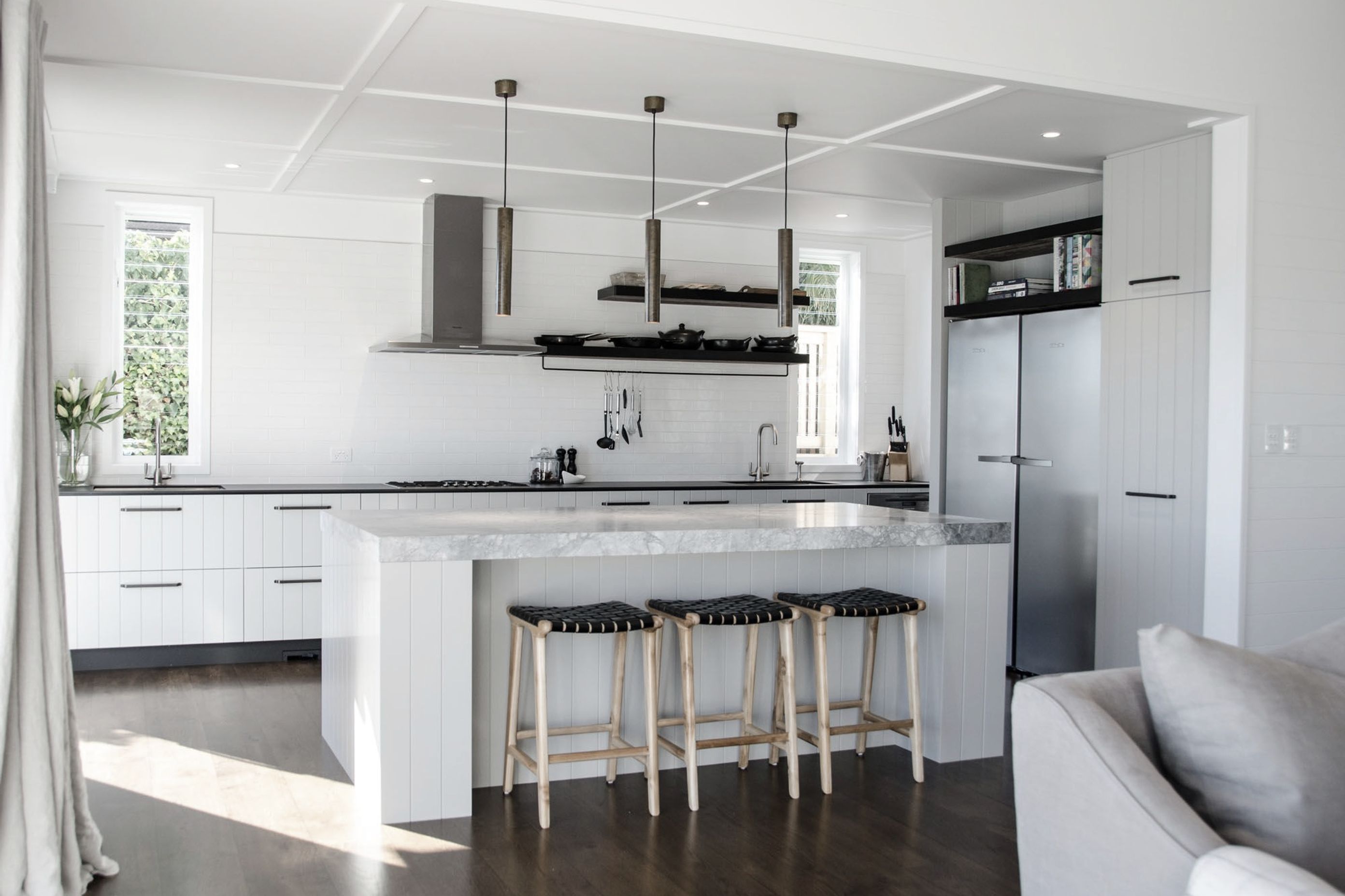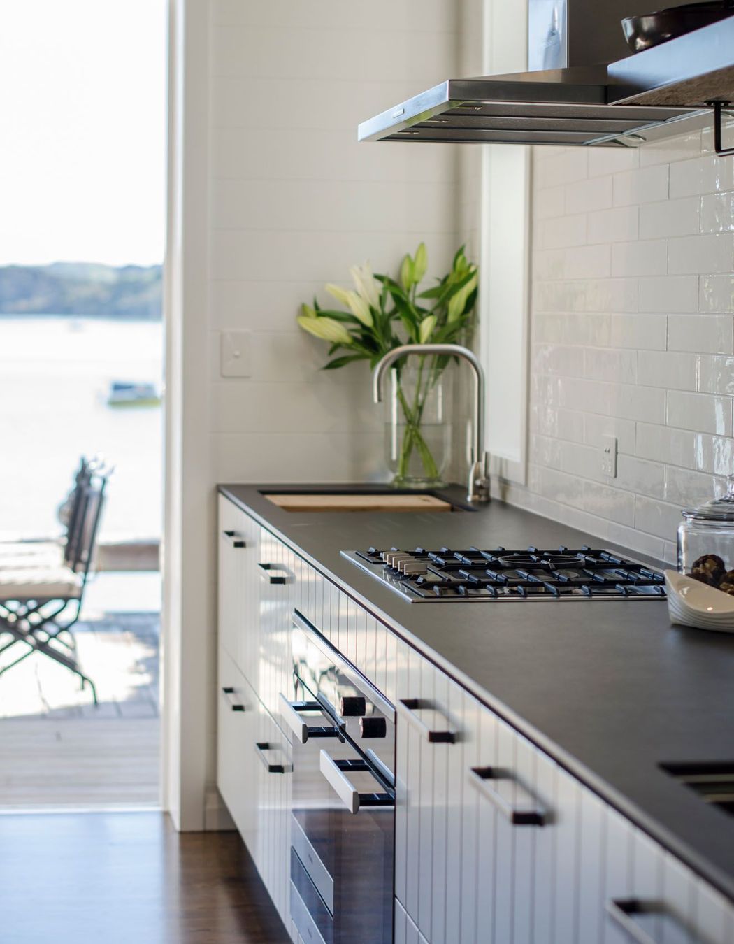 ArchiPro Project Summary - The Raglan Home project features a modern kitchen with elegant cabinetry, a striking countertop, and warm wood flooring, creating a welcoming environment for family and friends.