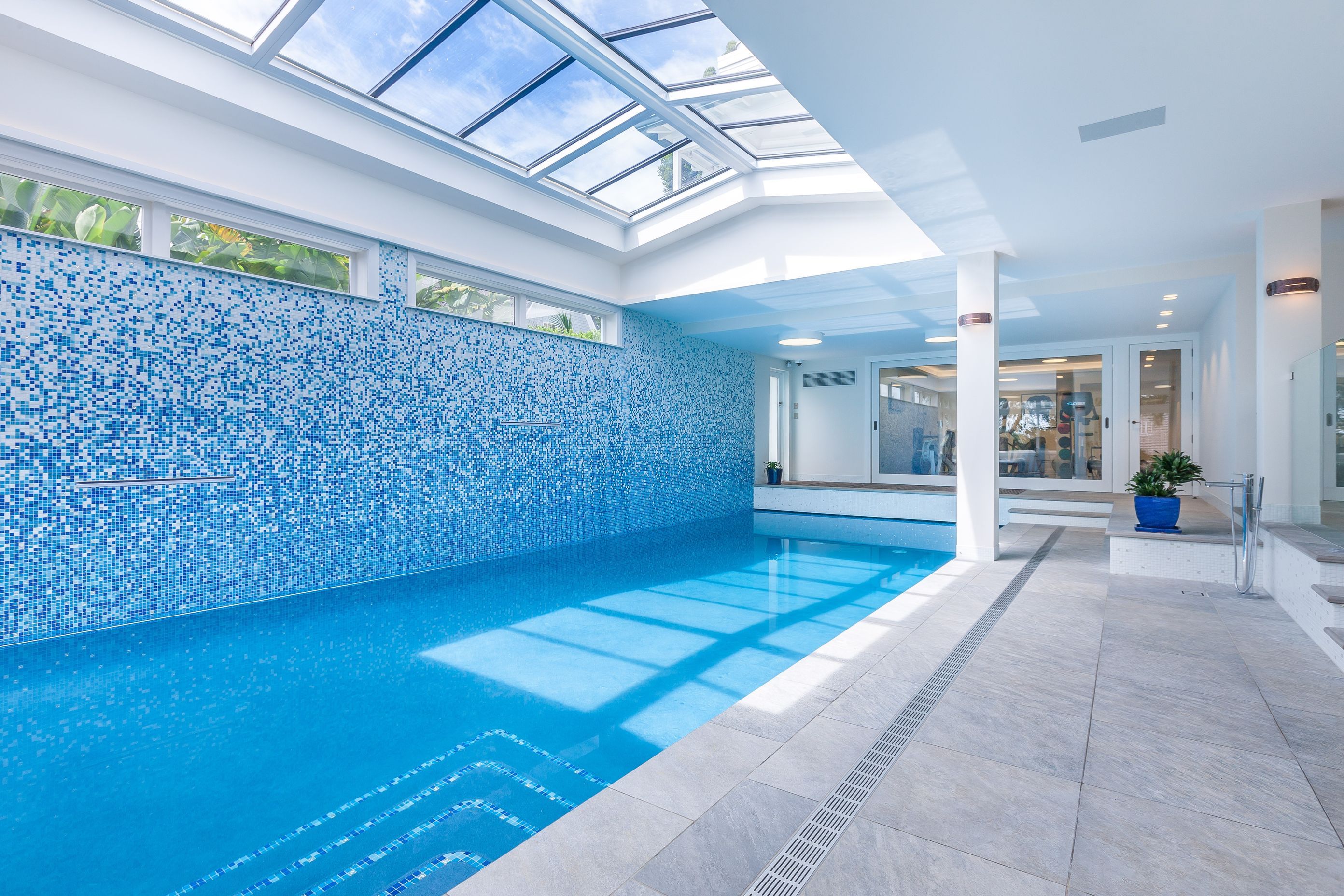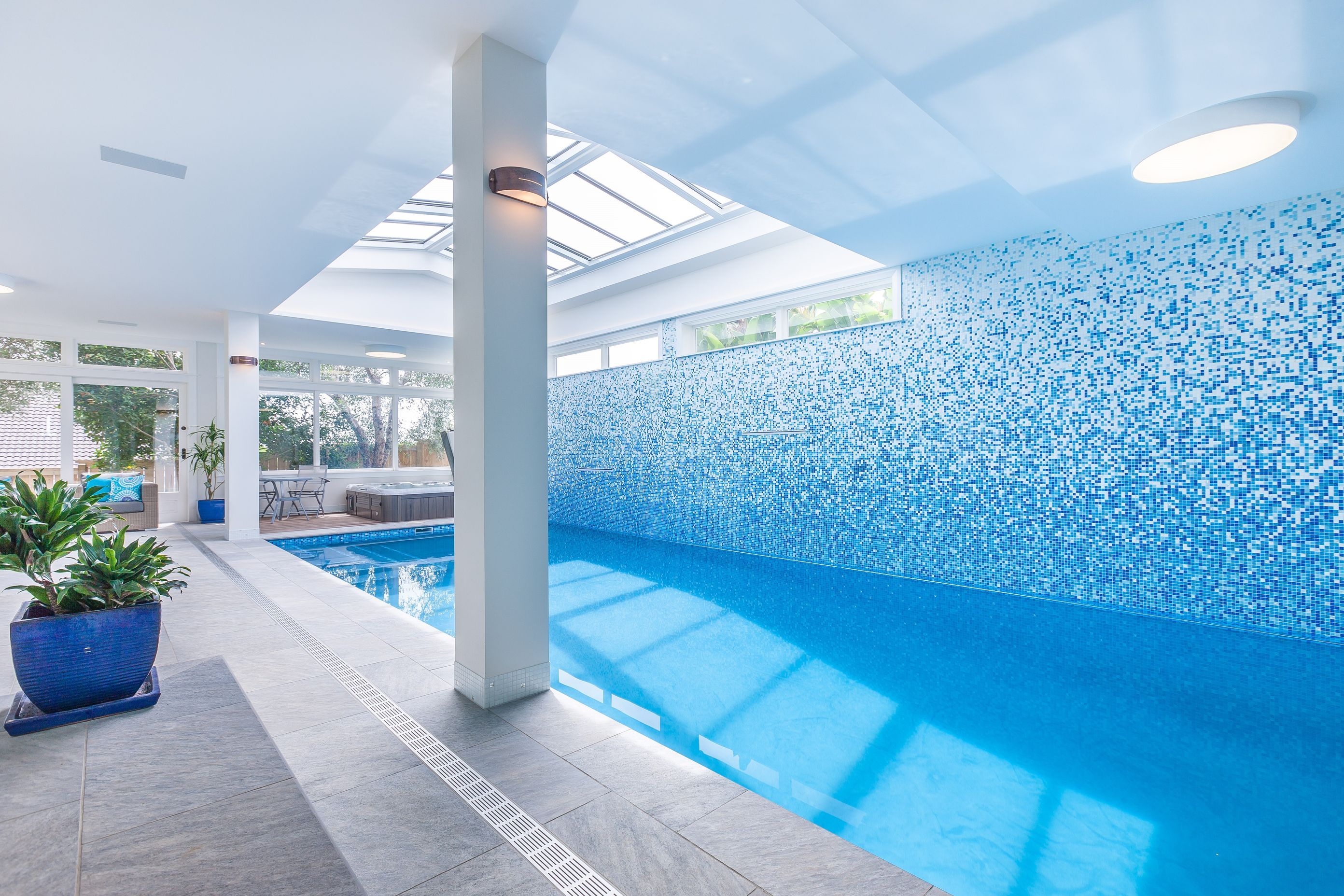 ArchiPro Project Summary - A stunning indoor pool project featuring a custom-built 10m x 5m pool, enclosed in a new pavilion, complemented by a sauna, gym, and steam room, showcasing efficient heating solutions and exquisite Bisazza tile work, completed in collaboration with Stephen Jones Architects.