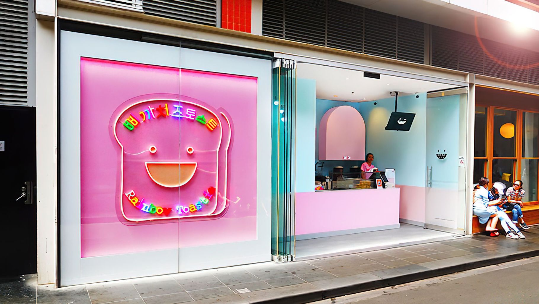 ArchiPro Project Summary - A whimsical and memorable 19 m² café space in Moone Ponds, Melbourne, featuring a delightful pastel pink and blue design that complements the adorable snack offerings at Rainbow Toastie.