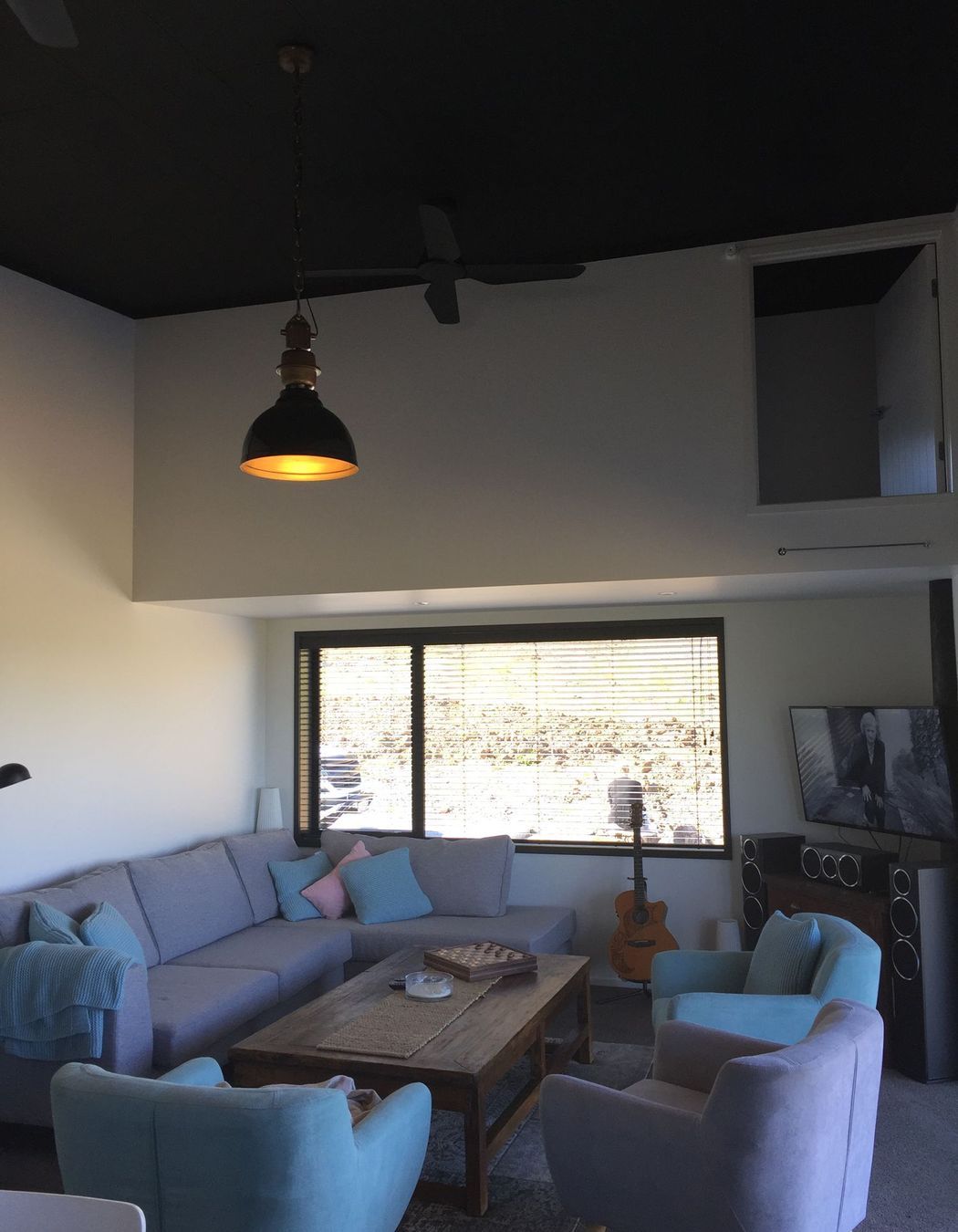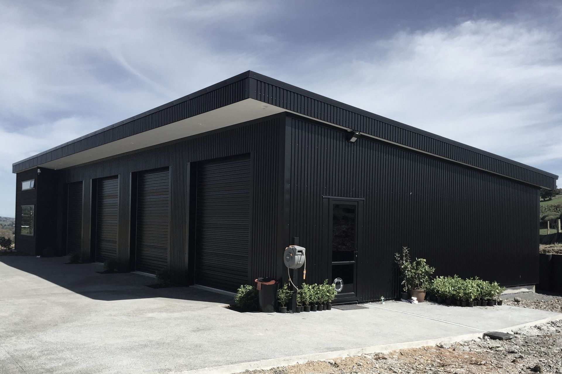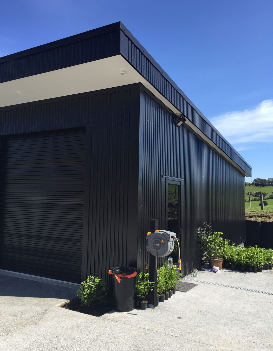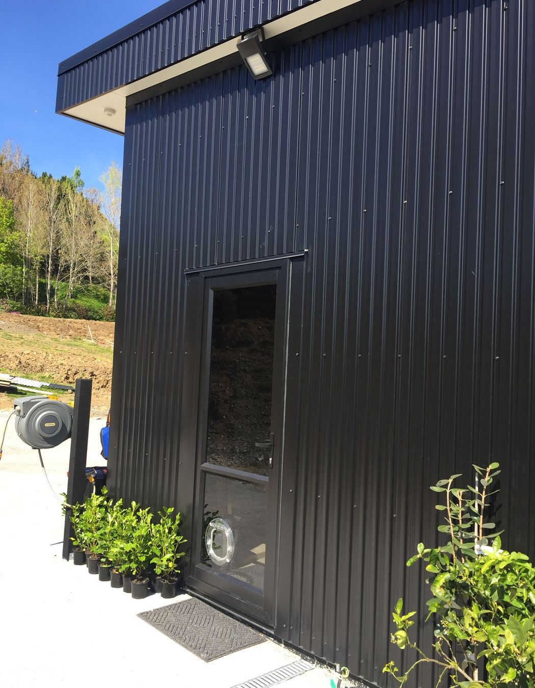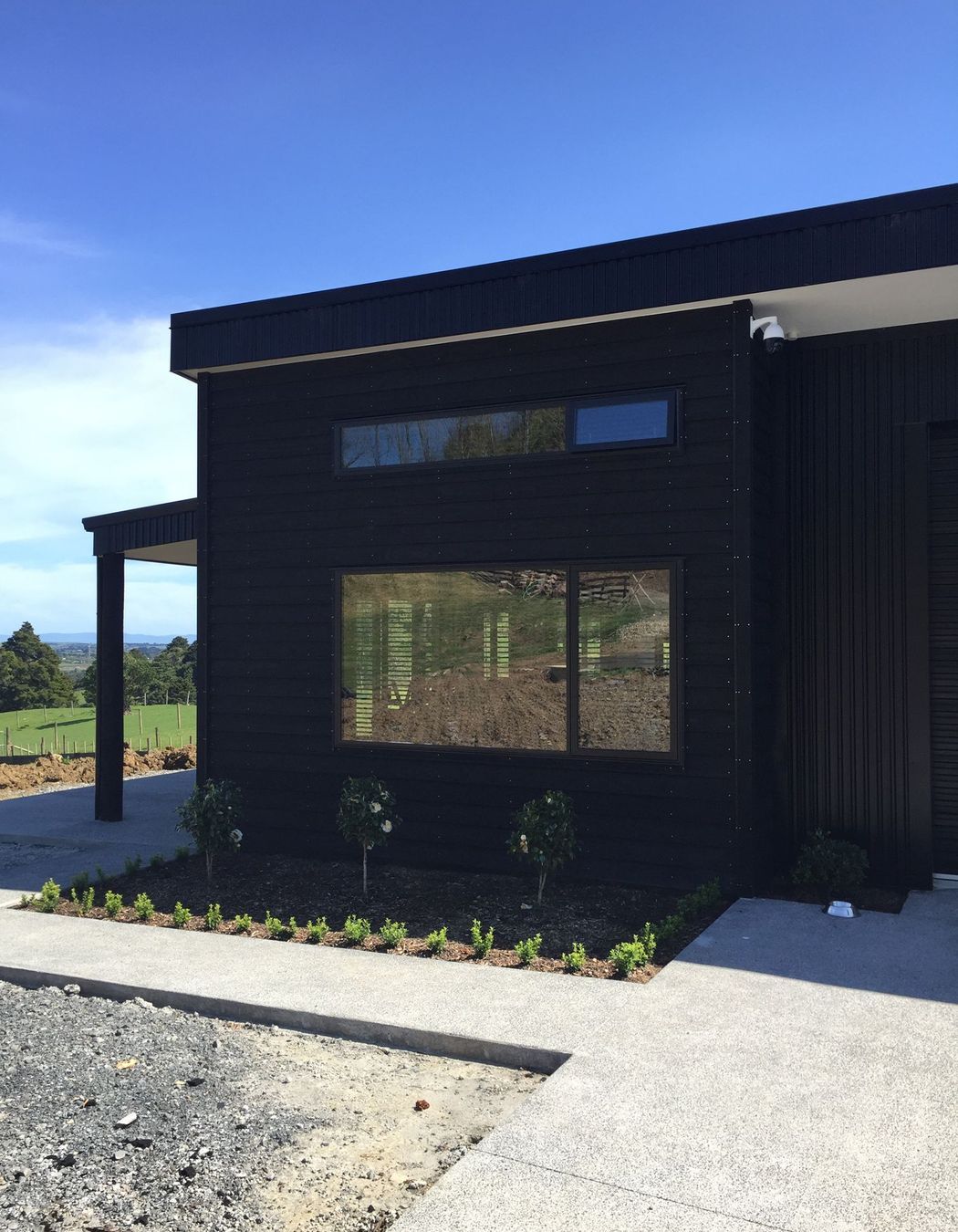 ArchiPro Project Summary - Custom-designed flat/mancave featuring a striking combination of black long run corrugated iron and Accoya weatherboard stained black.
