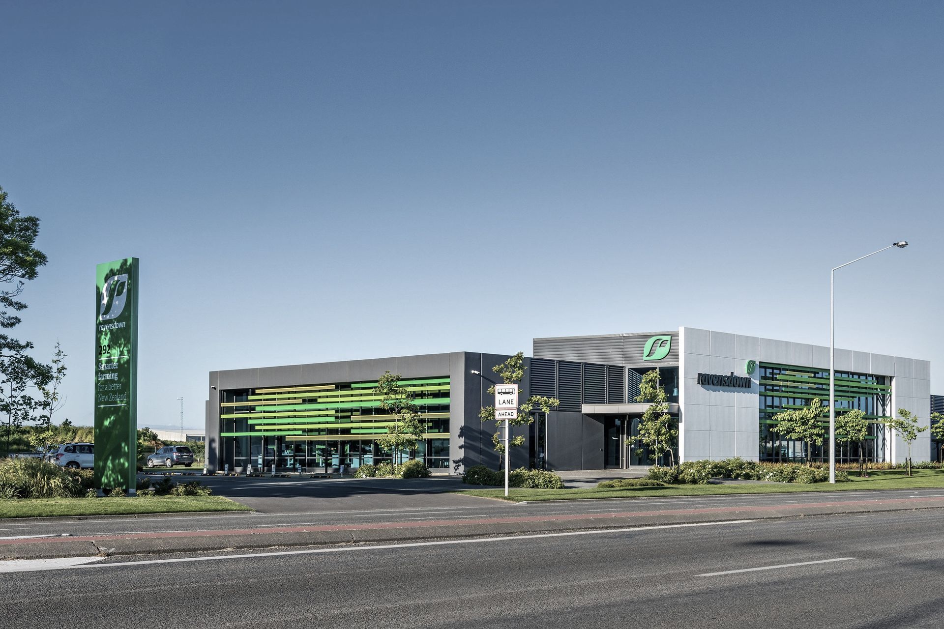 ArchiPro Project Summary - A vibrant headquarters for Ravensdown, designed to reflect their brand and values, featuring a T-shaped layout that emphasizes customer focus and incorporates organic imagery and materials to echo the essence of farming.
