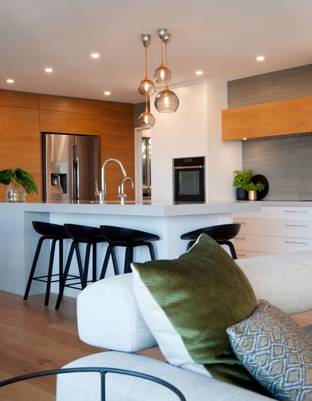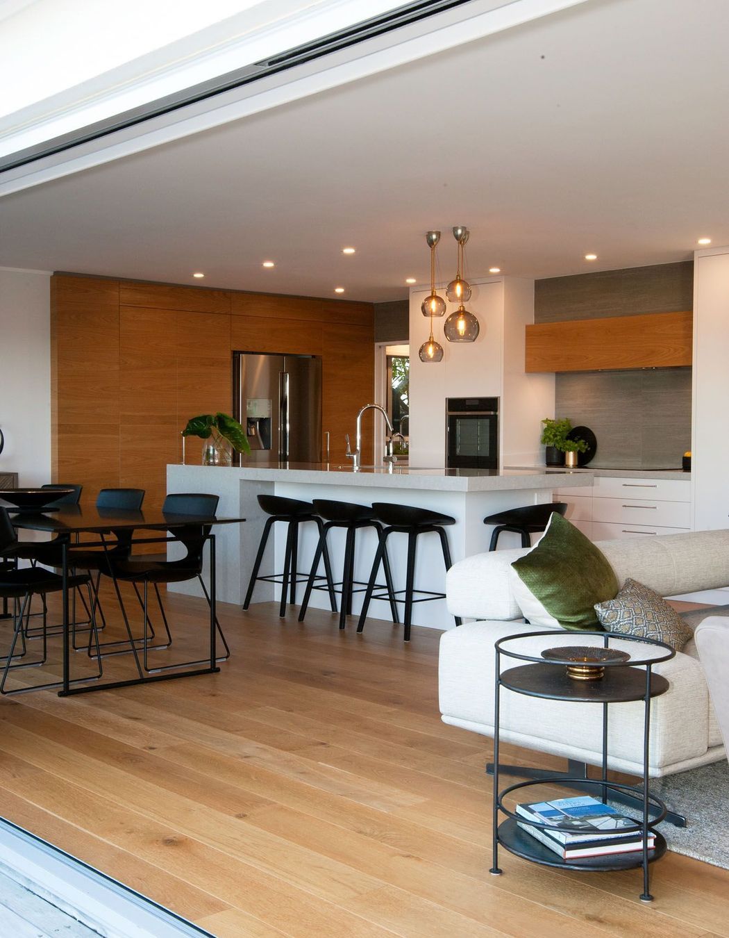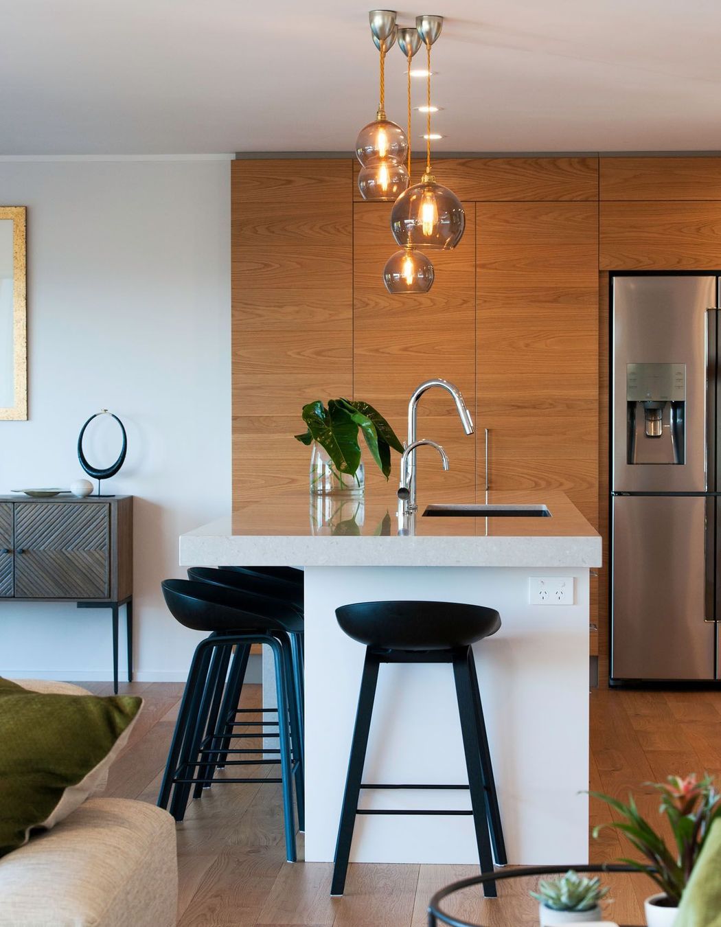 ArchiPro Project Summary - A warm and welcoming kitchen designed for entertaining, featuring a blend of oak timber veneer, quartz surfaces, and a dedicated drinks zone, all while embracing stunning ocean views.
