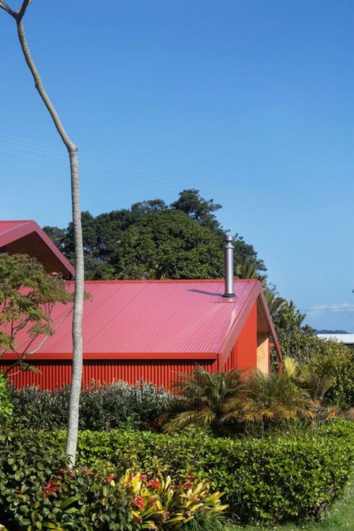 ArchiPro Project Summary - A contemporary bach on Tawharanui Peninsula, featuring distinct living and sleeping pavilions that echo rural vernacular, replacing an outdated cottage while honoring its heritage with a striking 'pioneer red' exterior against lush greenery.