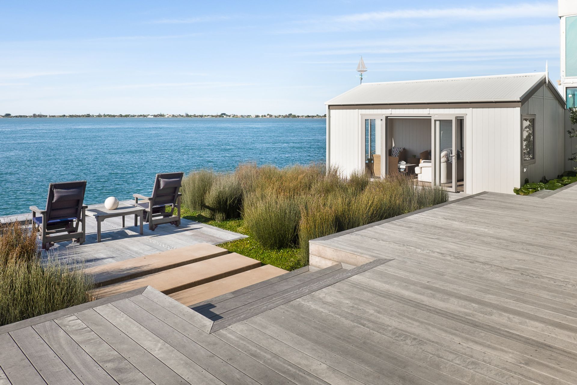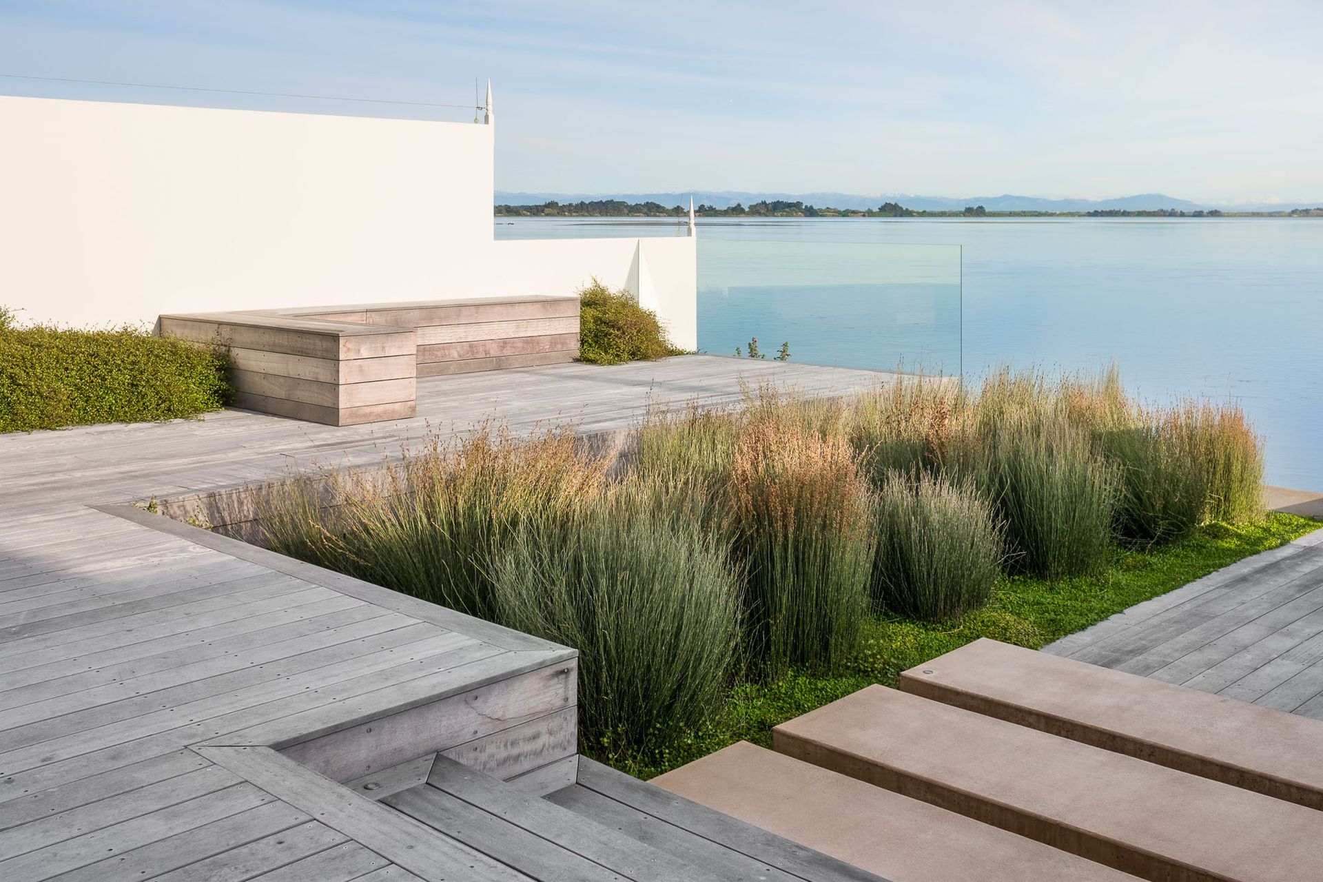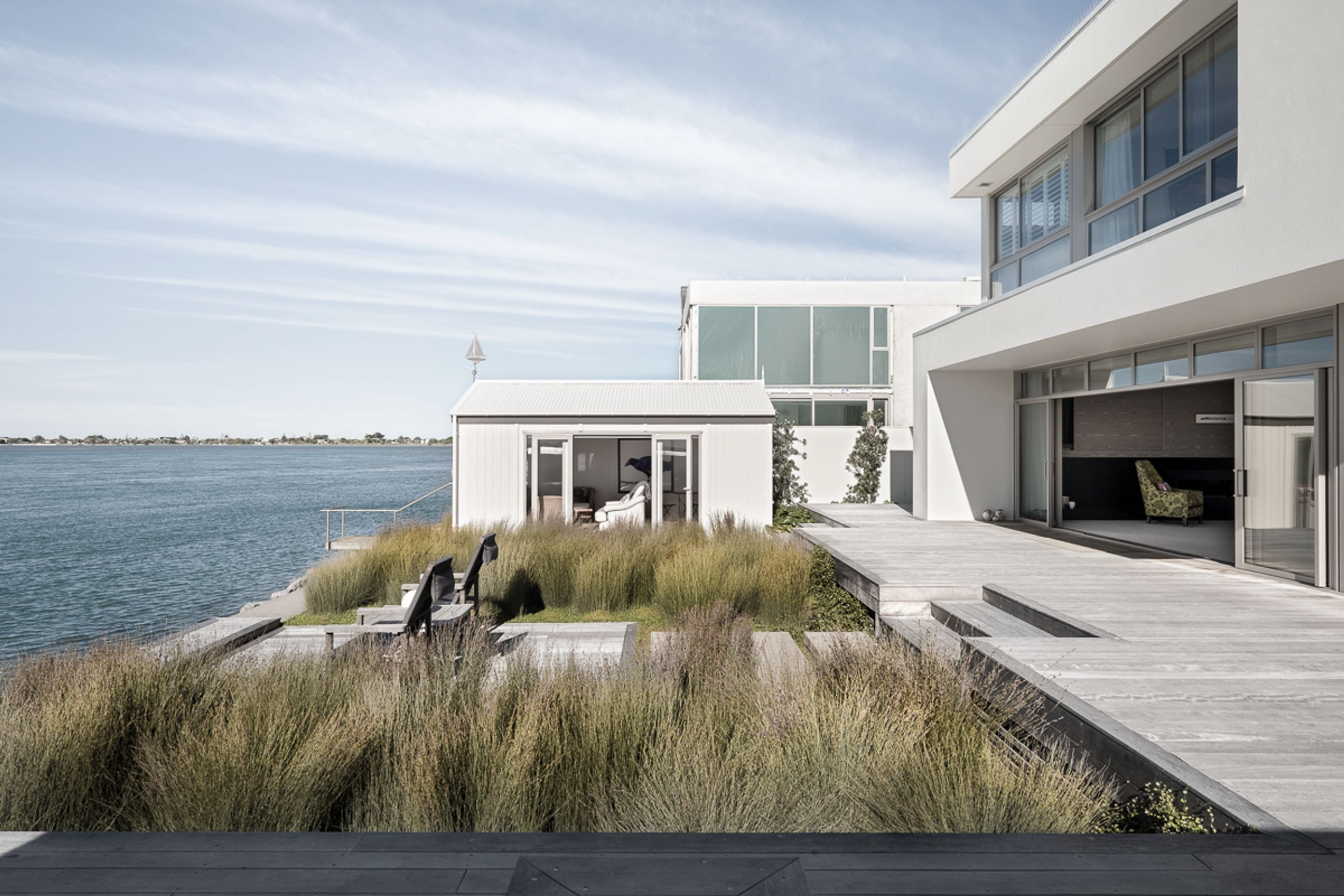 ArchiPro Project Summary - A waterfront residential landscape featuring expansive decks, stone walls, and a Summer House, designed for relaxation and entertainment, complemented by an outdoor fireplace and automated louvres, with planting by Henry Blakely Design.
