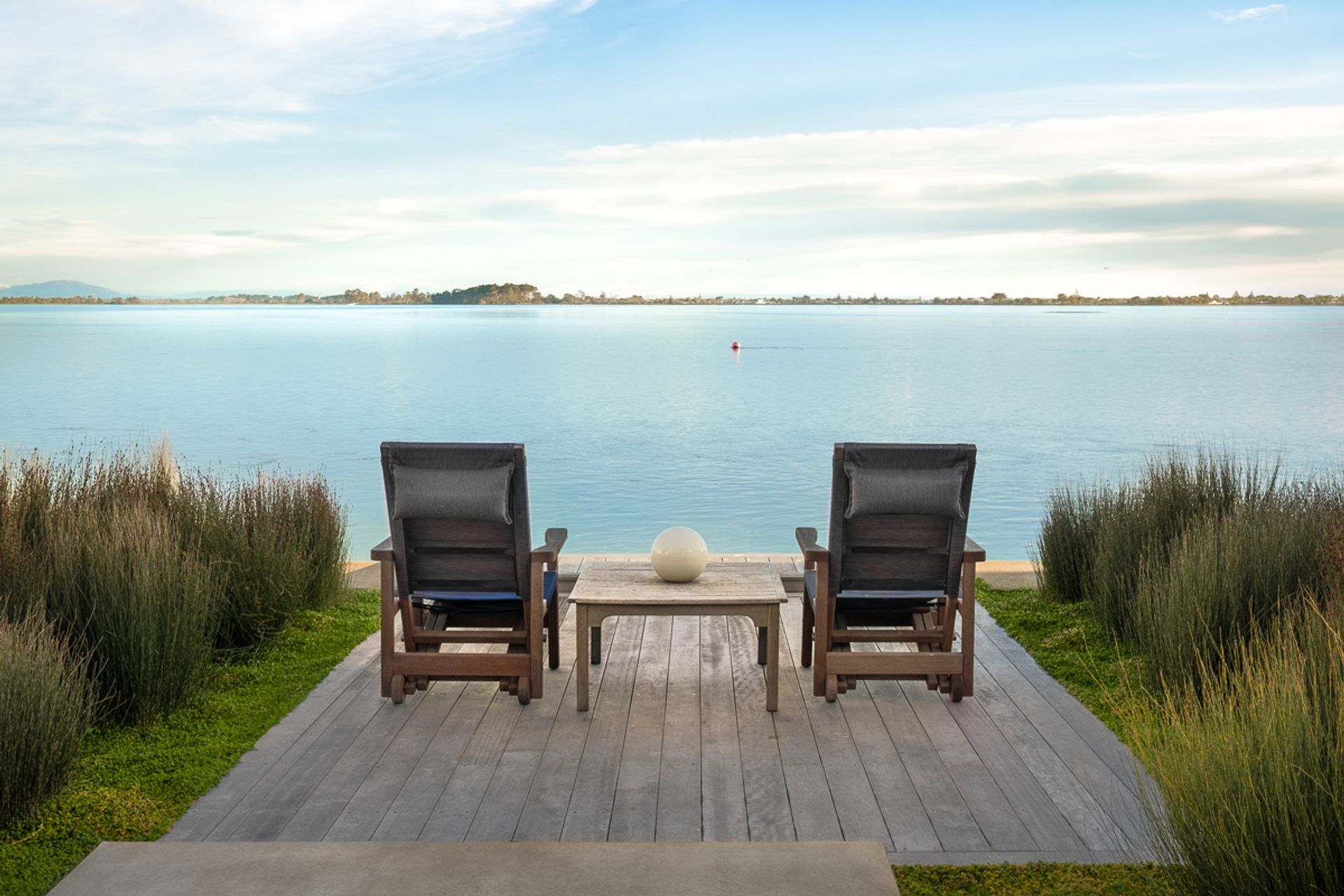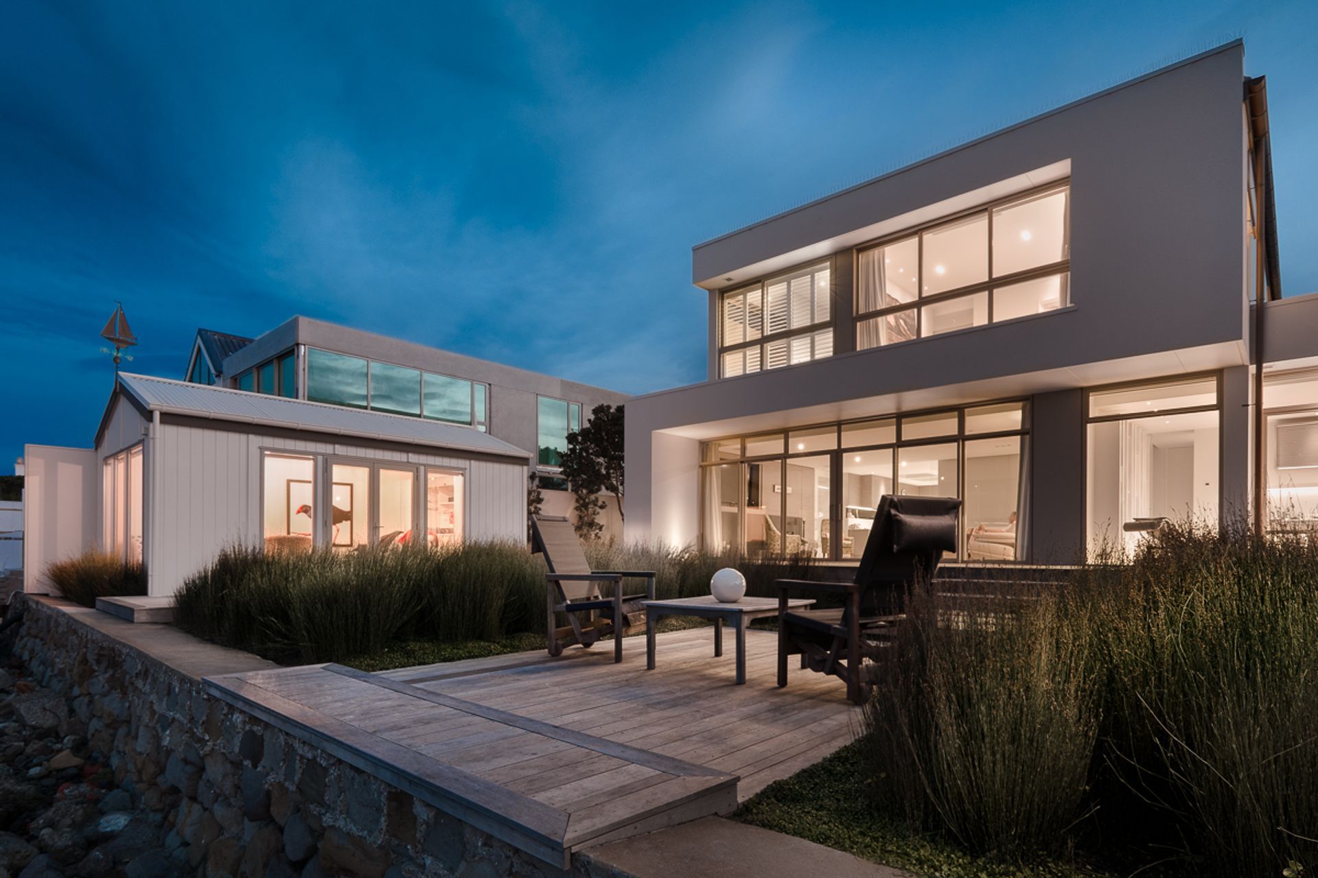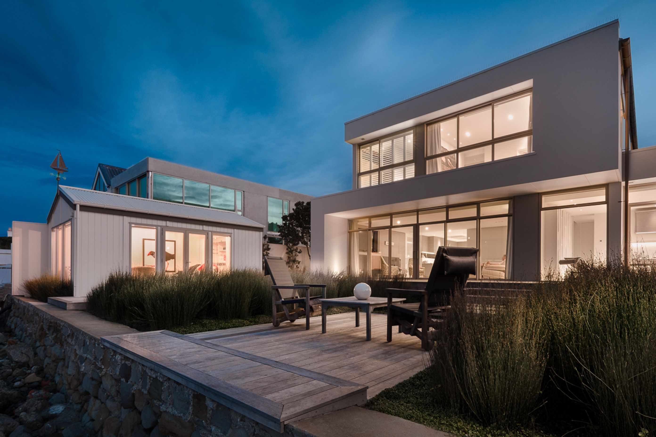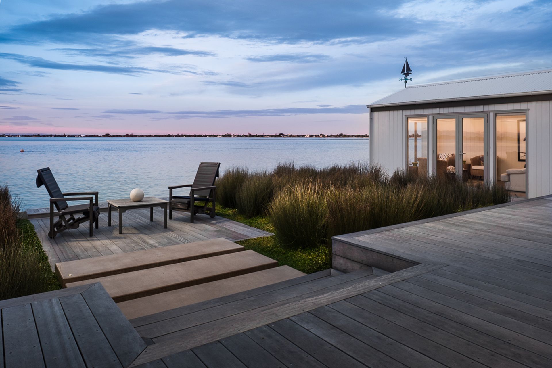 ArchiPro Project Summary - A waterfront residential landscape featuring expansive decks, stone walls, and a Summer House, designed for relaxation and entertainment, complemented by an outdoor fireplace and automated louvres, with planting by Henry Blakely Design.