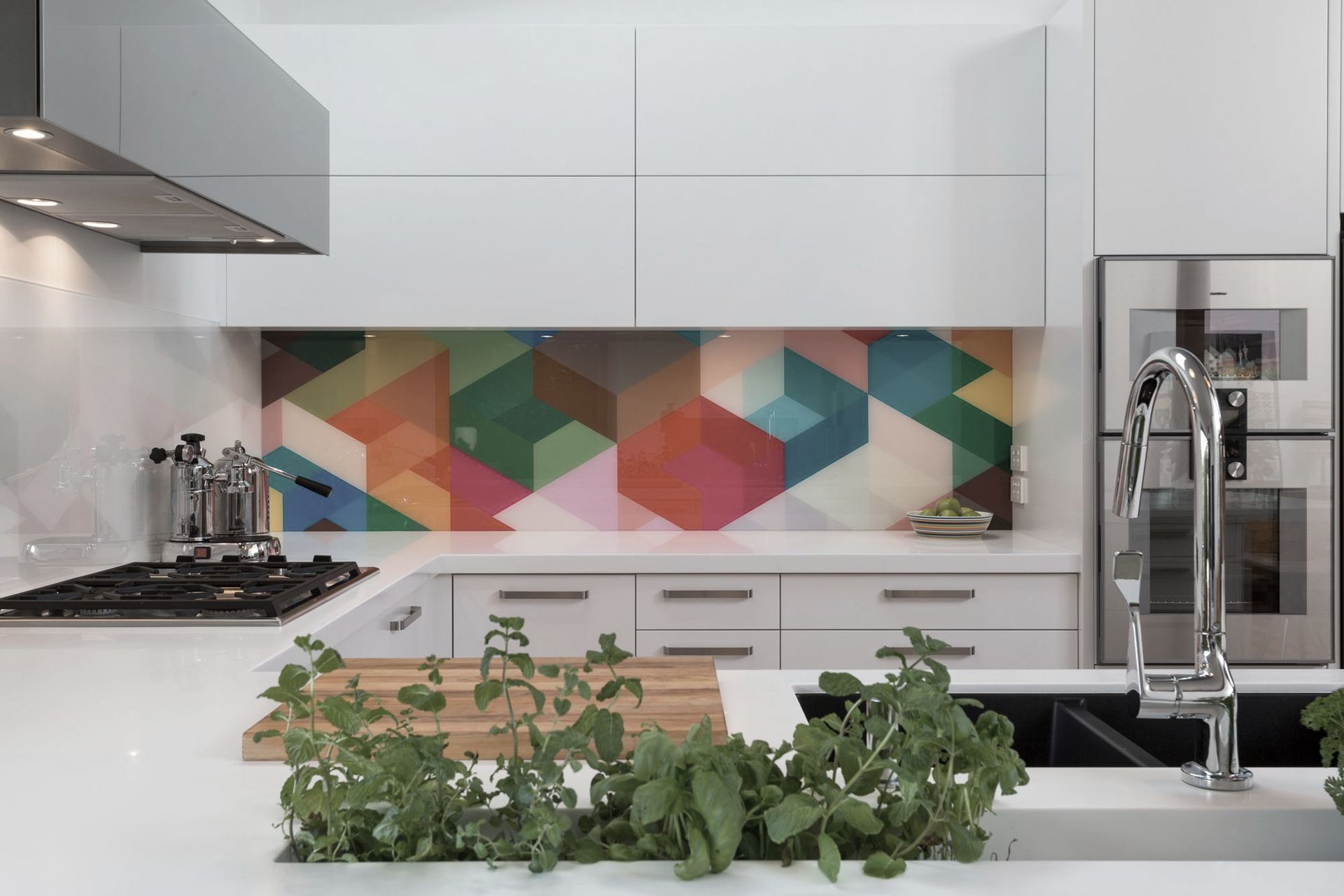 ArchiPro Project Summary - Innovative printed glass kitchen splashback featuring vibrant colors and a sleek, easy-to-clean surface, designed in collaboration with Image Glass to create a striking 3D box illusion through precise geometric manipulation.