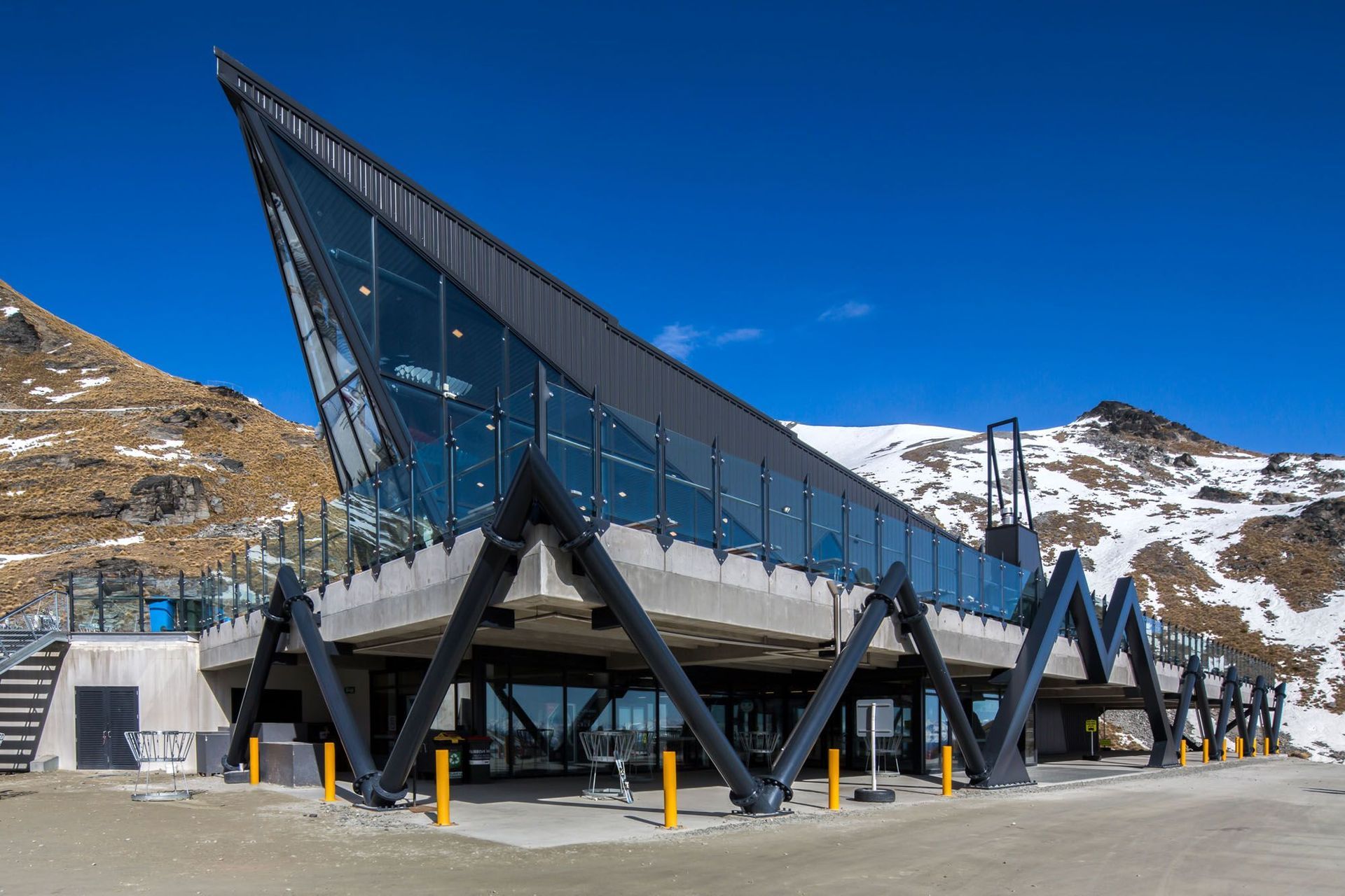 ArchiPro Project Summary - The Remarkables Base Building enhances the skiing experience with state-of-the-art amenities in a stunning mountainous landscape.