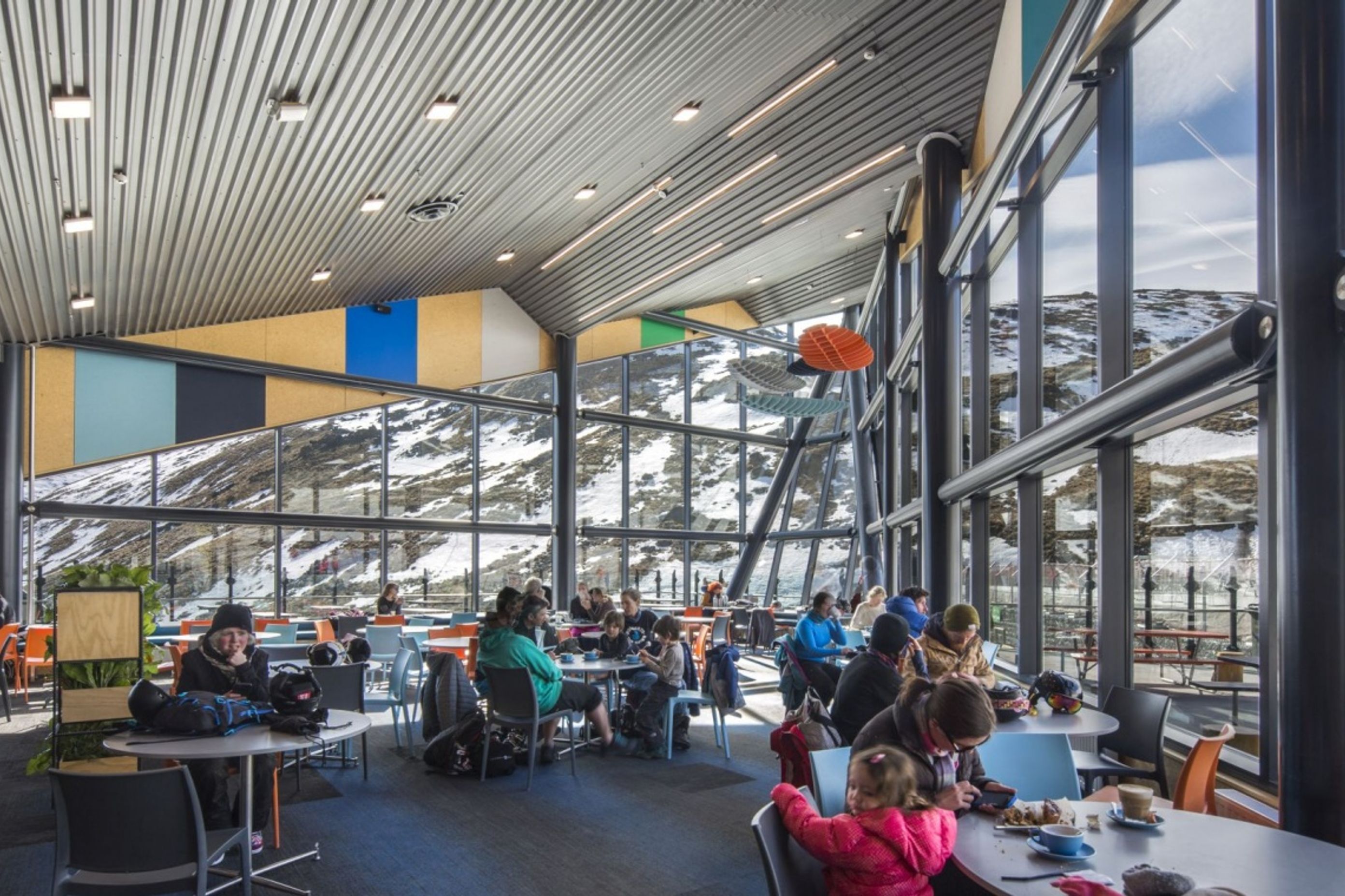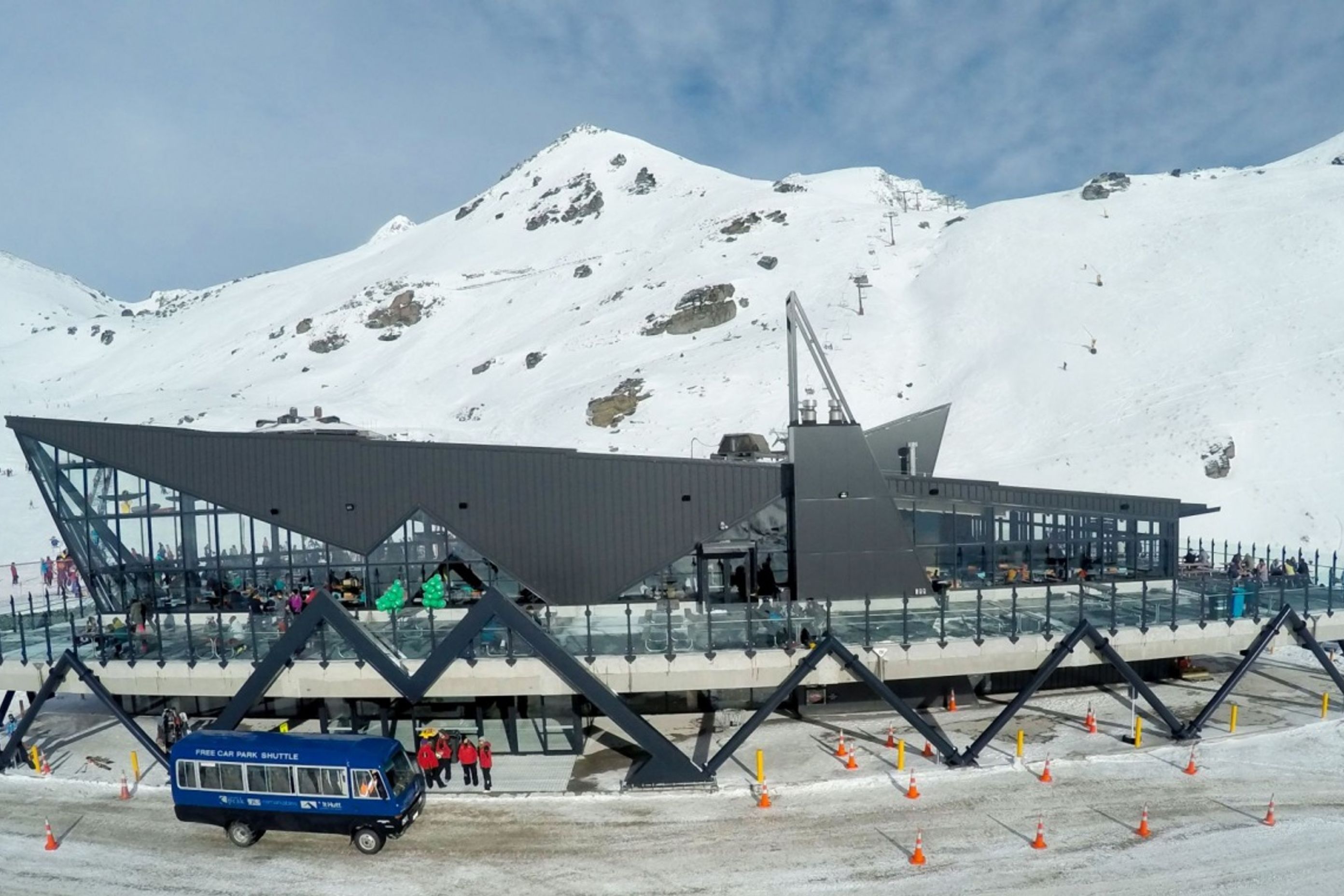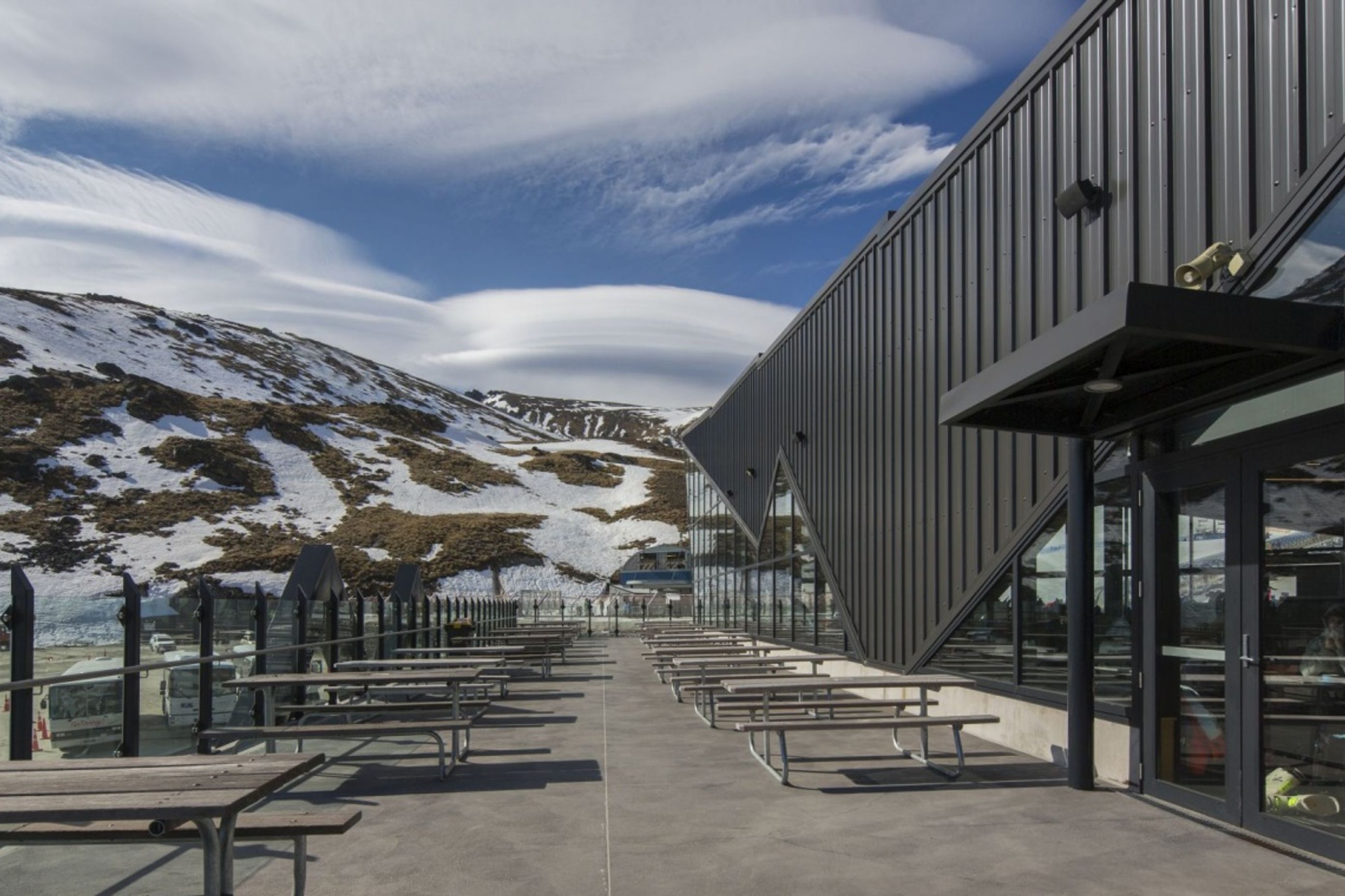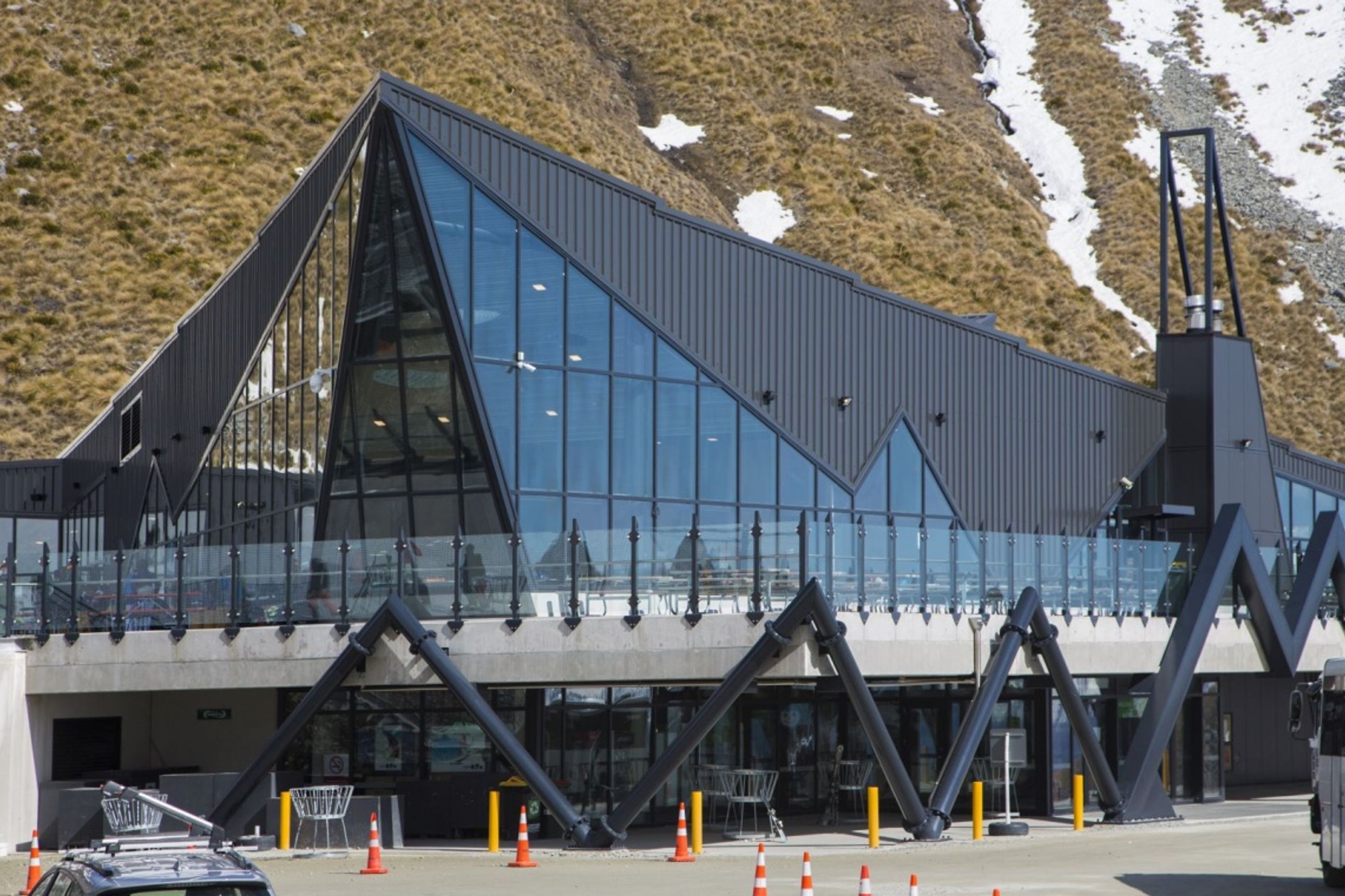 ArchiPro Project Summary - Remarkables Ski Field Base Building designed for efficient visitor flow, featuring a striking dark exterior reminiscent of a rock outcrop, with functional spaces for equipment rental, dining, and back-of-house operations, complemented by award-winning architectural elements.