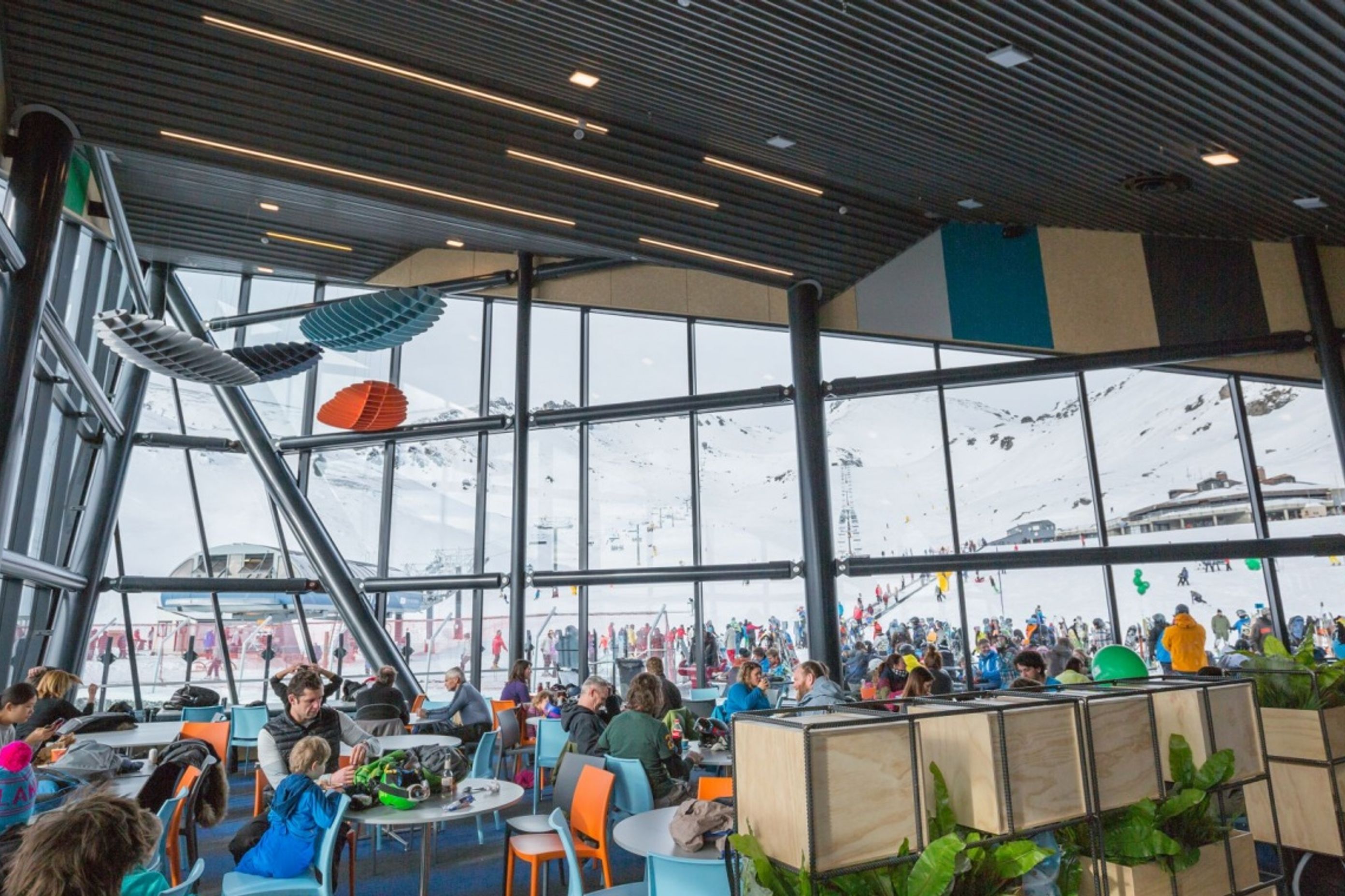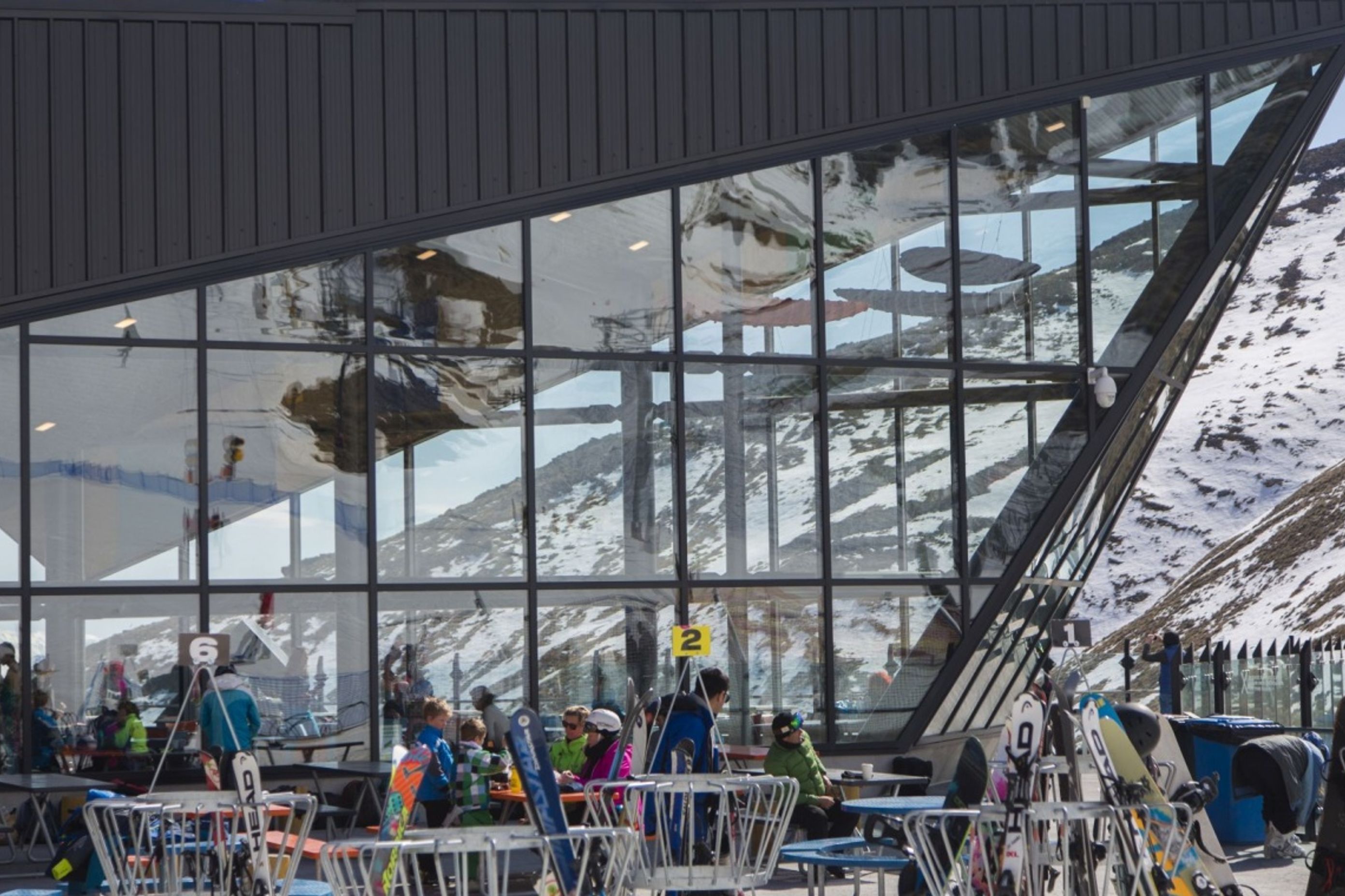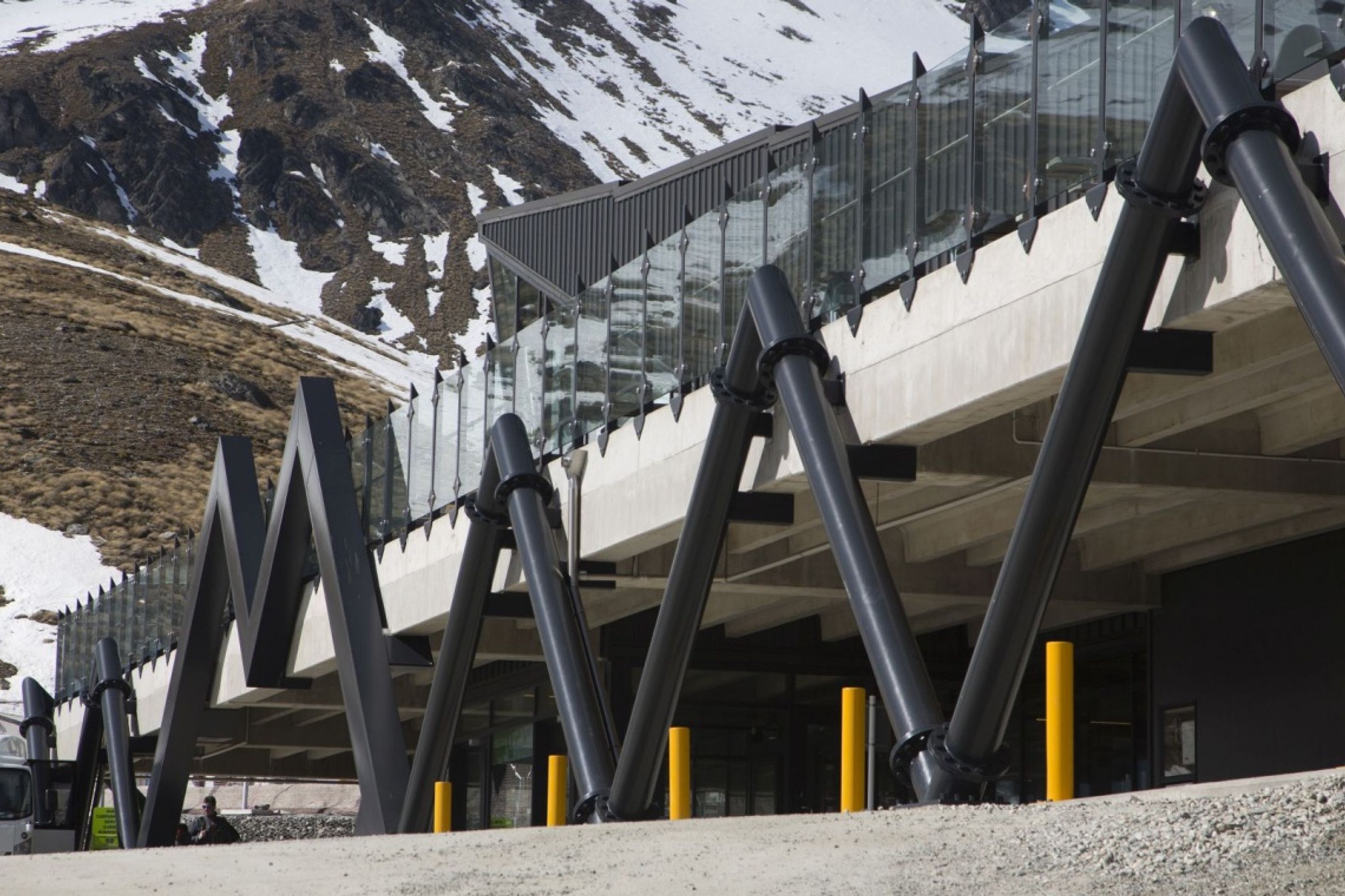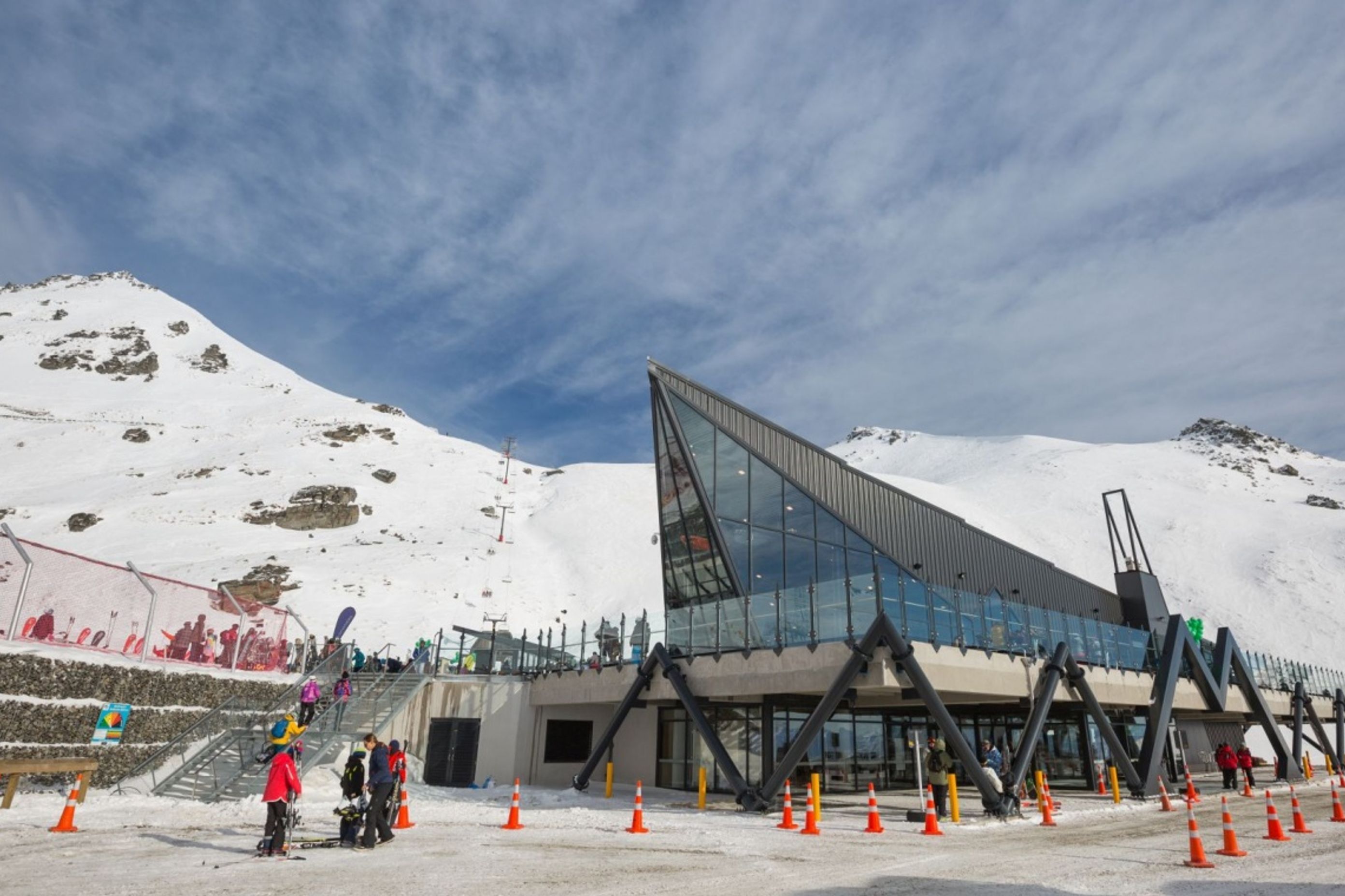 ArchiPro Project Summary - Remarkables Ski Field Base Building designed for efficient visitor flow, featuring a striking dark exterior reminiscent of a rock outcrop, with functional spaces for equipment rental, dining, and back-of-house operations, complemented by award-winning architectural elements.